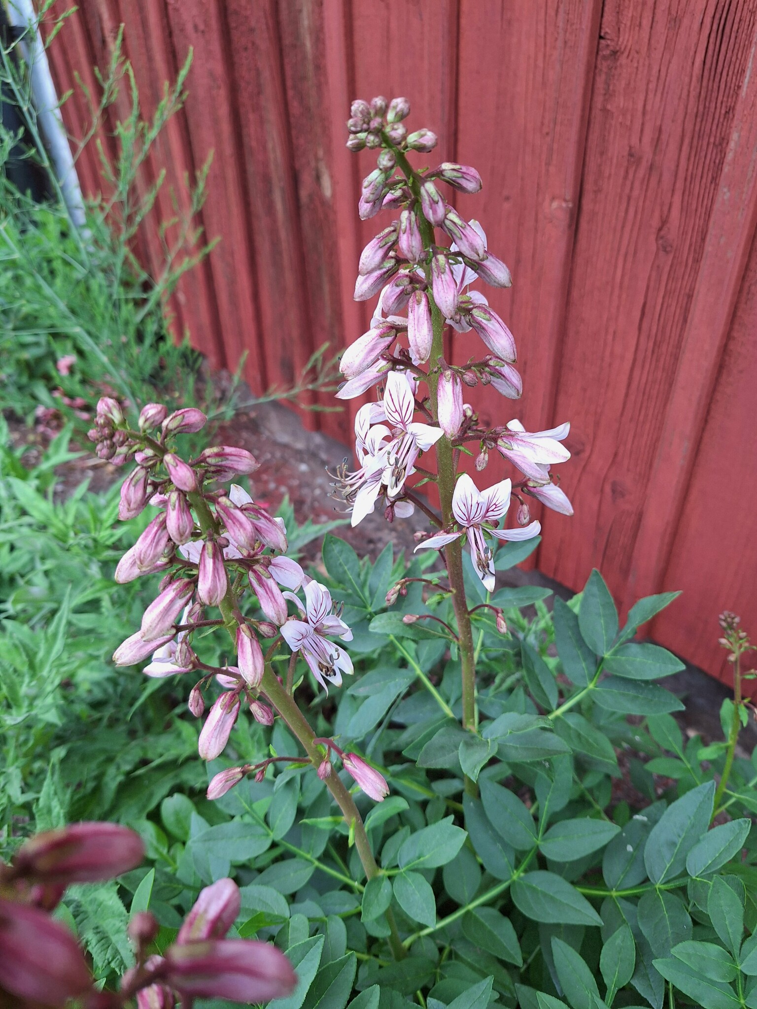 Rödmalva, självsått sig där den inte får vara (men där jag sådde/planterade den.. kommer den inte upp haha). Den bygger in en trapp.. så nu är den borttagen med undantag för nån planta som får sitta lite på sidan av "dörren"..