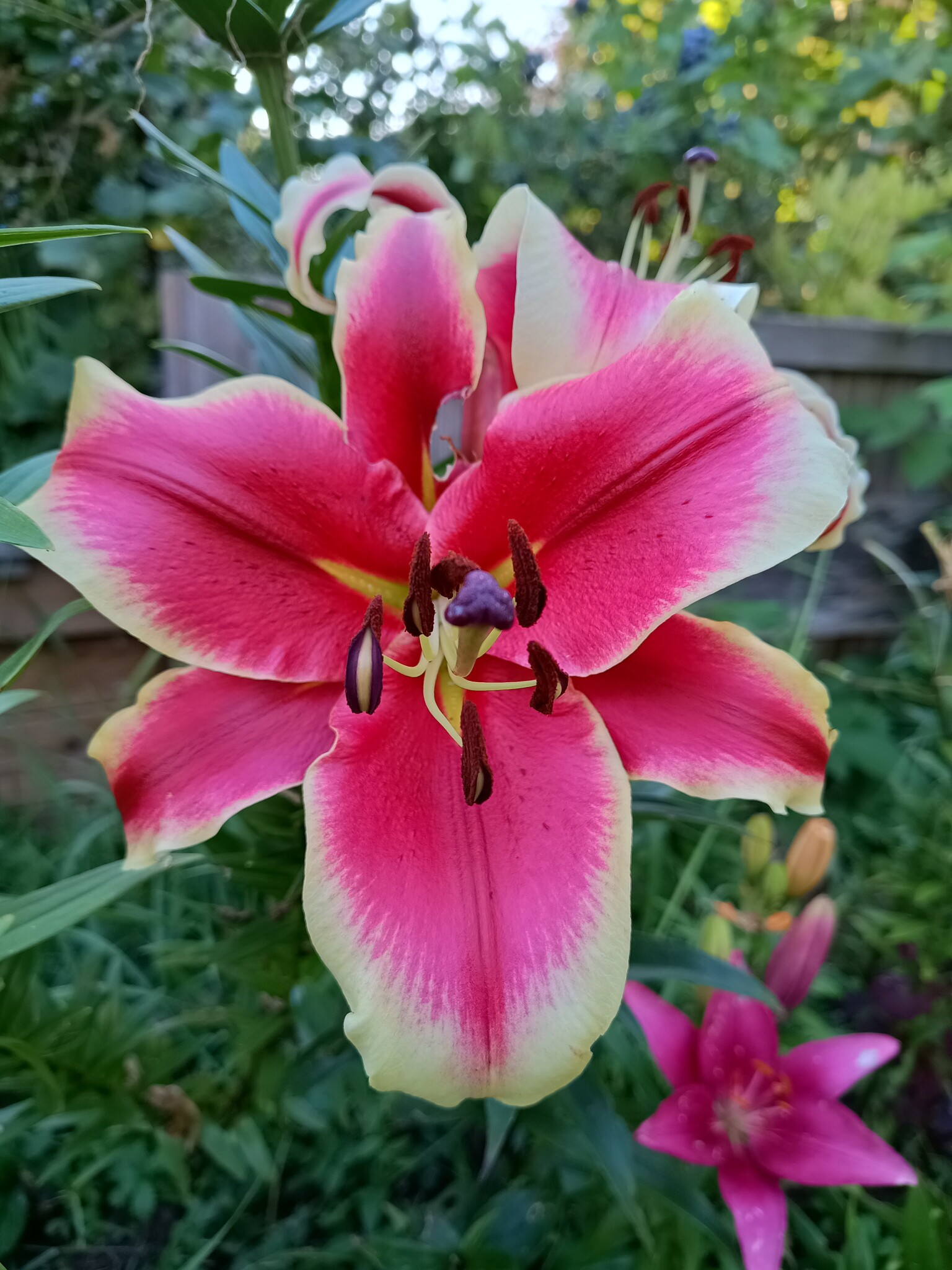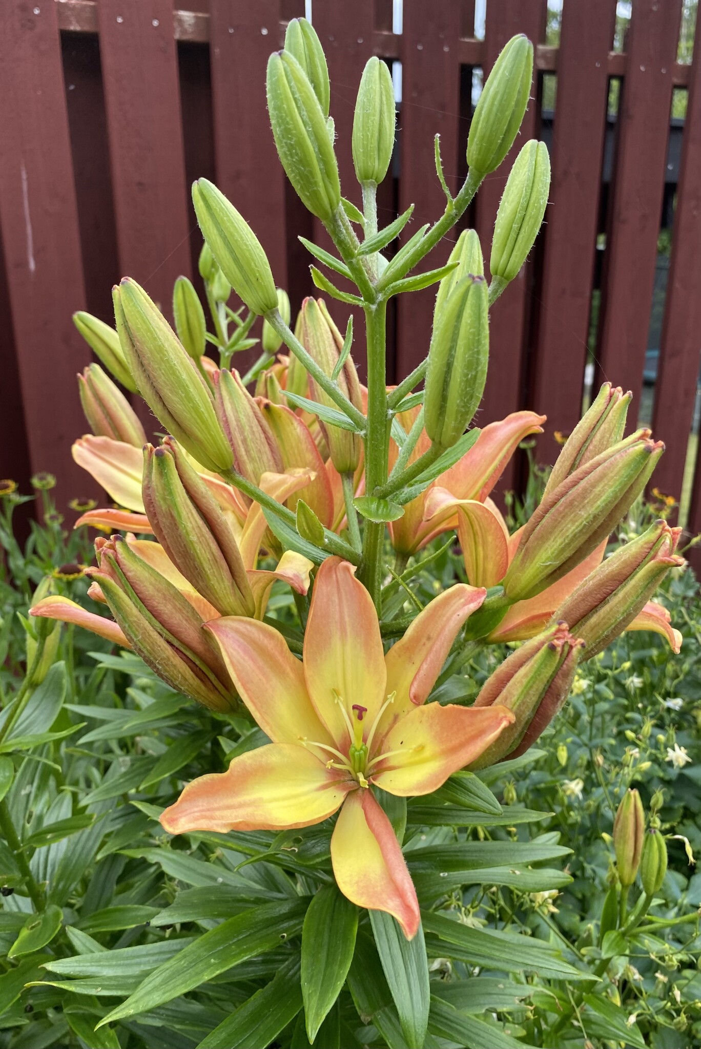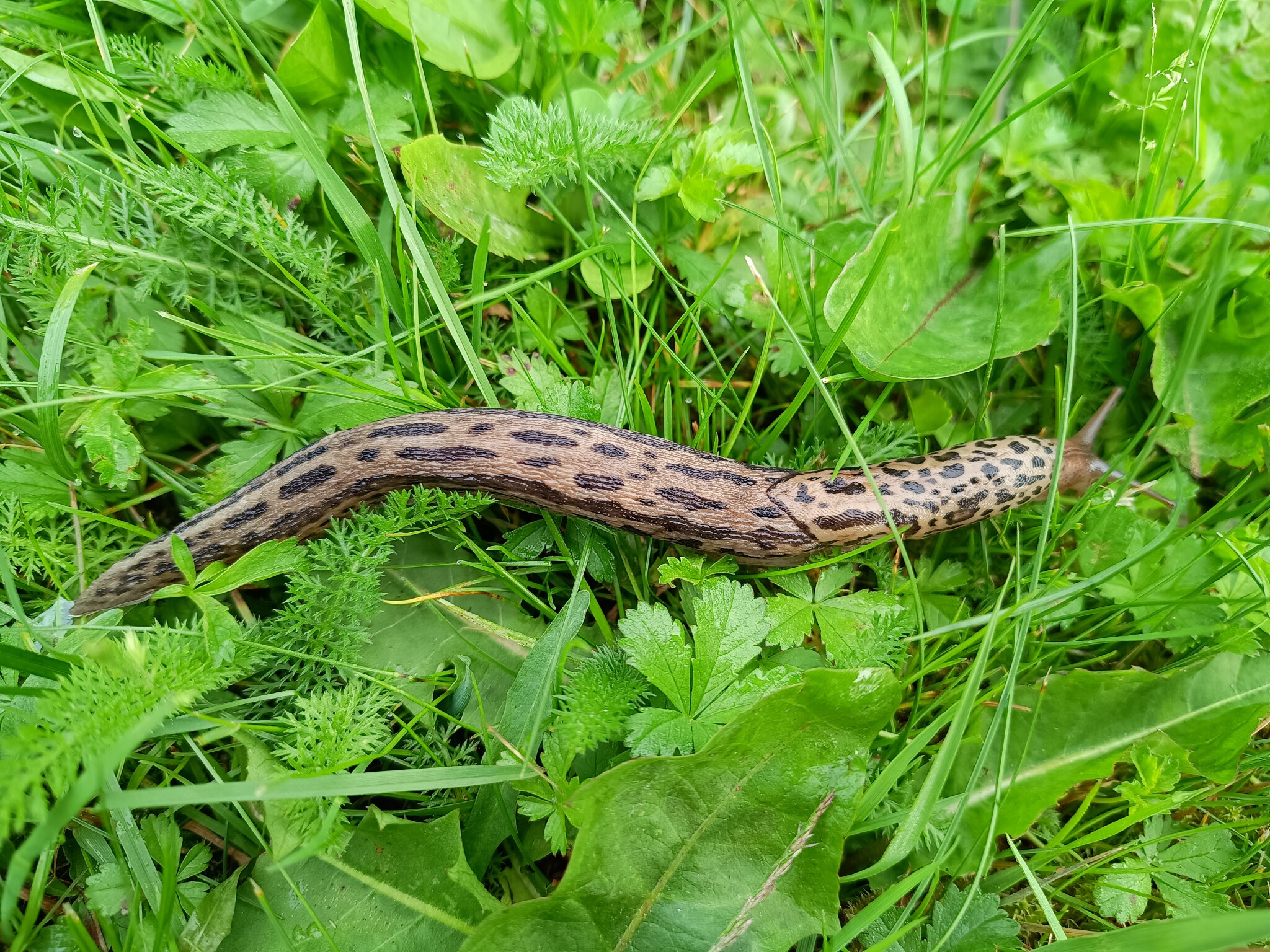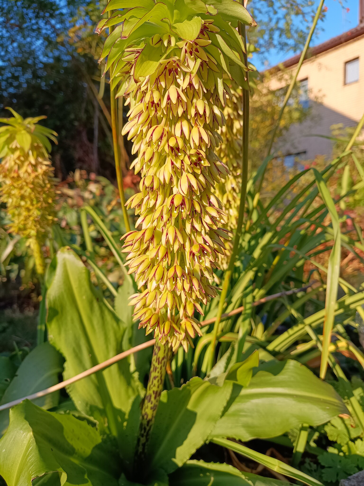 Eucomis en växt som ser nästan tropisk ut. Trivs bra i svenskt klimat men måste grävas upp för vinterförvaring. Sedan två liljor, i år har de fått vara ifred för liljebaggarna. Sist en pantersnigel, de ska vi vara rädda om. Det sägs ju att de tar mördarsniglar.