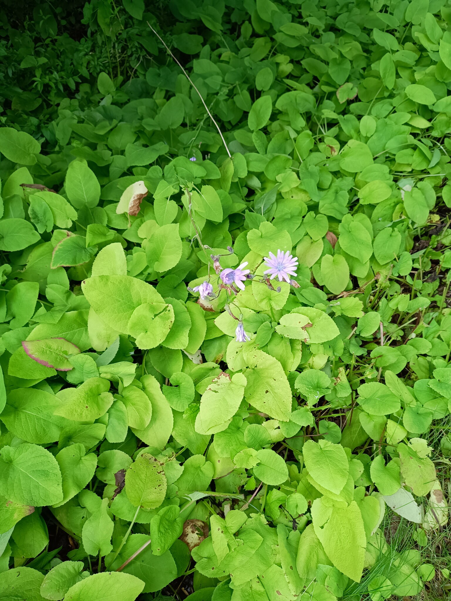 Den sista inte på min tomt men i grannskapet, en växt som får kirskål att framstå som trevlig. Ser ni den i trädgården så rensa bort den innan den tar över helt. De blå blommorna påminner om cikoria men där slutar likheten. Växten kommer ursprungligen från Ryssland och där hålls den i schack men här sprider den sig ohämmat och koloniserar hela trädgården om den får vara ostörd.