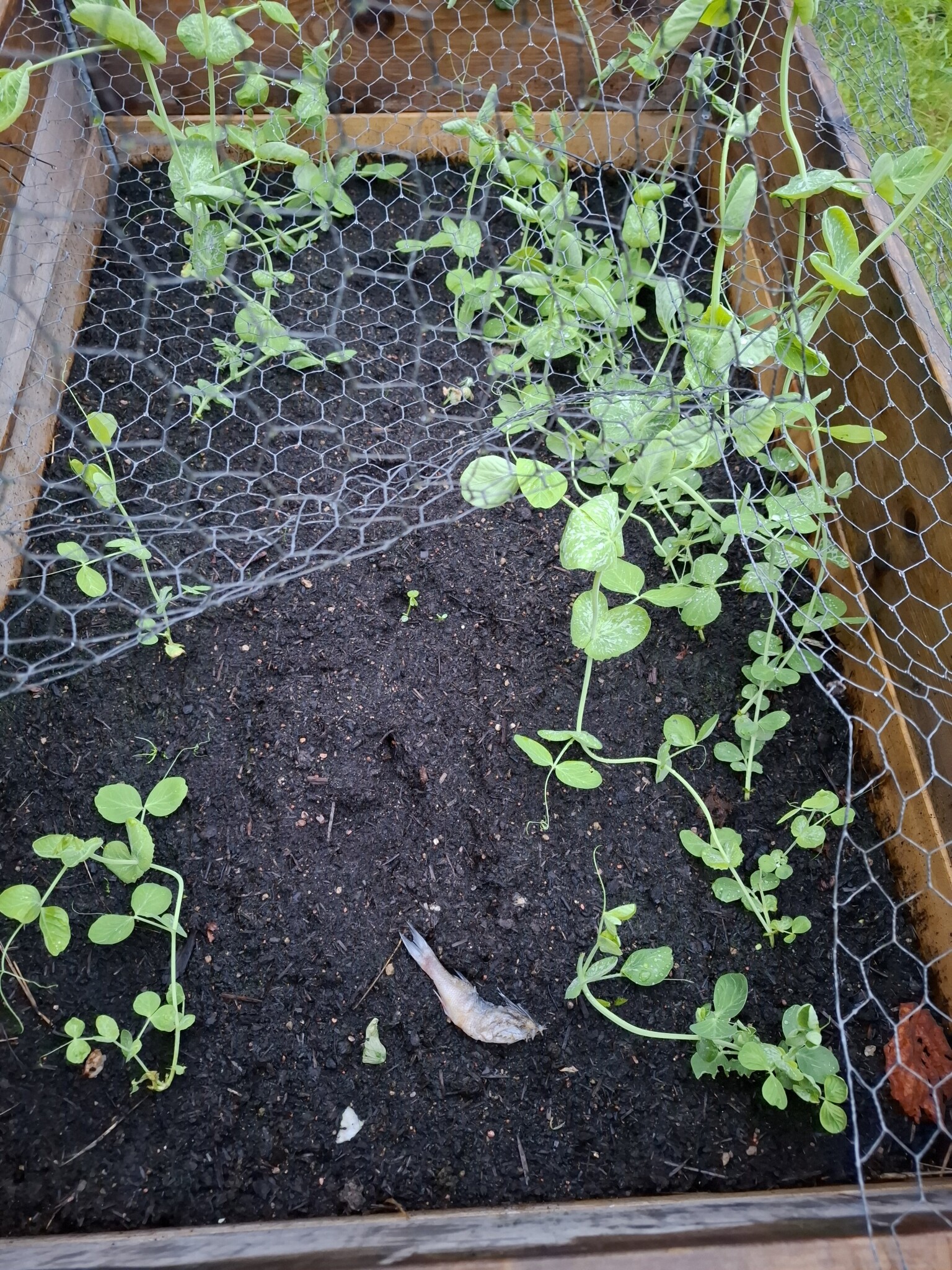 Blommar och blommar. Kanske inte riktigt. Någon har i alla fall sått en fisk i min odlingslåda. Grobarheten verkar låg.