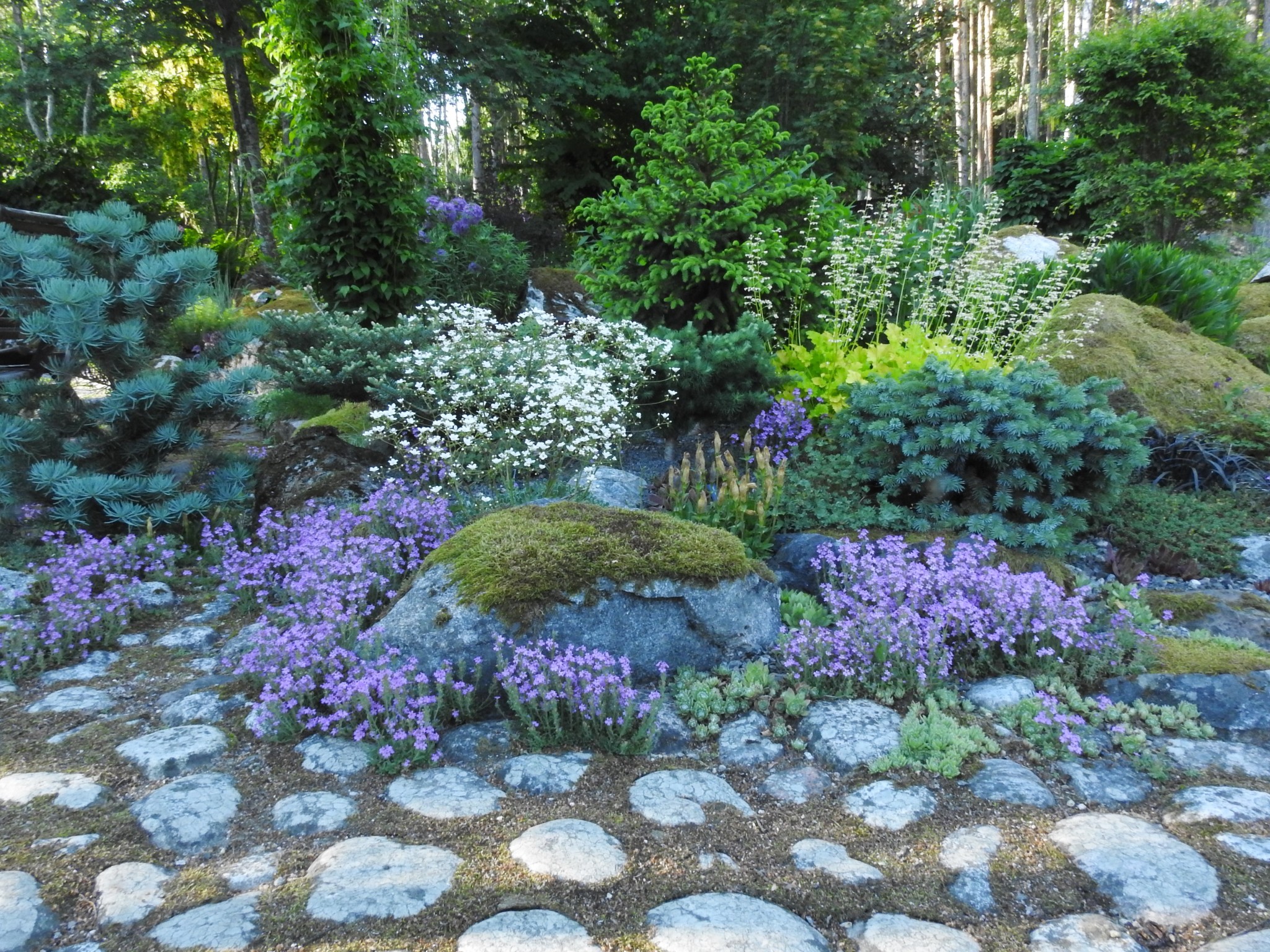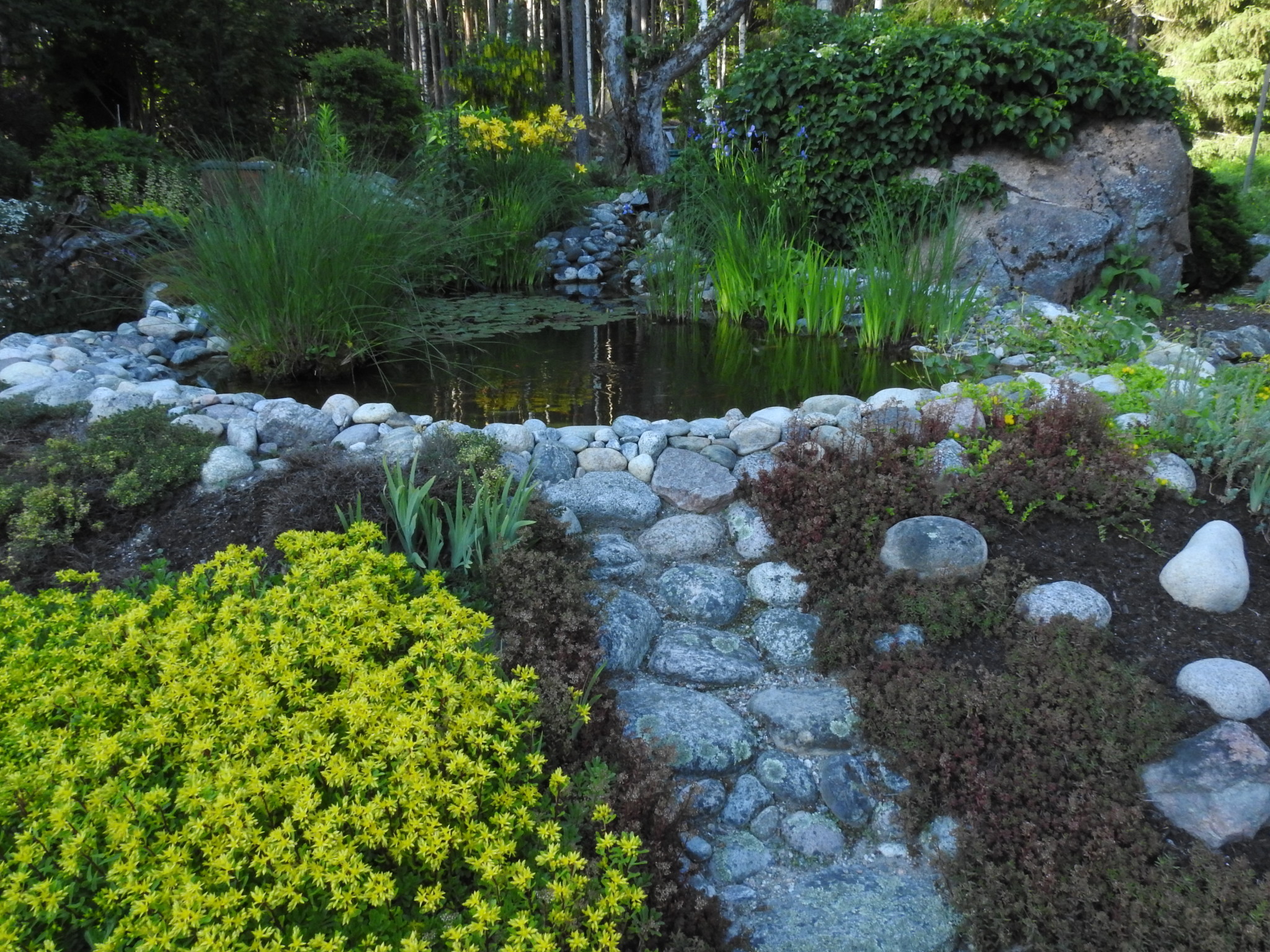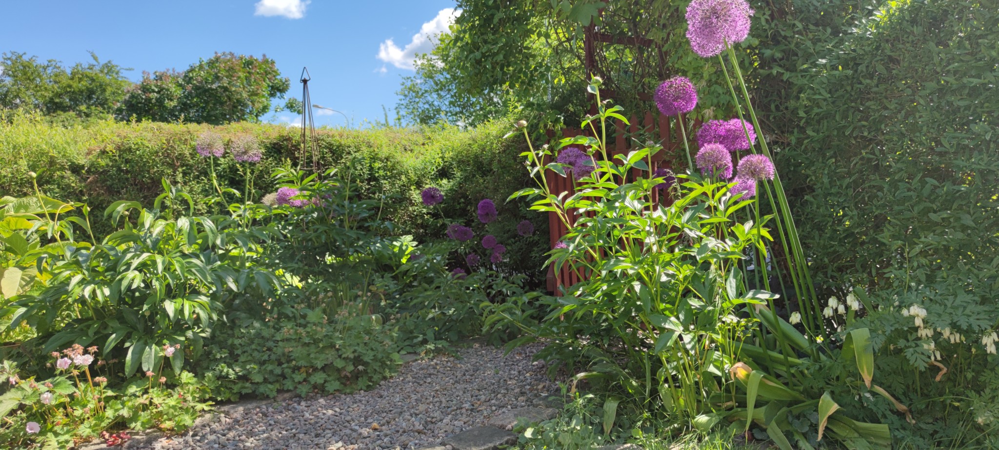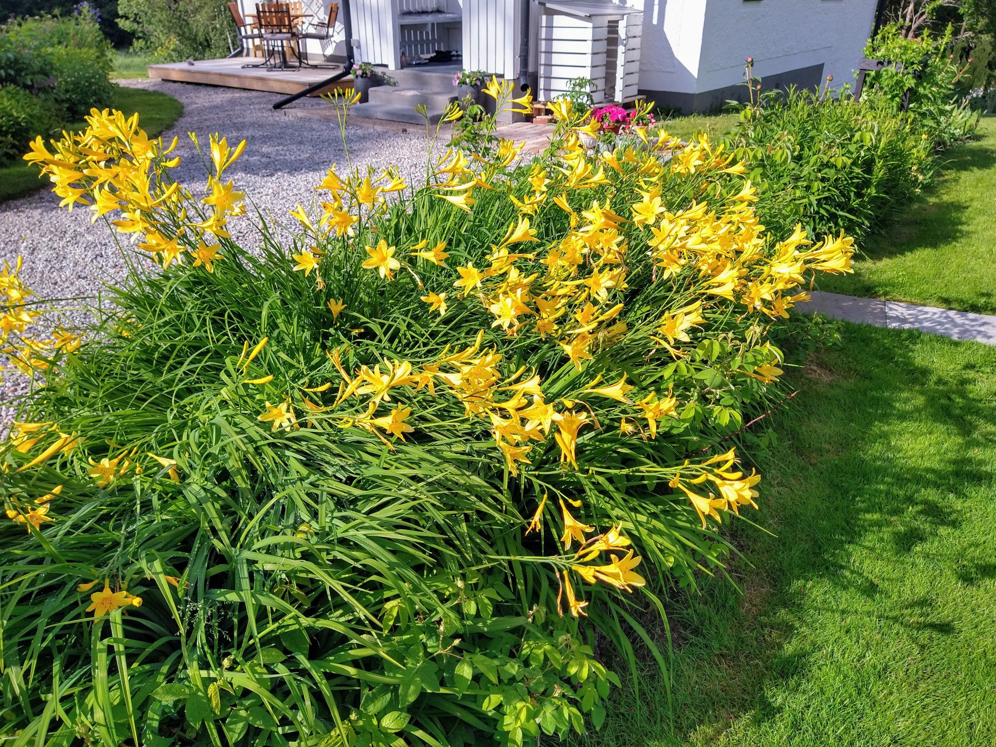 Dammen som i år fyller 18 år. I bakgrunden blommar Hemerocallis lilioasphodelus den gula dagliljan som fanns i otaliga svenska trädgårdar förut innan vi översköljdes av de amerikanska hybriderna. Det finns uppgifter om att den odlades i Uppsala botaniska trädgård redan i slutet på 1600-talet.