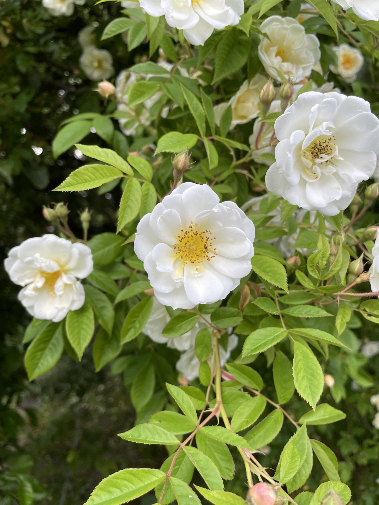 Lite svårt att se men är inte den vita en honungsros? De heter rosa helenae i grundform men de flesta i odling är hybrider av den.