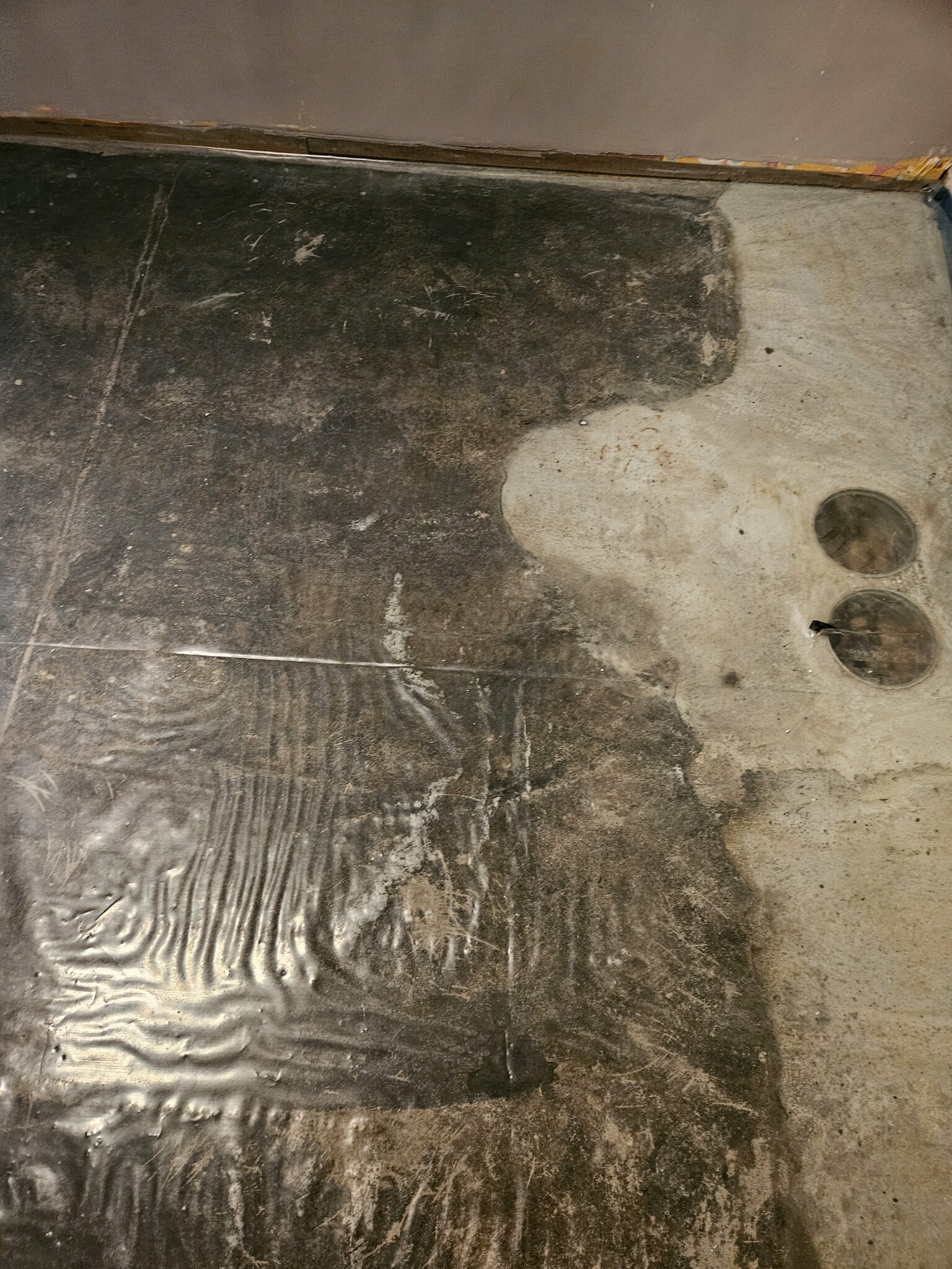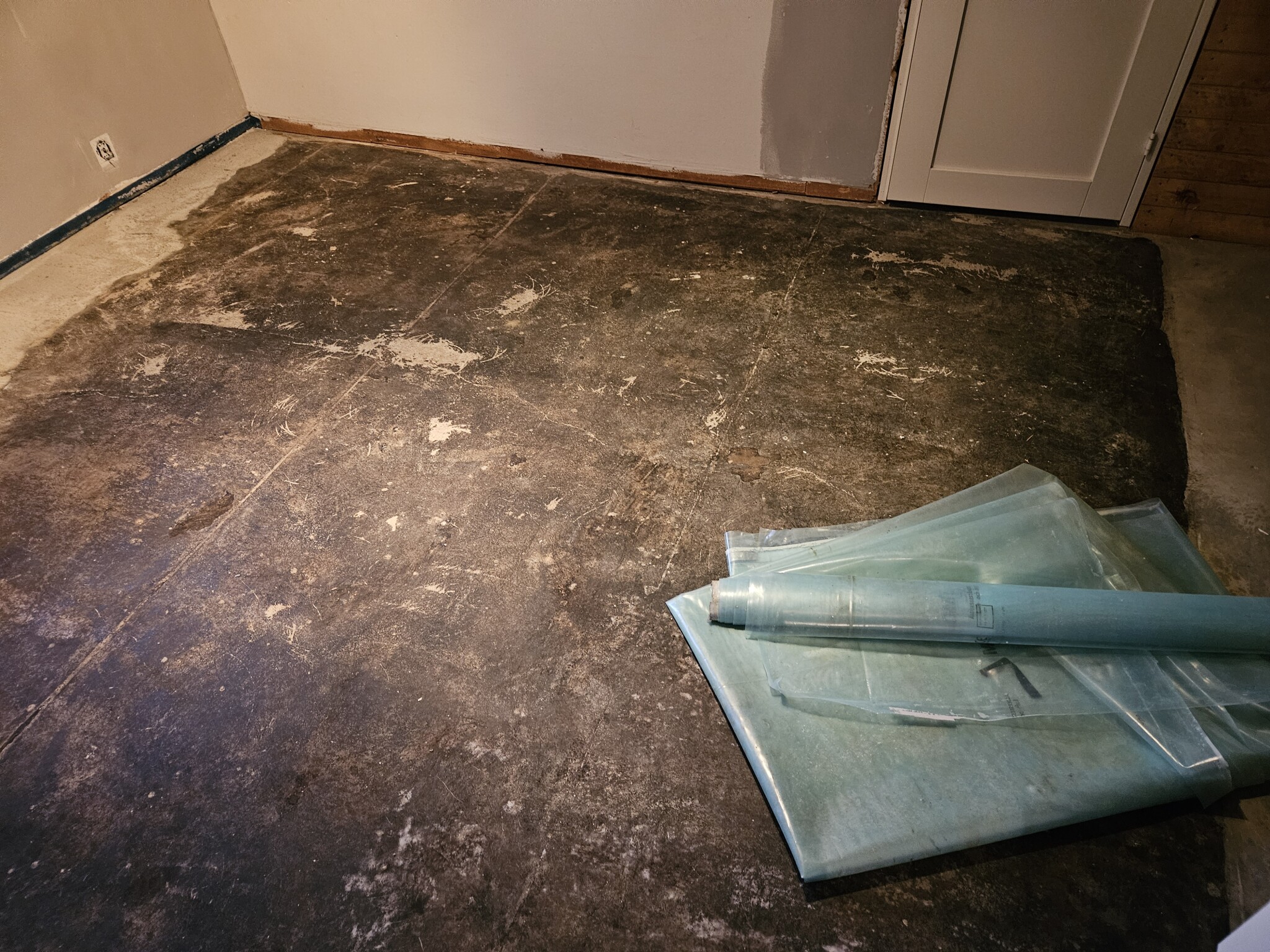 Vi rev den gamla parketten och under fuktspärren såg vi små fält med fukt, ränder på några decimeter. Tog av fuktspärren och en rätt stark doft av akvarium dyker upp. Det har ju precis regnet mycket i en hel vecka så är inte förvånad att det är fukt i plattan just nu.