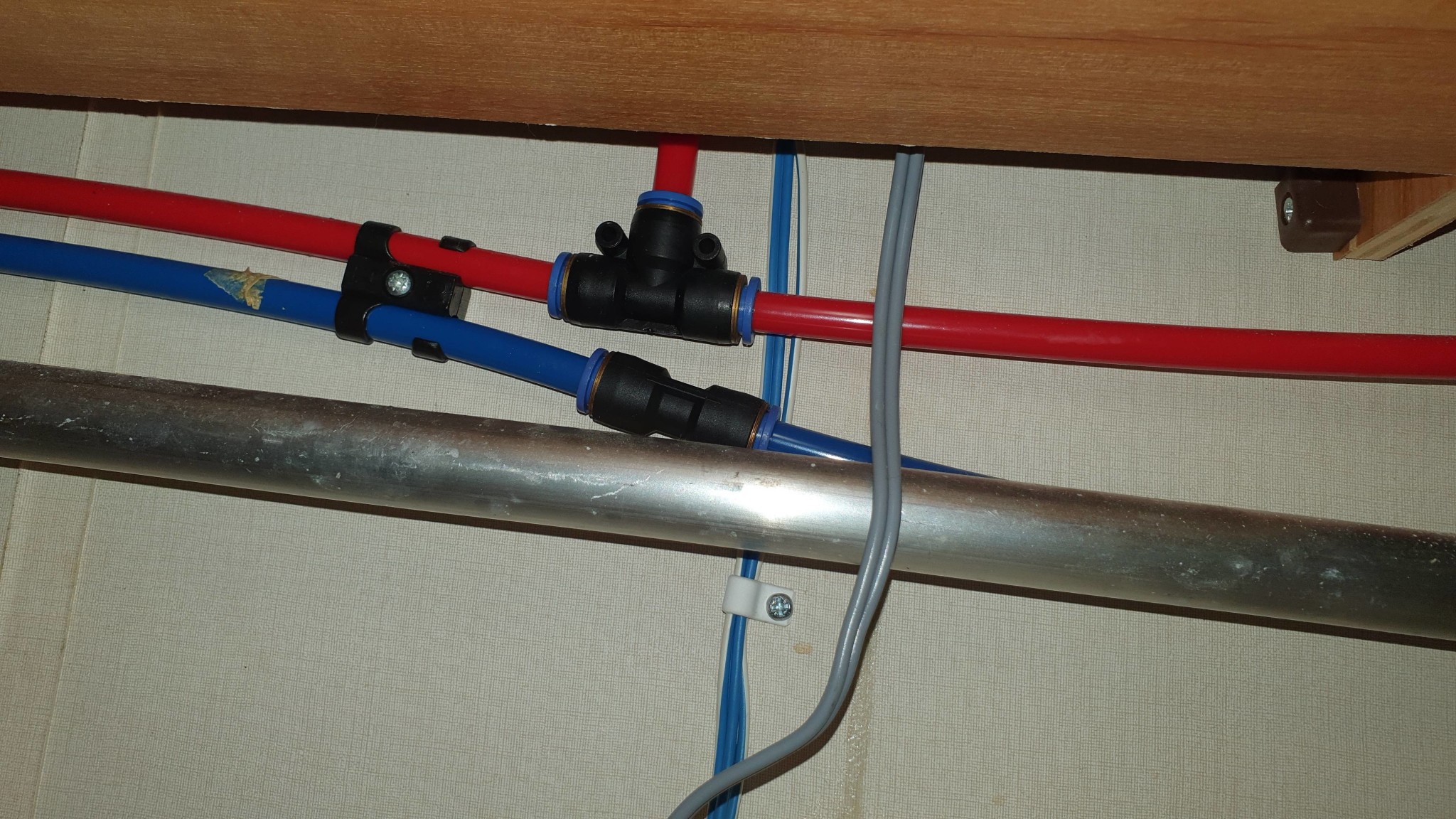 Men kranen i köket har ett relä som triggar pumpen både i originaltanken och pumpen i dunken. Så jag tänkte att det bara är att dela på kallvattenledningen som går förbi köket och sätta motsvarande t-koppling som redan finns för varmvatten. Vad heter de och var får jag tag på såna? Se bild. Slangen är 10mm utvändigt.