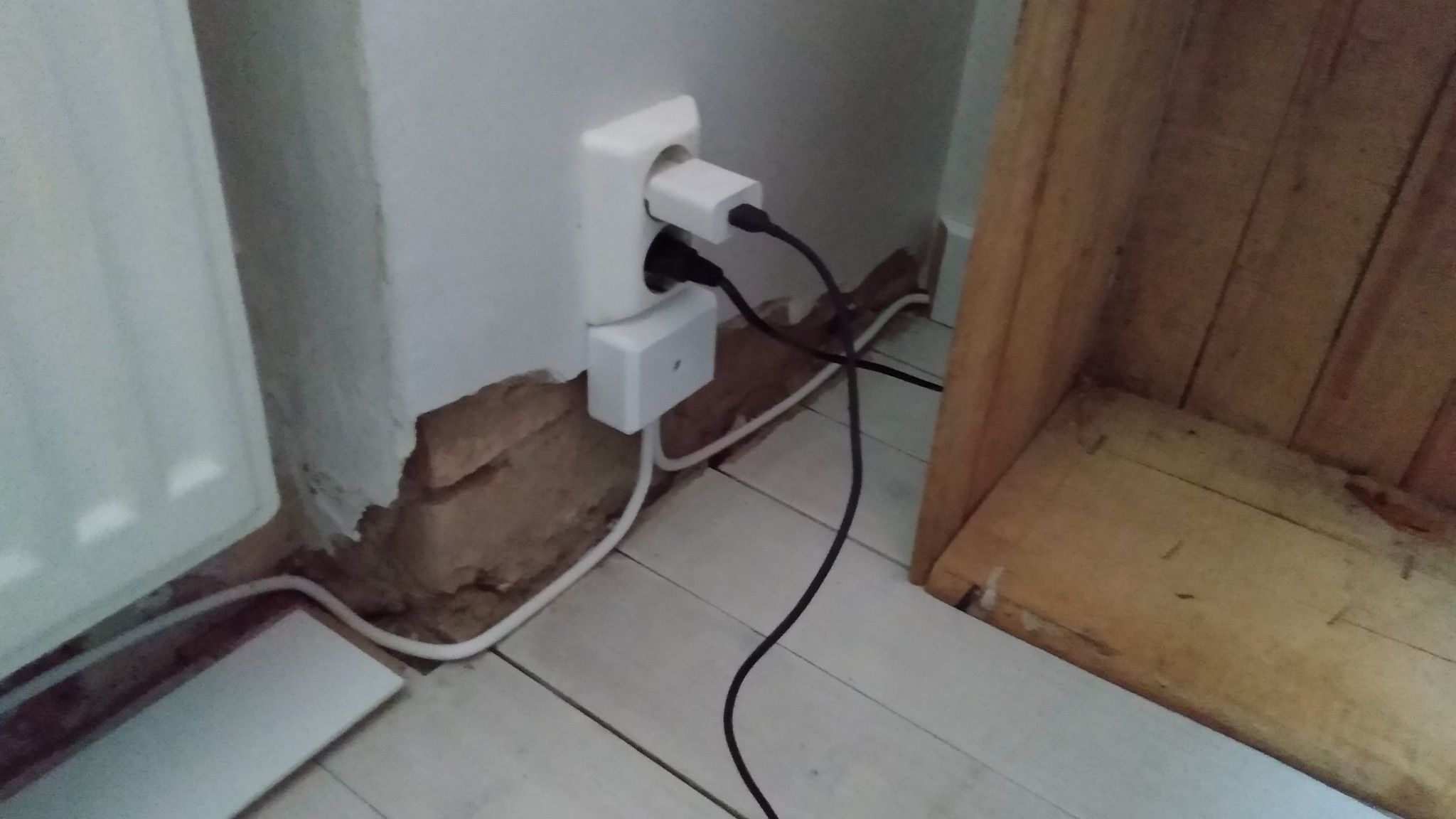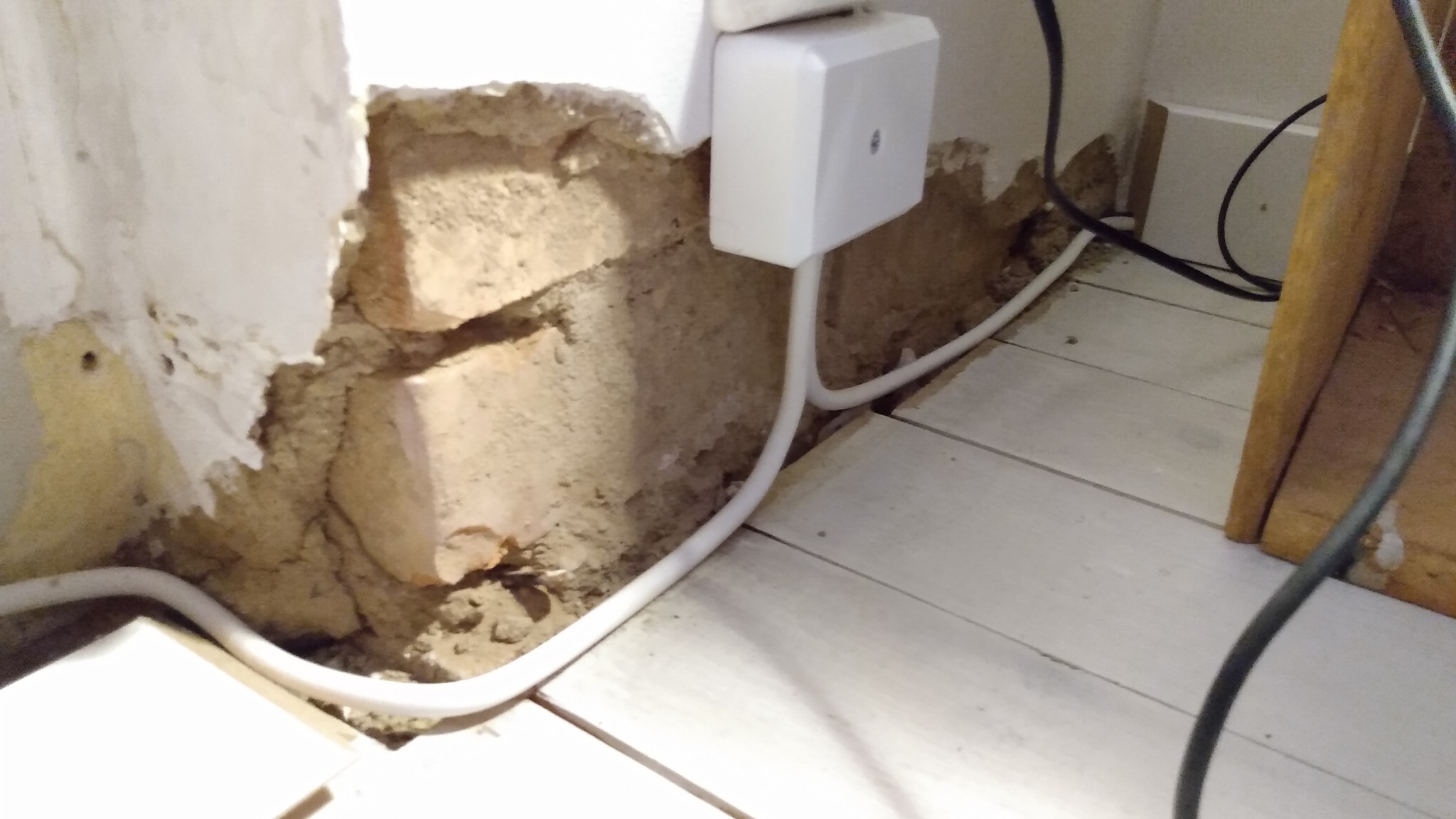 - Väggen är i nån form av sten, tror det är typ hålsten eller nåt sånt. Egenskaperna verkar inte stämma med straight-up tegel när jag borrat i det...