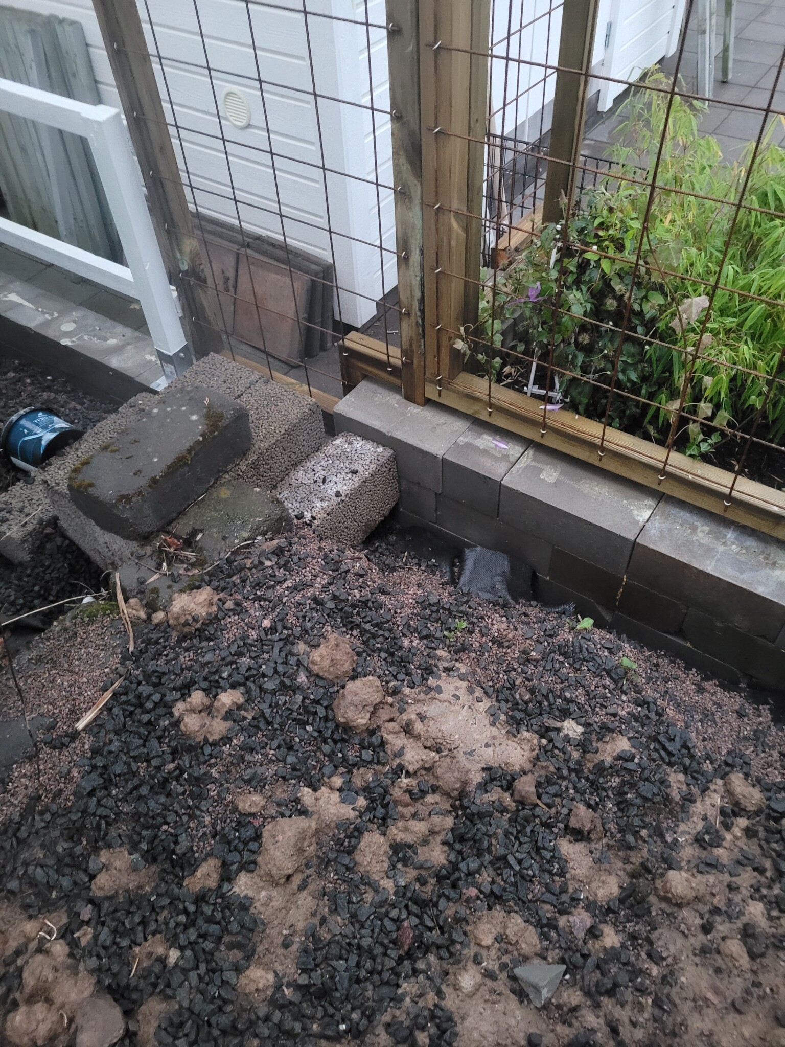 Gissningsvis tänker sig grannen gjuta eller fylla den där "rännan" med något för att stabilisera muren. Kanske ett dräneringslager.