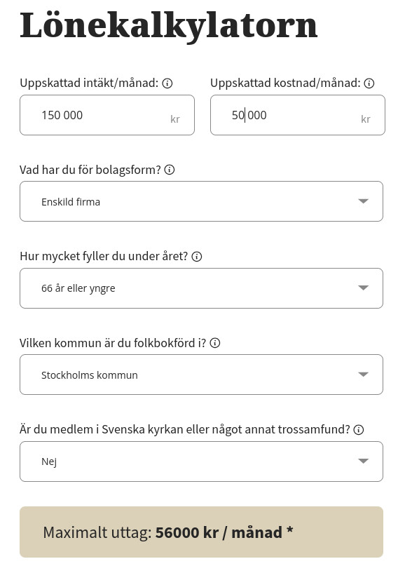 Även om jag tar i så jag kräks gällande utrustning så får jag ut över 50 tkr i månaden med såväl enskild näringsverksamhet som med aktiebolag enligt: https://www.speedledger.se/guider/rakna-ut-lon/#lon