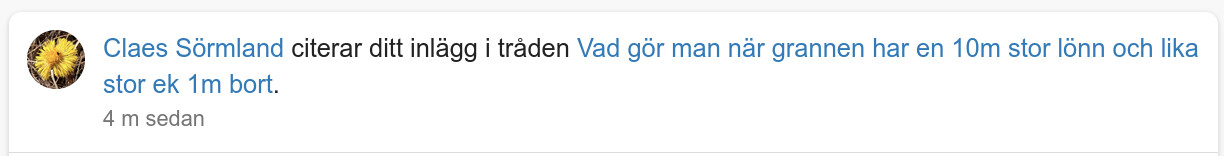 "som tex en syrenhäck behöver man inte ens fråga ägaren innan man kapar rötter." har du något belägg för att man skall bete sig olika beroende vilken växt det är? Finns det en tabell över vilka växter man skall fråga grannen först eller inte?T TypRätt skrev:Nu saknar ju ditt citat context om vart i processen den berörda personen är. Du får kapa rötter best fan man vill (hur ska du veta om trädet får en svampinfektion just pga den ena eller andra roten som kapas?). Det som står är att om växtligheten kan antas ta skada ska man i got tid ge ägaren möjlighet att själv ta bort rötterna, denne kanske vill suga bort jorden och böja in vissa på egen fastighet eller smörja på något antisvampklet på såren. Är det däremot en växttyp som inte tar skada av lite allmän luggning som tex en syrenhäck behöver man inte ens fråga ägaren innan man kapar rötter.