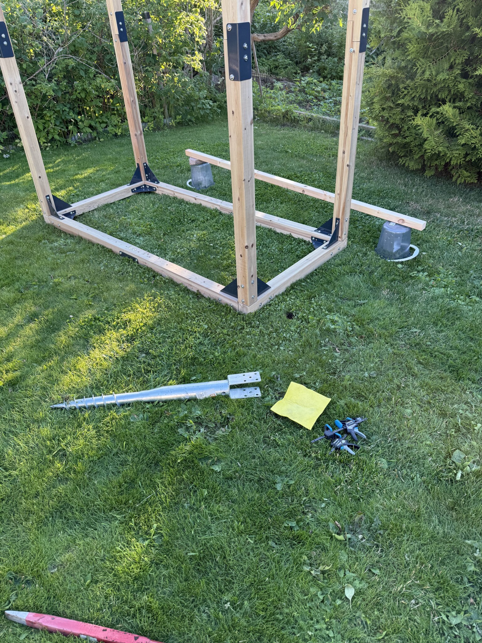 Håller på att sätta upp en klätterställning o den är lite tung så vill undvika att den välter. Köpte markskruv på Jula. Rätt långa så att de skulle passa de stora brädorna.