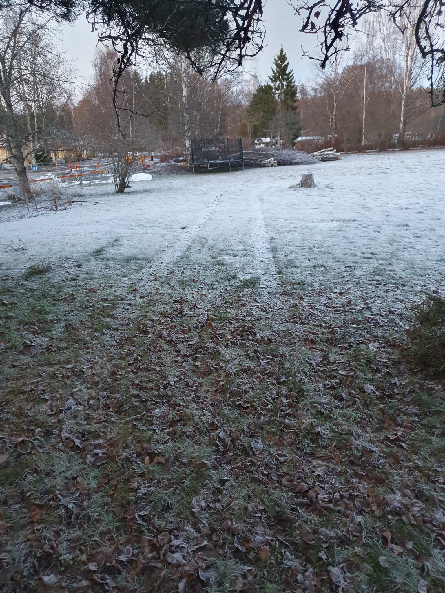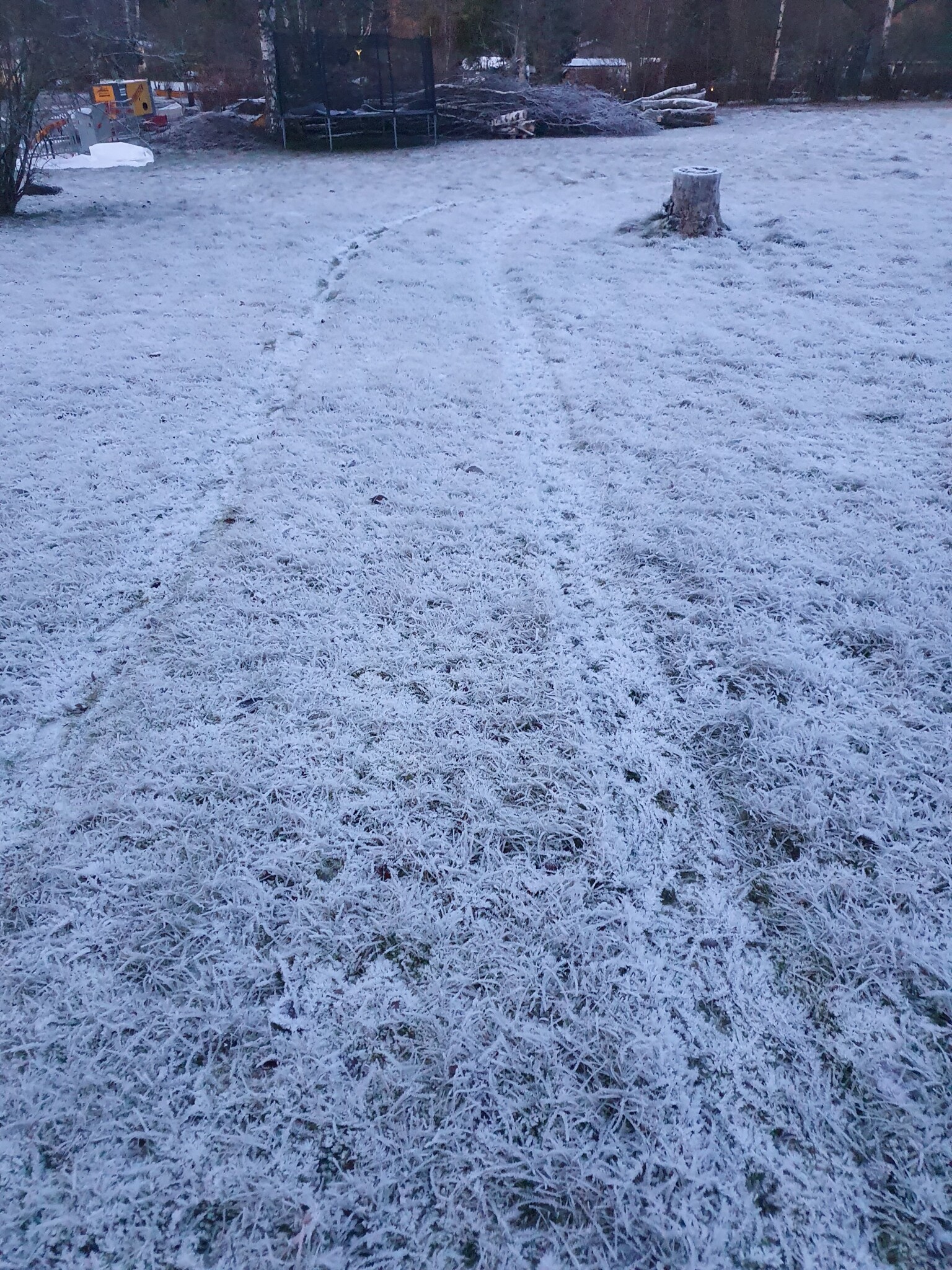 Jag skulle ta en grep och gå längs spåret nu och berätta att du köper hem frö till våren när det har en chans att gro. 10-12 grader i jorden osv.. Inte för att jag tror det är nödvändigt men lyckas man klanta till det i så hög grad att man gör intrång på grannens tomt med en bil (wtf?) får man försöka mildra effekten. En halvtimmes jobb nu och en säck gräsfrö av den större typen till grannen (köp inget billigt skräp) är ingen stor sak.
