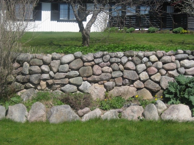 Norrmännen är experter på att bygga stenmurar. Bara att skala ner det till din stenmur. Problemet med din mur är att du har ”halkiga” runda naturstenar.