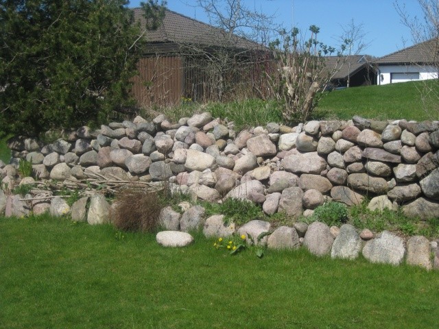 allt finns ju på plats redan. Gräv ur bakom och stapla om den. Se till att lägga en dränslang bakom när ni återfyller med MAKADAMO ohändighusägare skrev:Vår tomt ligger lägre än granntomten bakom vårt hus. I tomtgränsen finns en stenmur av natursten som husets tidigare ägare har byggt själv. Stenmuren är 24 meter lång och 1,3 m hög (som syns). Nedanför stenmuren finns en upphöjd rabatt som är kantad med stora stenbumlingar, höjd ca 40 cm, bredd 1 meter). Ovanför stenmuren (på grannens tomt, nära gränsen) står 4-5 träd. Stenmuren börjar nu ge vika och har rasat på tre ställen. Vi är lite panikslagna då vi har barn och är rädda för att något av barnen skall råka illa ut nästa gång en sten faller till marken. Hur åtgärdar man detta på ett hållbart, billigt sätt samtidigt som det inte får kosta för mycket?.