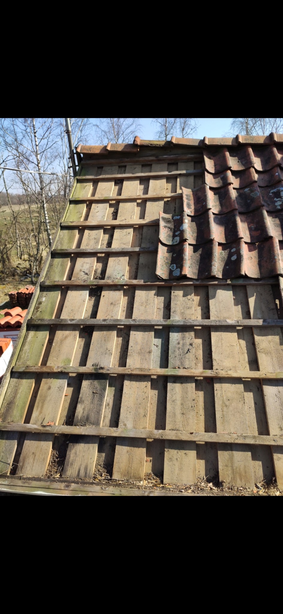 Har börjat plocka av gamla enkupiga pannor från ett vasstak på en gammal stuga. Anledningen är att flera pannor är trasiga och vid varje blåsväder flyttar sig pannorna.