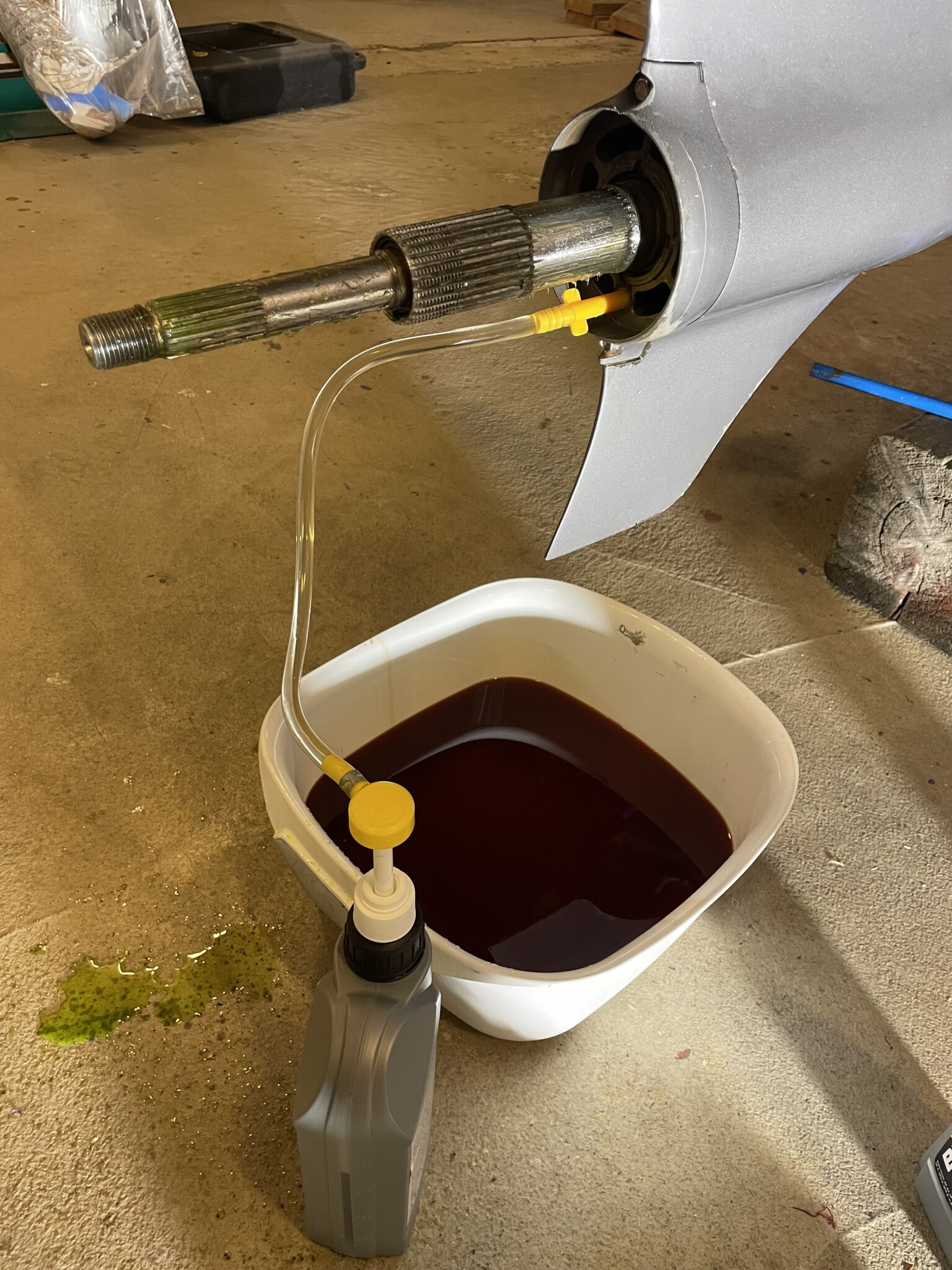 Bytt växelhusolja i drevet på träbåten idag.