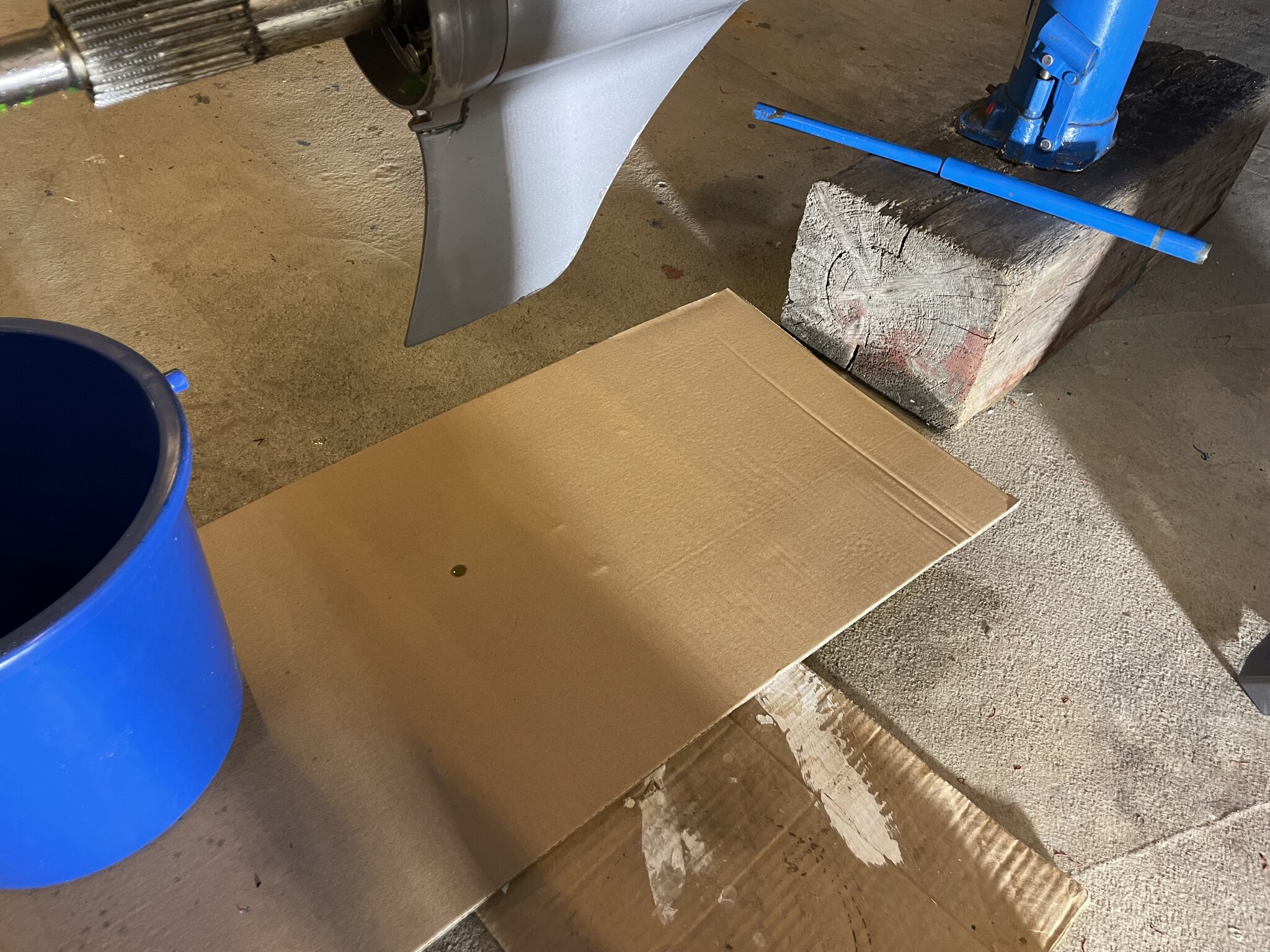 Lagt under en ren kartongbit så får jag kolla imorgon om det kommit fram någon oljedroppe. Fläcken i nedre bilden är inte olja, utan en kvarvarande droppe propylenglykol från höstens konservering.