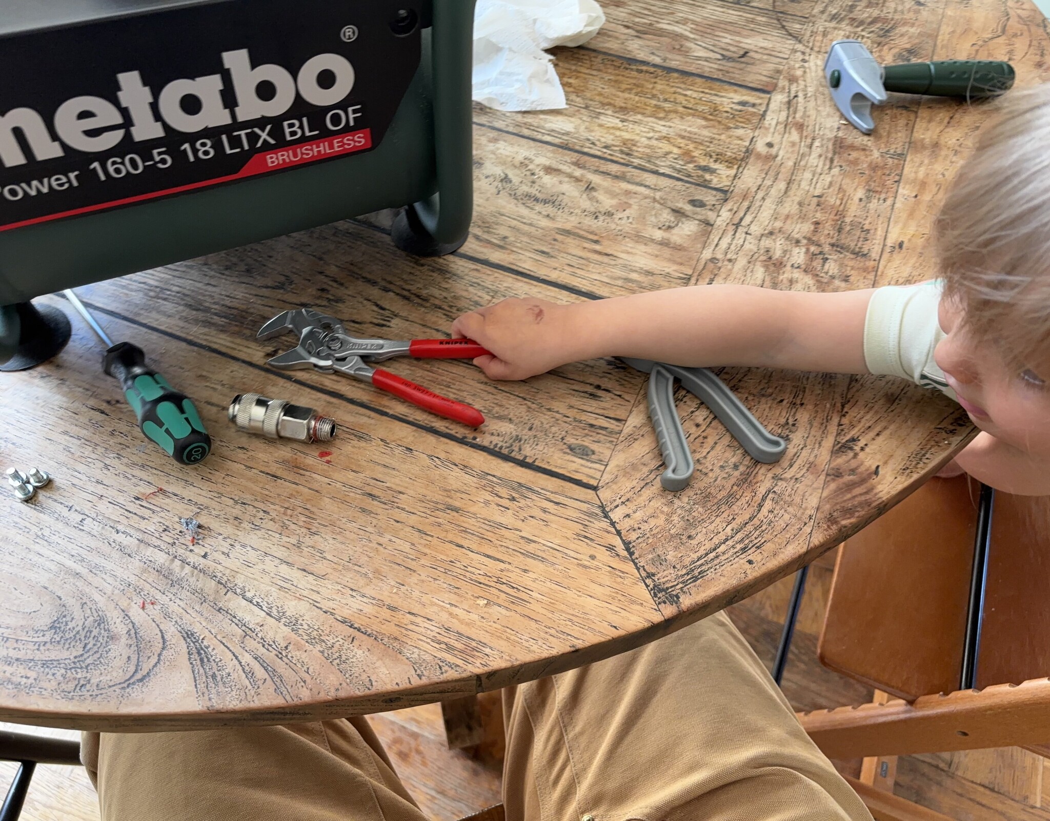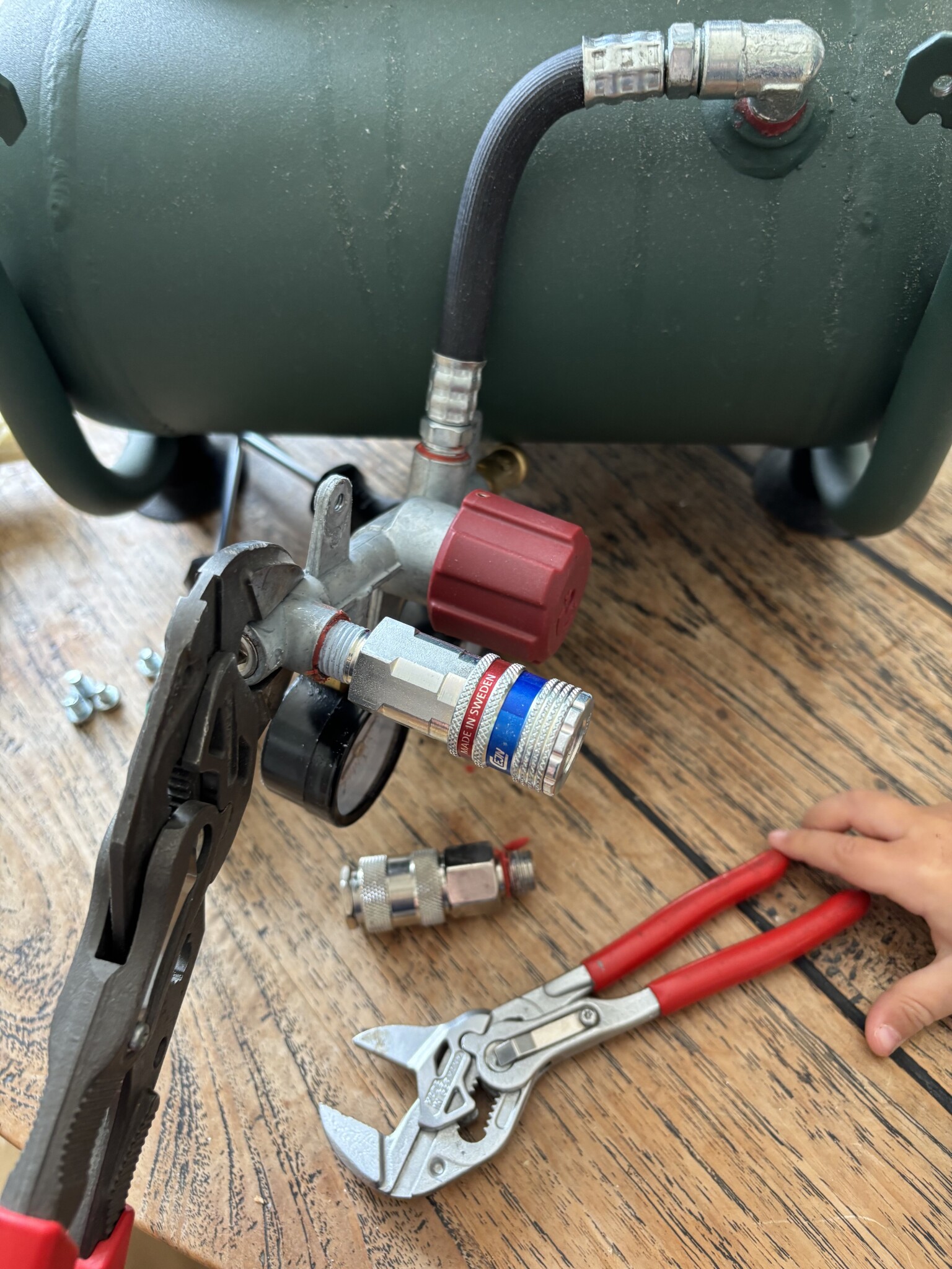 Hade medhjälpare så passade på att barnsäkra kompressorn med Cejn esafe. Har sån koppling på slangen så då är det bäst att ha även på anslutningen för att slippa smällar och att slangen hugger som en kobra[bild]Ettåringen tyckte känslan var bättre i Knipex än hans set från gröna Bosch.[bild][bild]
