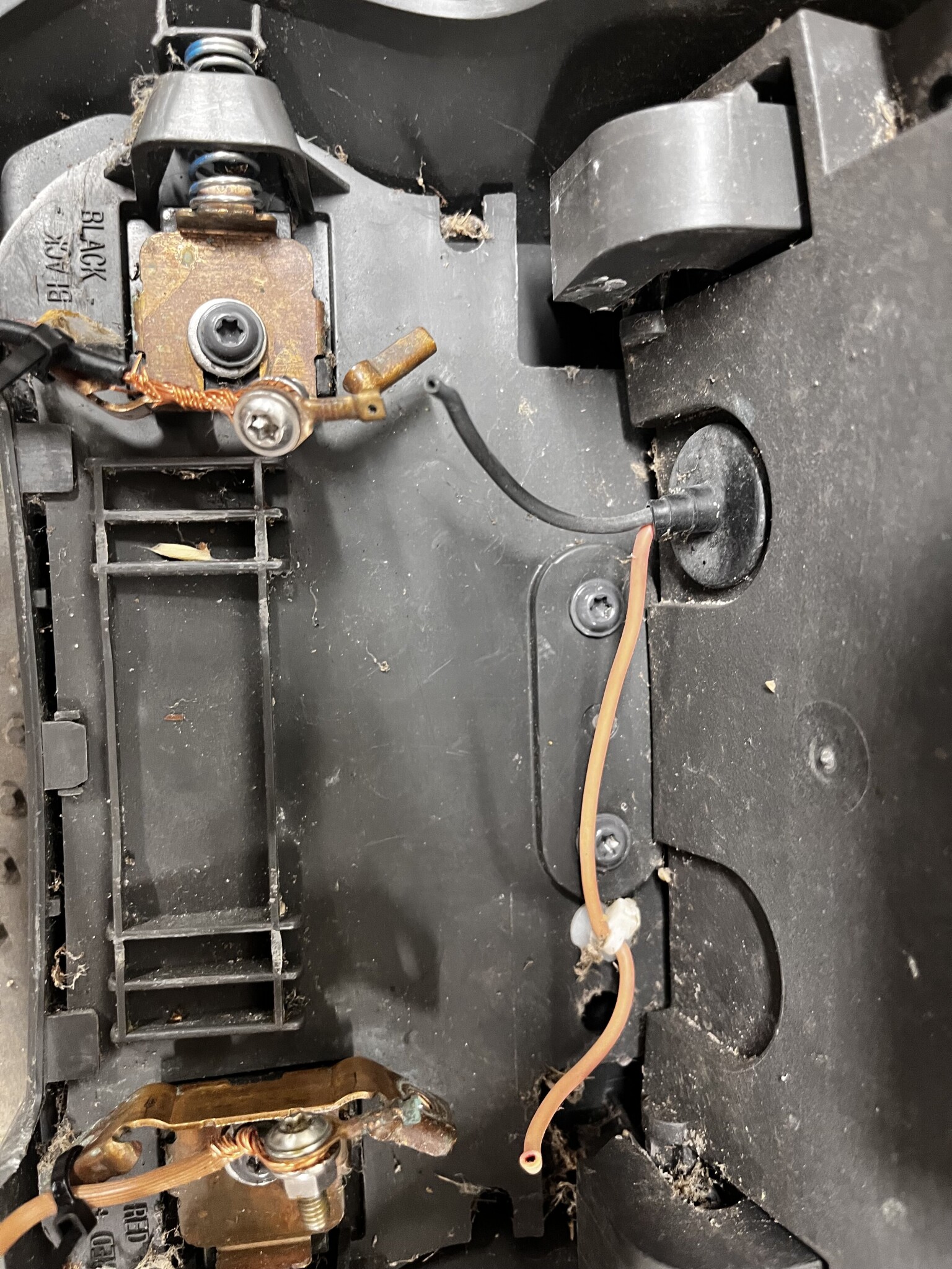 Men så när jag städade bort resterna av myrboet lossnade ena sladden till kabelskon som ansluter till kontaktblecken och den visade sig vara i princip sönderärgad. Även andra sladden var i princip av.