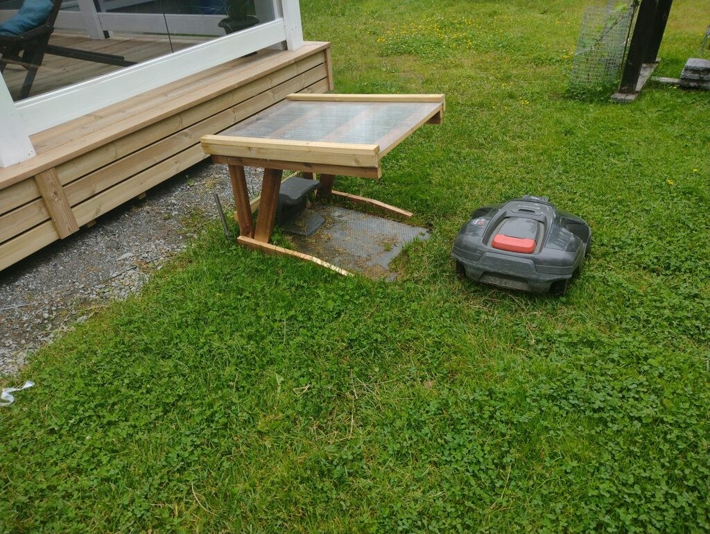 Jag hittade en bit kanalplast bakom förrådet under nån presenning. Fick en idé då storleken så nästan perfekt ut. Jag letade upp mera skräp (jag slänger knappt nånting i träväg som är tillräckligt stort) från en annan hylla och efter nån timme hade jag spikat ihop ett regnskydd åt roboten. Just då jag ska fota bestämmer den sig för att åka iväg