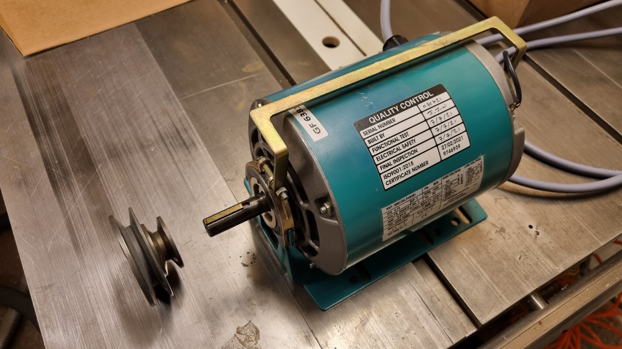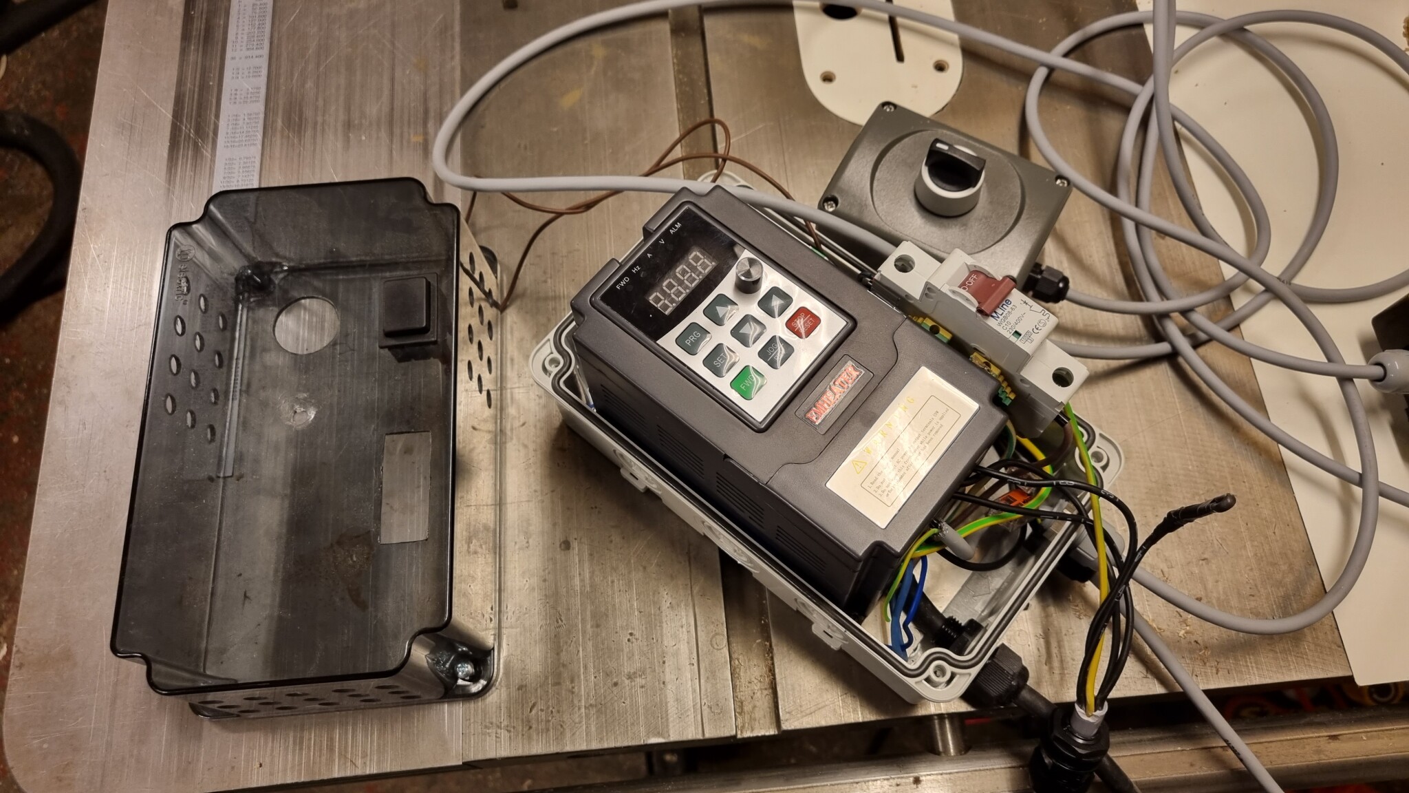 ...och där har den stått o varit snygg, utan motor, i fyra år. Min projektkompis o jag brukar byta bra att ha prylar med varandra och i utbyte mot något han fick av mig föreslog han att ordna frekvensstyrning till svarven. Va väl egentligen inget jag behövde men trevligt att ha. Sen blev det stiljte, jag har ju en annan svarv så behövde inte få ordning på denna så...ja.