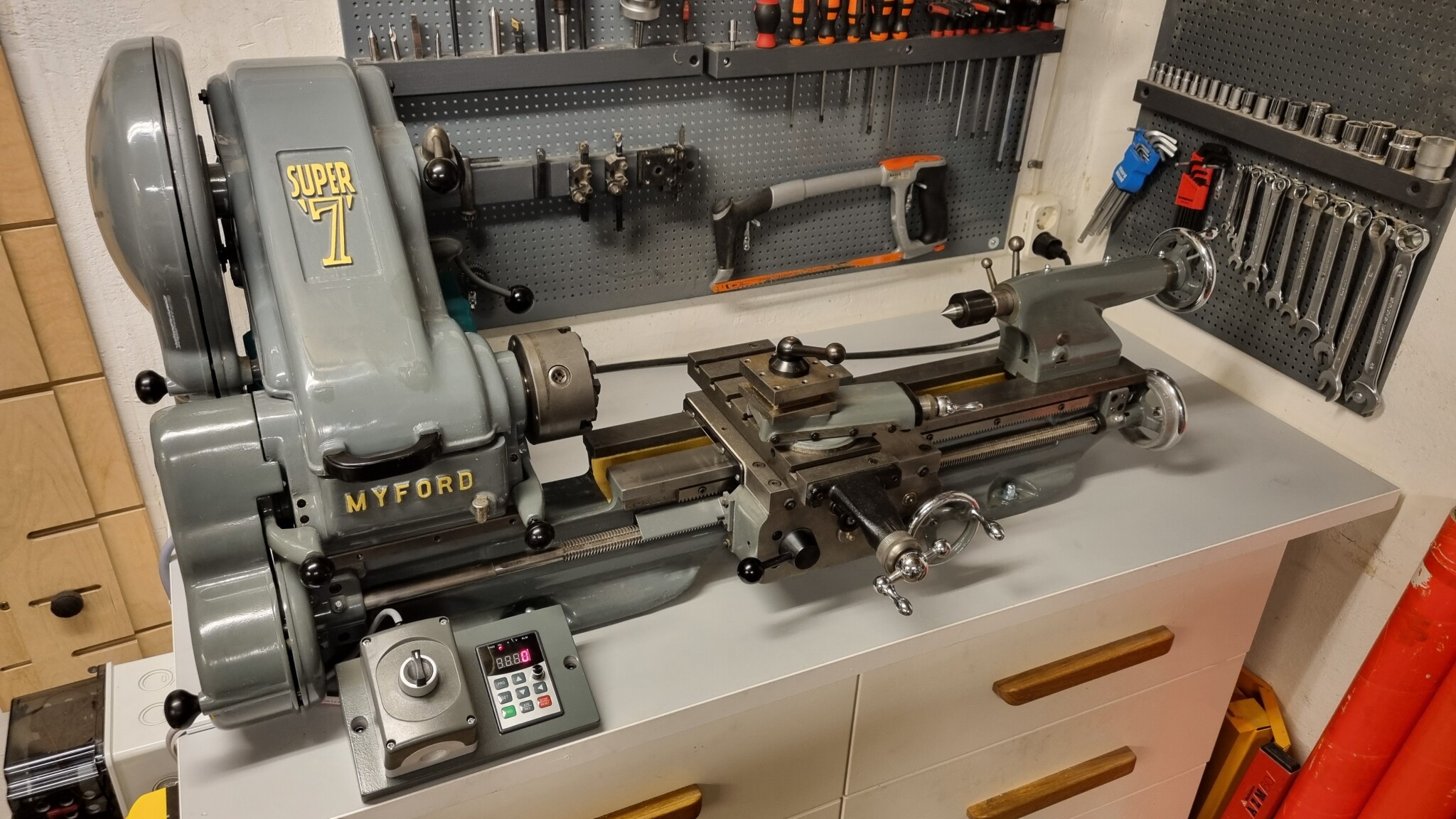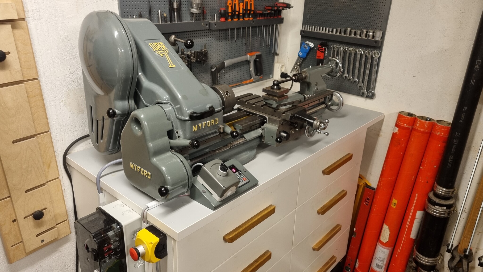 Men nu så! För nån vecka sen så koppla han ihop ett paket till mig och sen har jag trimmat in kabellängder o annat hemma. Byggt en liten myfordgrå-målad box till on/off samt varvtalsstyrningen o flyttat svarven till dess riktiga plats.