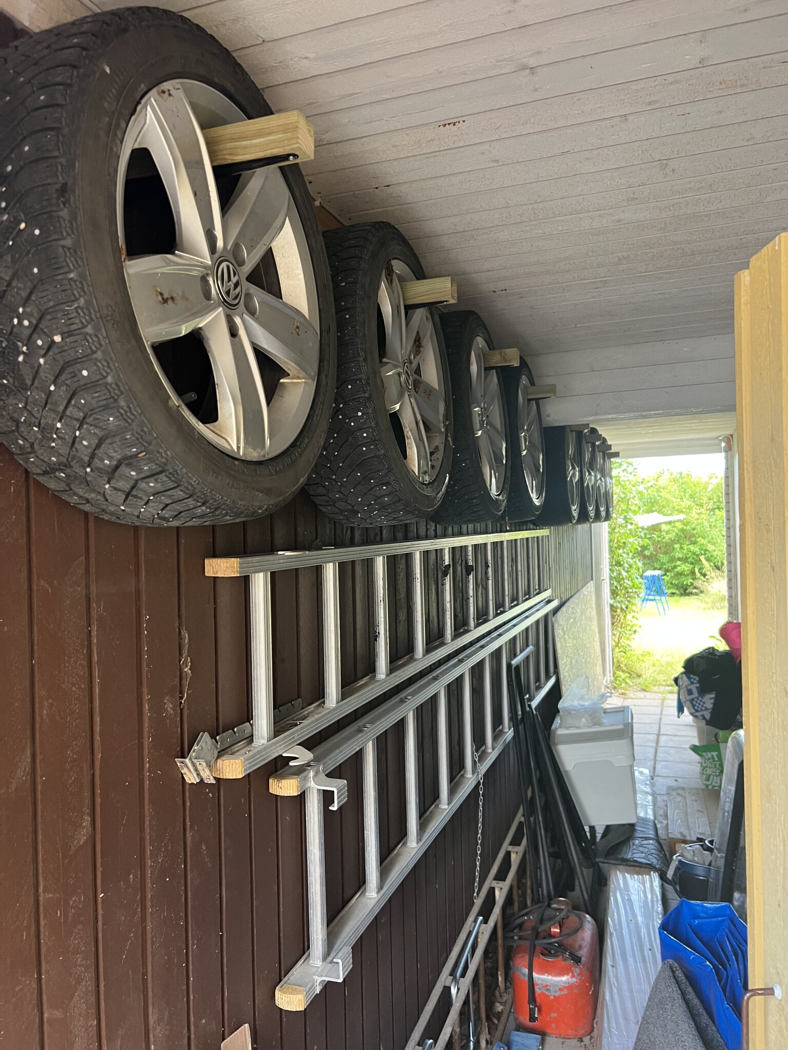 Inte alls i paritet med @Ola C (hur skulle man kunna vara det?) men jag har ordnat lite däckförvaring mellan hus och garage. Hyllkonsoler, överblivna 45x45 och lite skruvar.