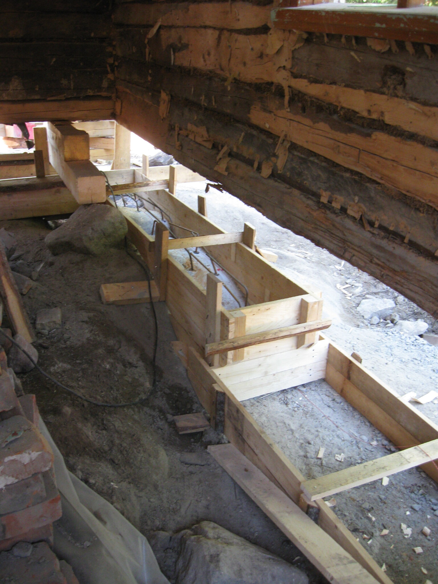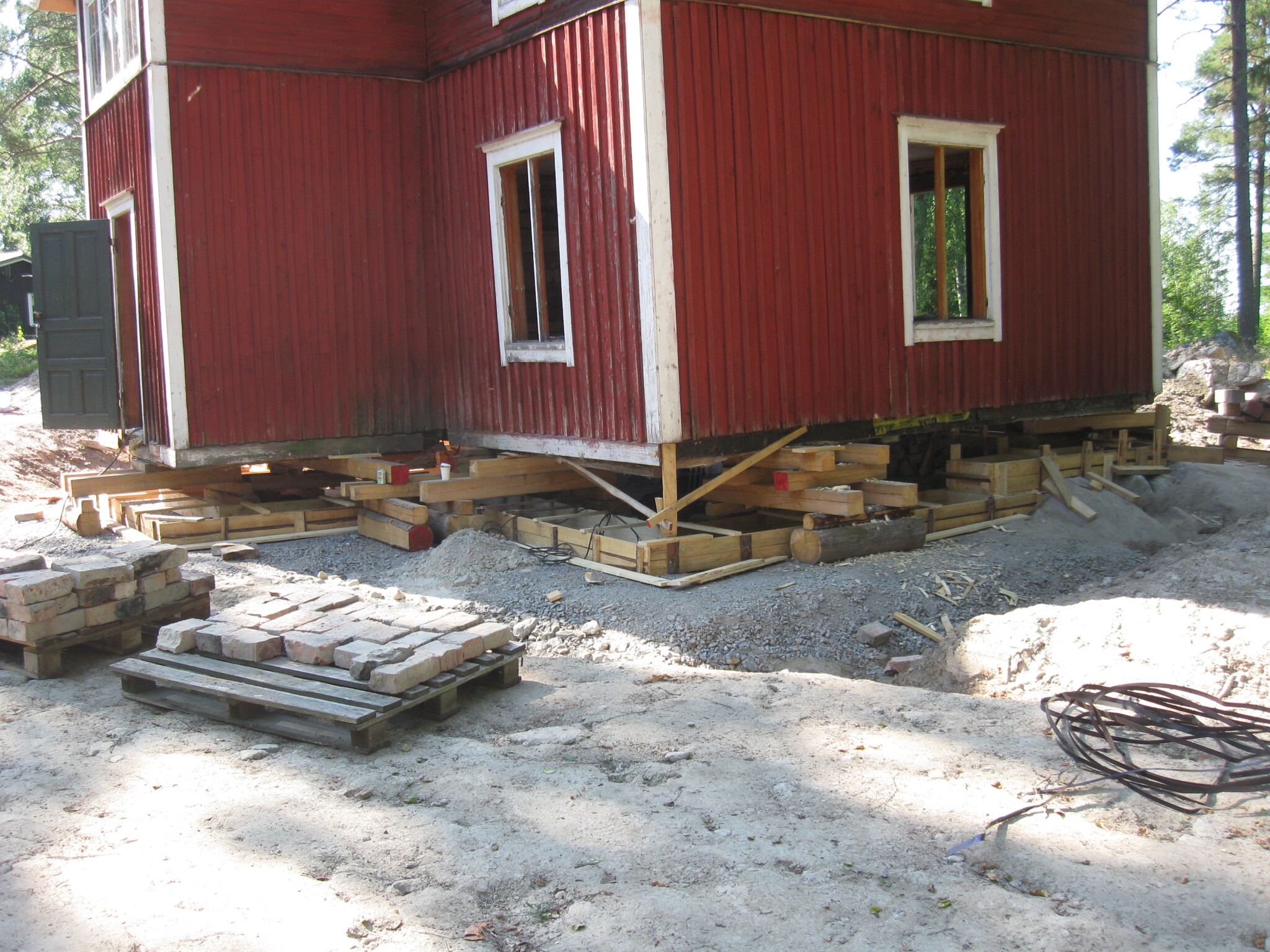 Betongformar. Husägaren formar själv den delen av grunden som ligger på grusbädd. Jag formar där formarna skall anpassas mot berg. Det blir en rörelsefog emellan de två grundtyperna. Timmerstommen tål litet ojämn sättninng.