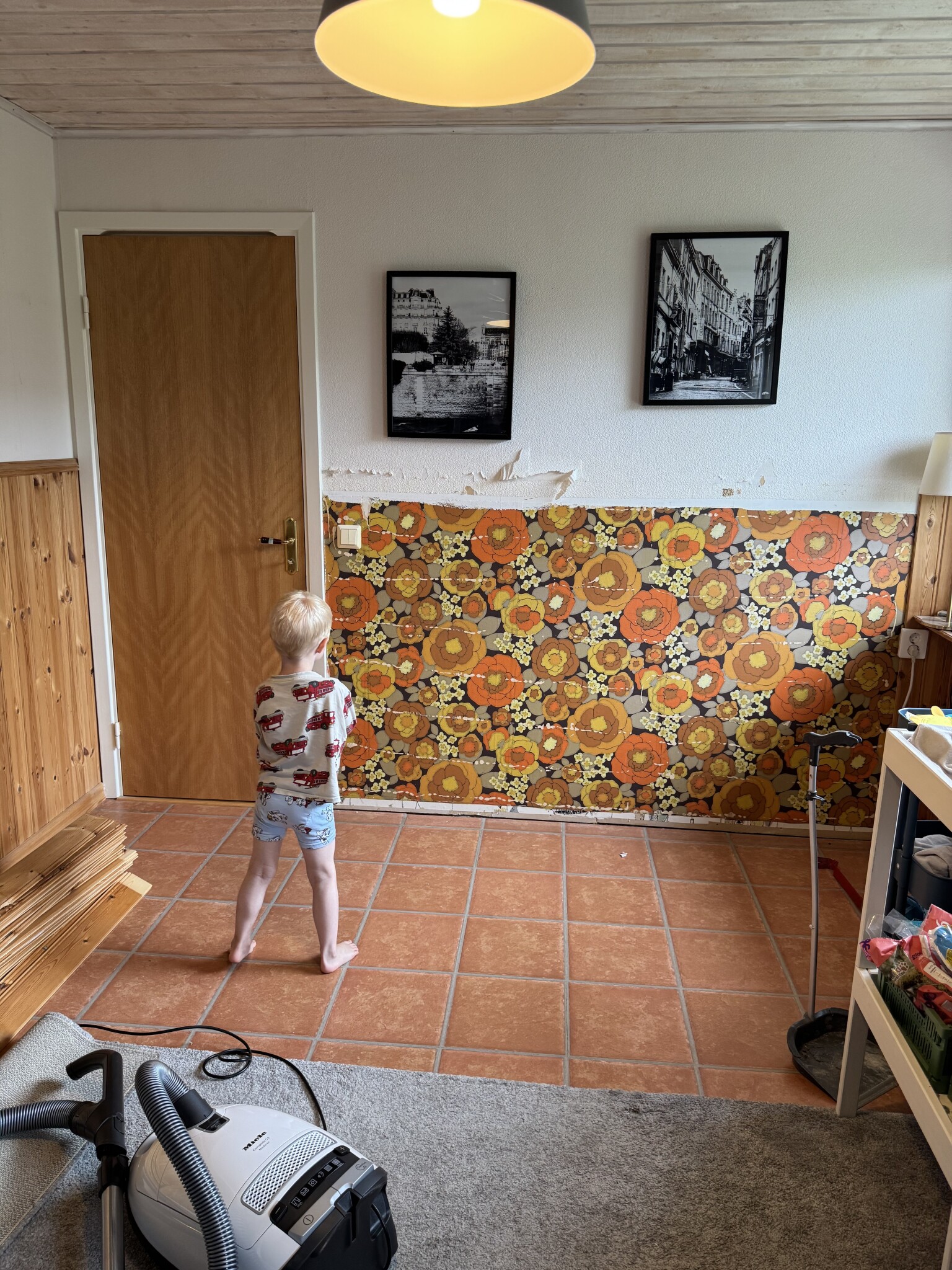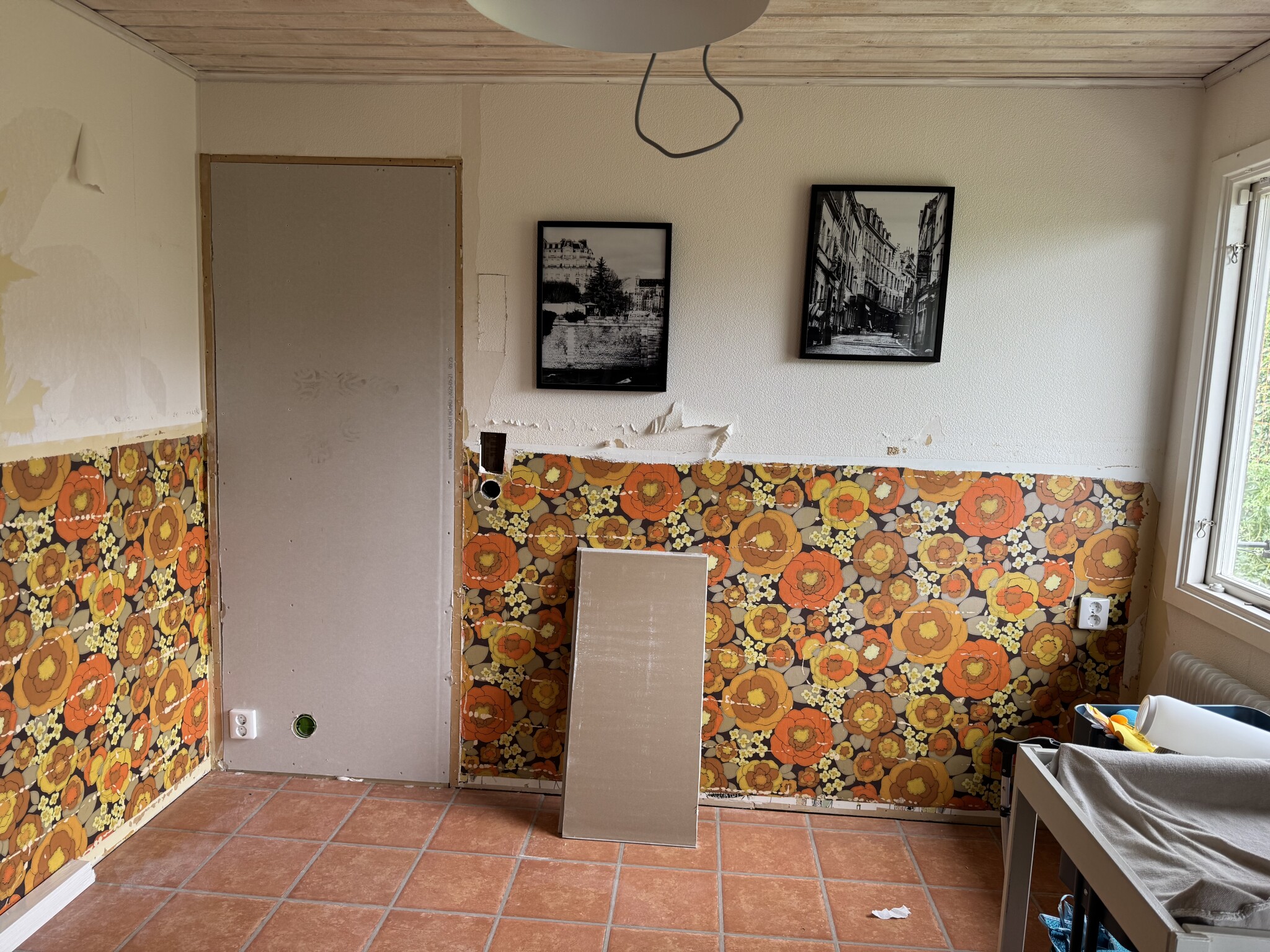Sovrumsdörren har tidigare gått till det som förr var kök! Det rummet vi nu kallar bösrummet! Det rummet ska bli sovrum det också och då är det bättre att ha dörren ut mot vardagsrummet i ena sovrummet och stänga igen gamla dörrhålet! Sambon är borta idag med så jag och sonen pillar bort lite träpanel och fick fram den här fantastiska tapeten!