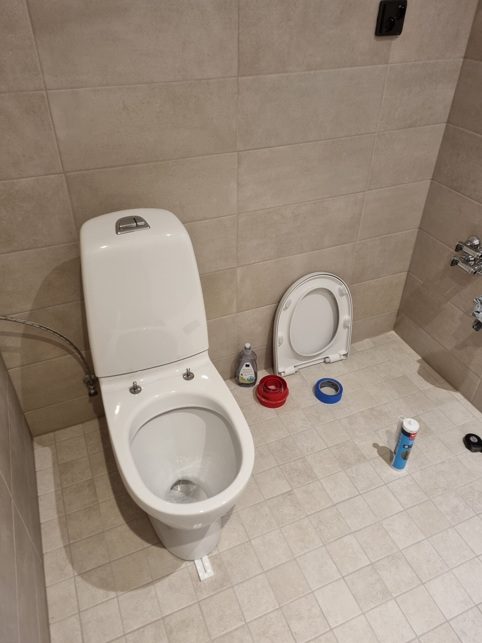 Monterat skithusstol! På bilden är den provmonterad, men nu sitter den limmad med en halv tub silikon... 😀 har också bytt stickpropp på bordssågen och petat dit ett bar impulsfjädrar till badrumsbelysningen. Förhoppningsvis kommer kommoden imorgon eller måndag, vi får gäster på onsdag och jag har lovat dom privat-dass!