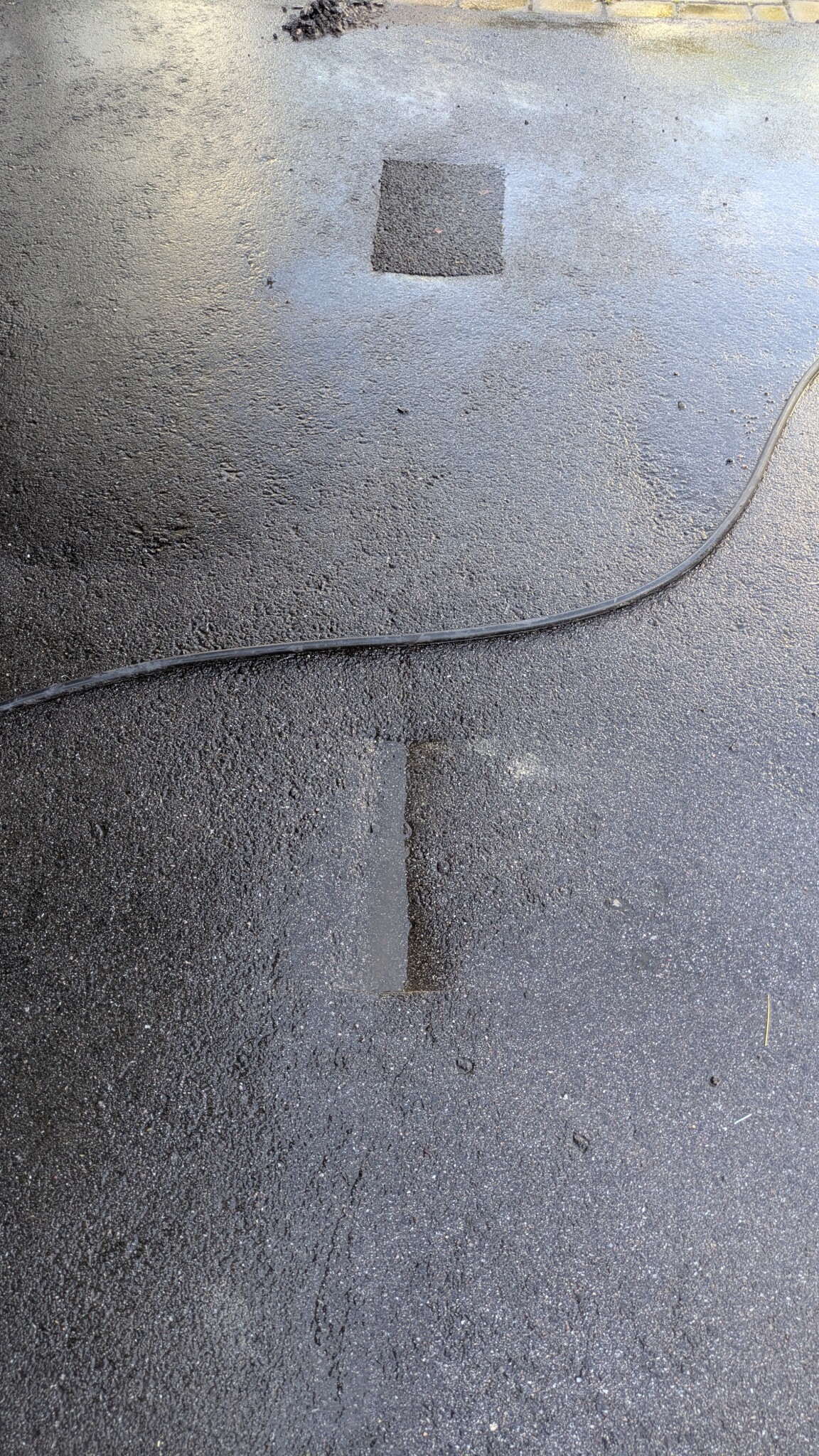 Inför takbytet så tog jag hem ett flak och började vräka ner pannor. När flaket väl var borta upptäcktes att flaket sjunkit ner i asfalten. Idag sågade jag upp det ena med en vinkelslip och diamantklinga, fyllde sedan med reparationsasfalt. Testar på ena hålet för att se hur det blir