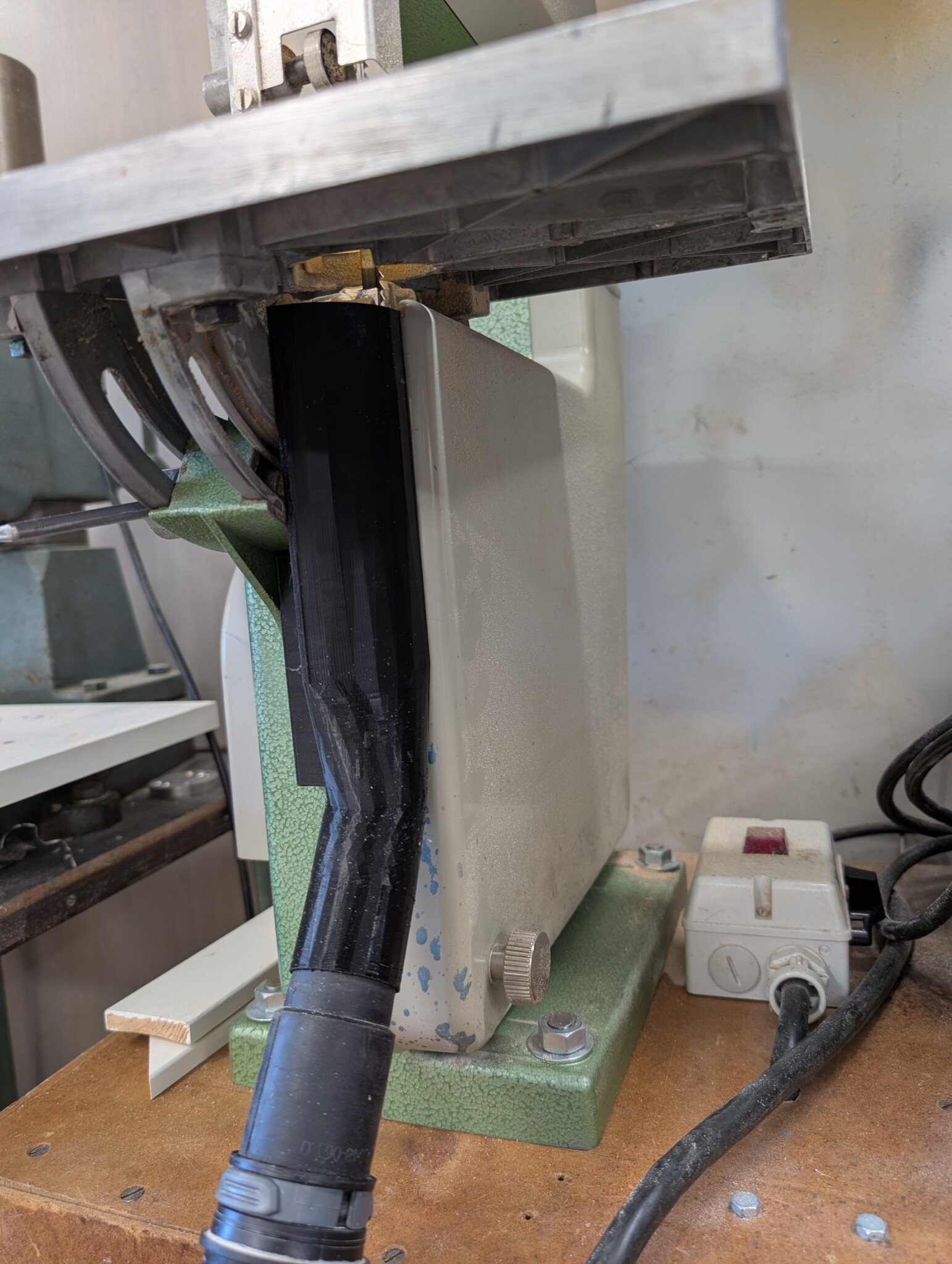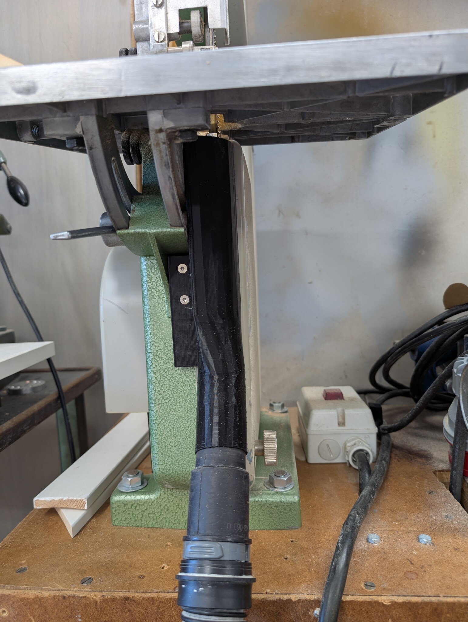Ritade upp och skrev ut ett dammsugarmunstycke som passade helt okej, några skönhetsfel men inget jag kommer lägga mer tid på. Borrade två hål i chassit på sågen och gängade för M4.