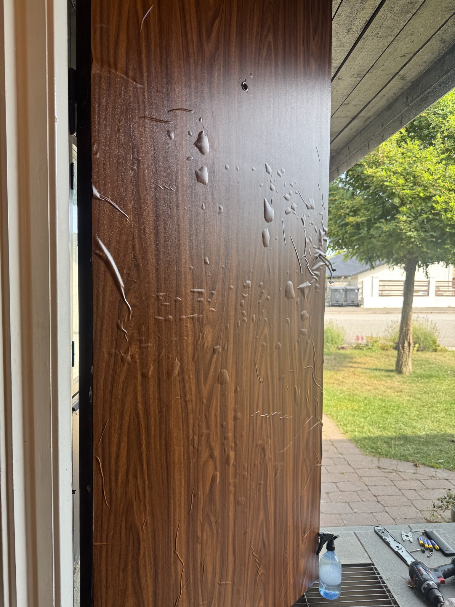 Inatt låg jag och filurade lite vad vi ska göra åt missfostret till dörr nu. Av någon anledning kom jag in på att klä in den i trä så den såg ut som tidigare säkerhetsdörren i lägenheten. Sagt och gjort, sambon jobbar ju och jag har semester så det blev ett besök på Bauhaus och köpa dekorplast.