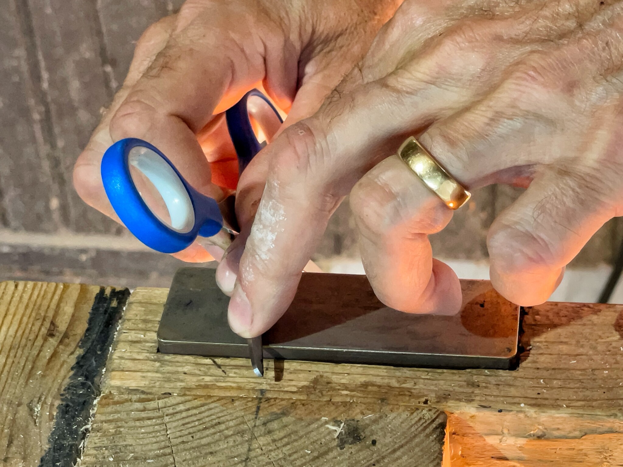 Här vässar jag en av döttrarnas saxar. Det är lätt att hitta vinkeln på de flesta saxar och man behöver inte använda kraft, bara att andas och dra åt ett håll några gånger.