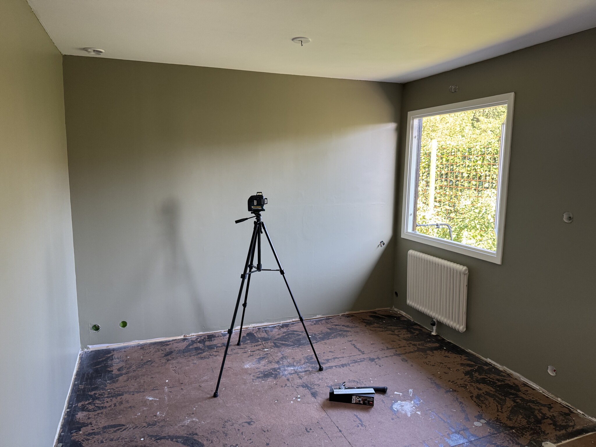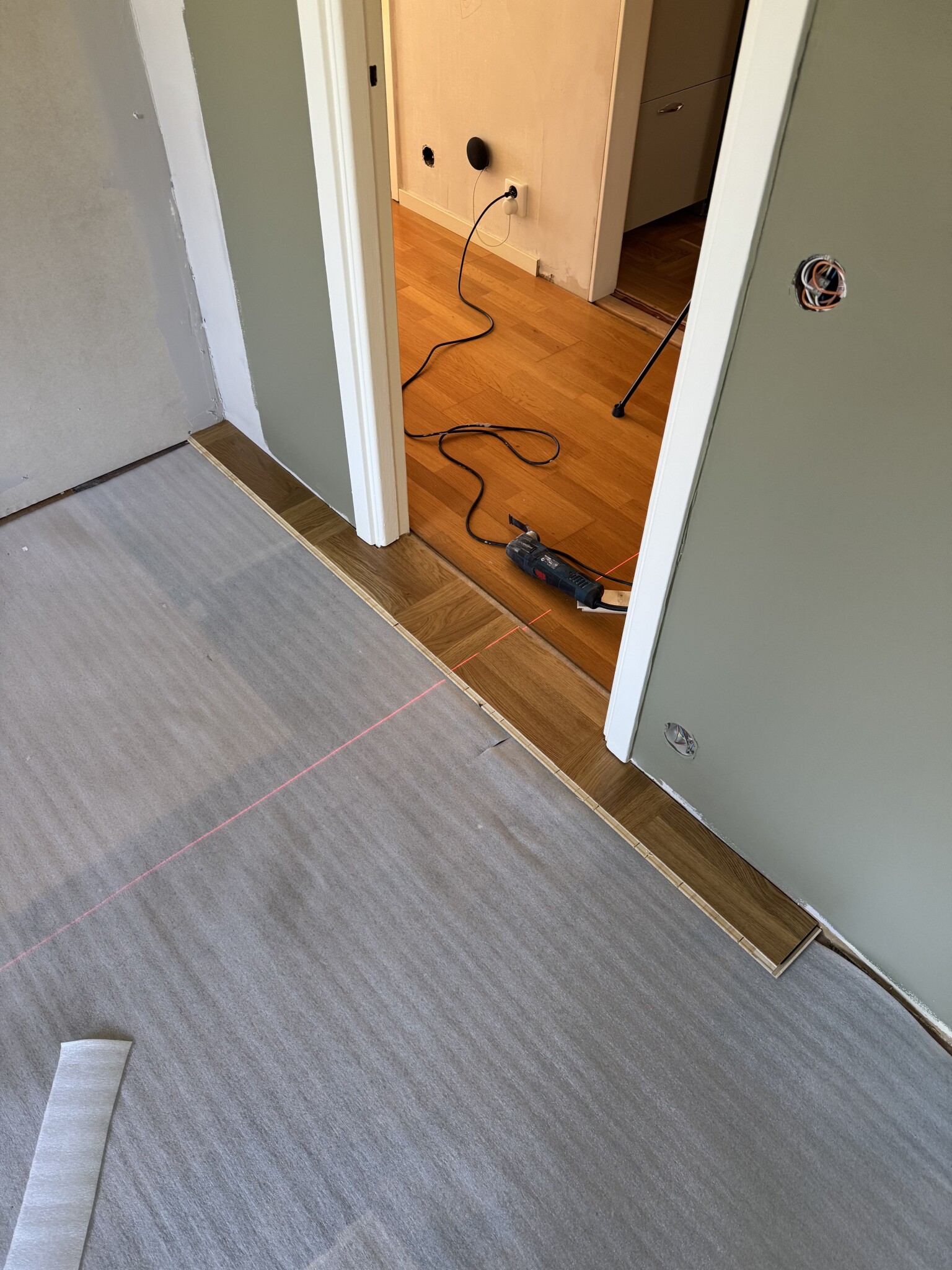 Ja det skulle läggas golv! Golvet heter Noble ek retro och ska läggas mösterpassat! Har det i de andra rummen vi har renoverar, ett golv vi tycker är bra och fint. Jag ville dock inte bara mönsterpassa det i bösrummet utan det skulle också mösterpassas mot köket! Sagt och gjort, storelasern fick hjälpa till!