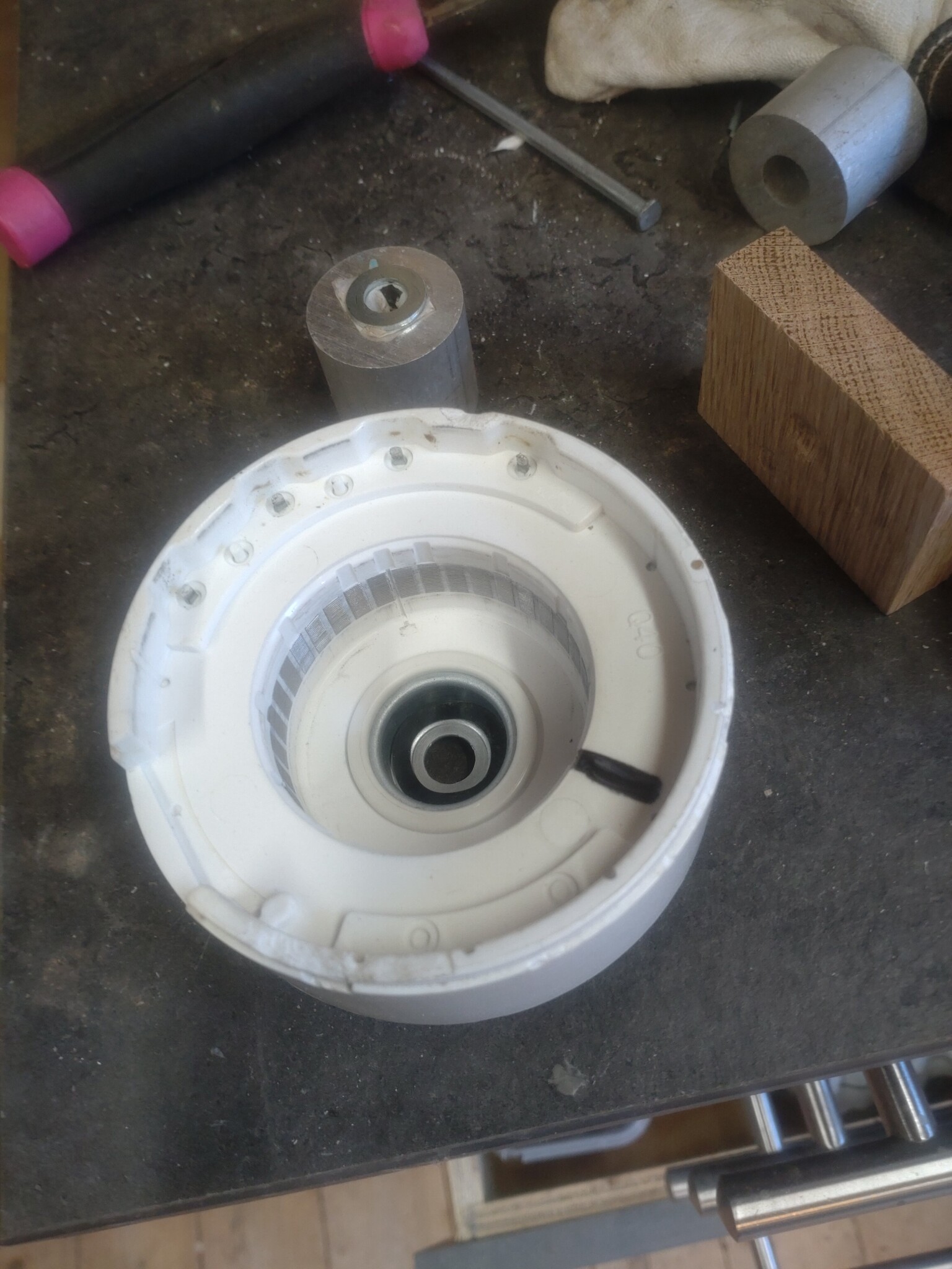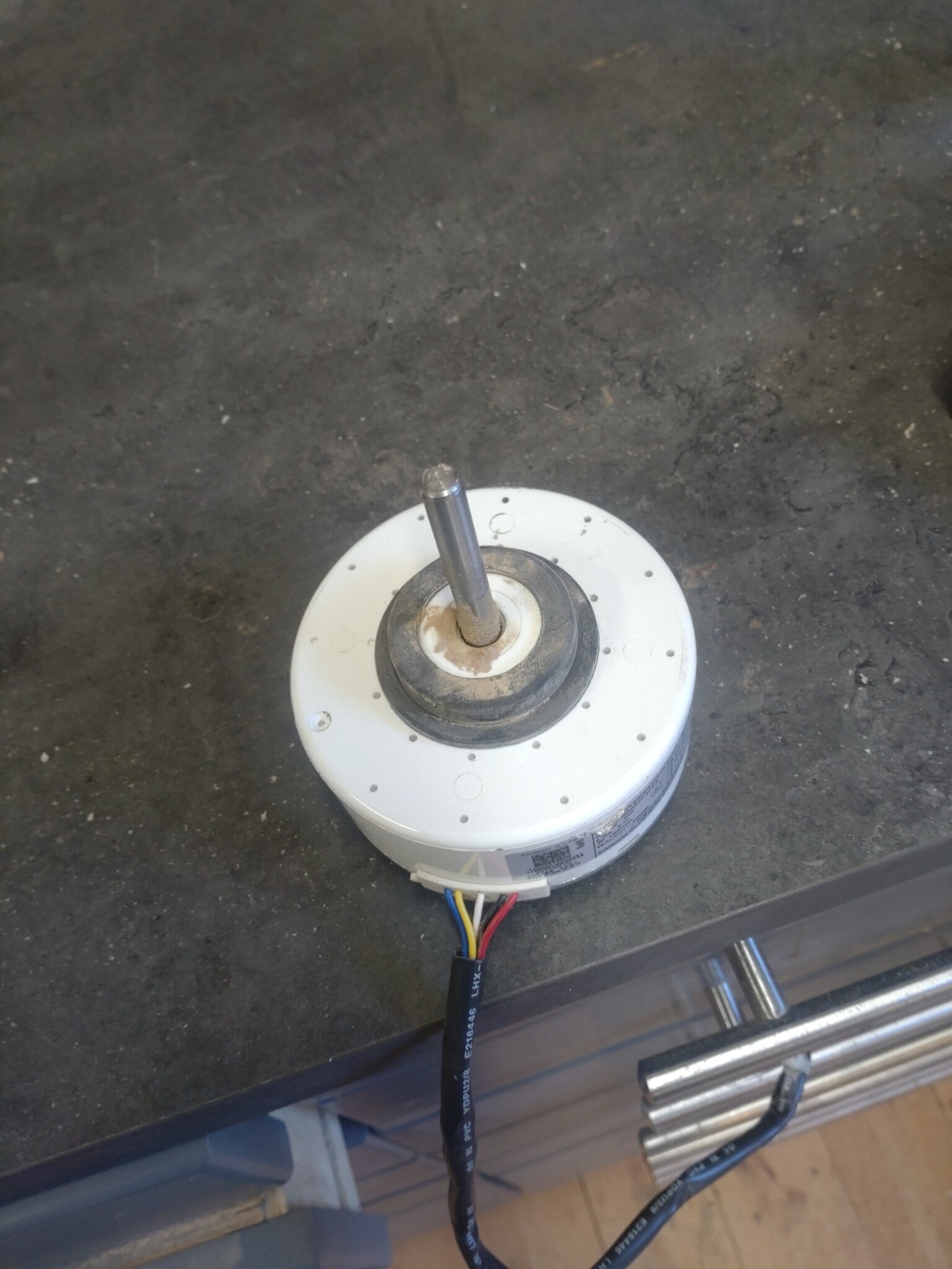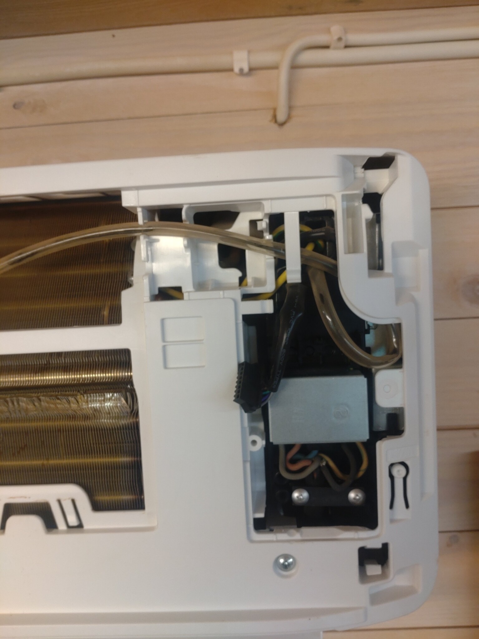 Bytt lager pÄ luftvÀrmepumpens innerdel i snickarverkstaden.
