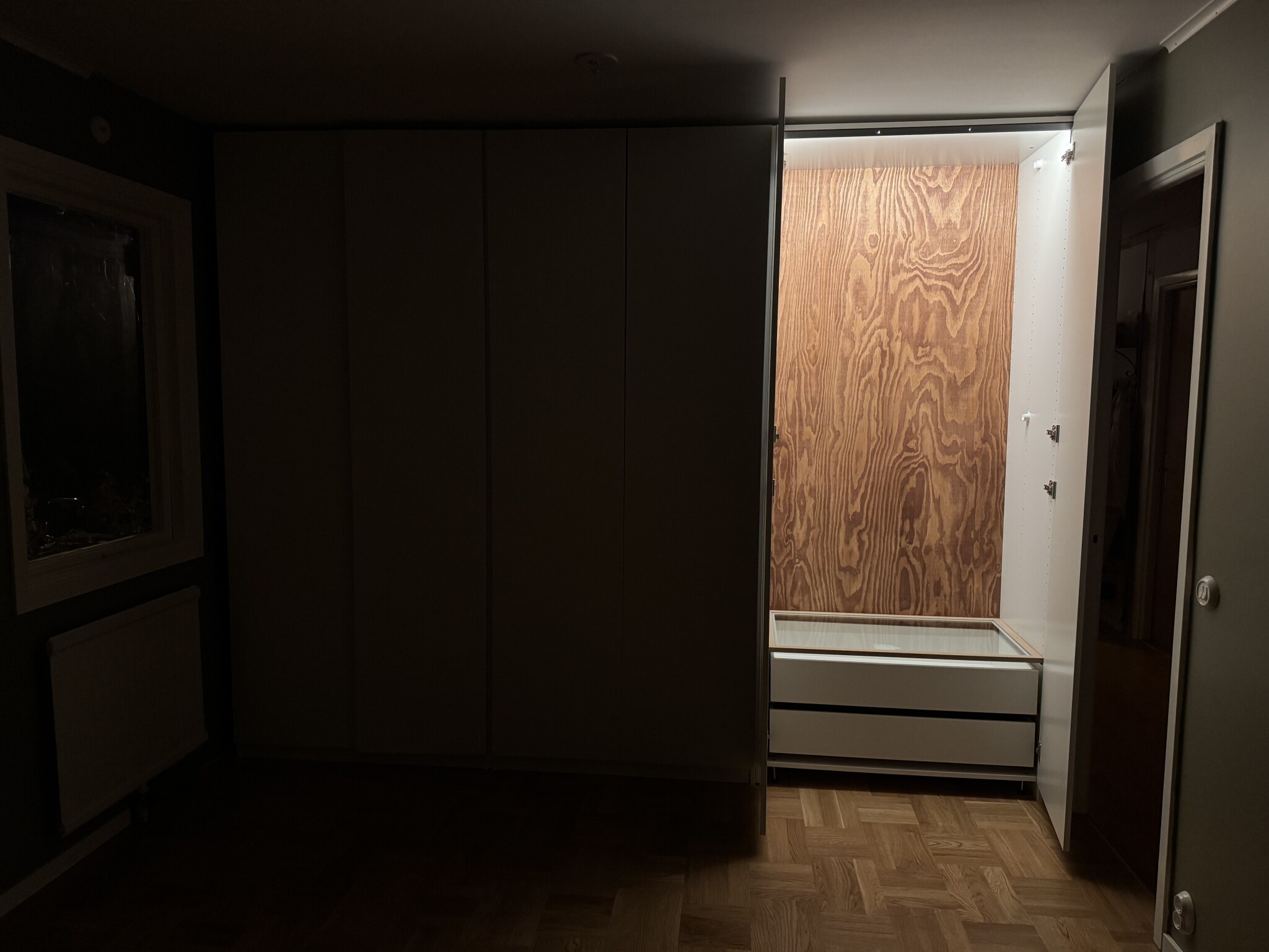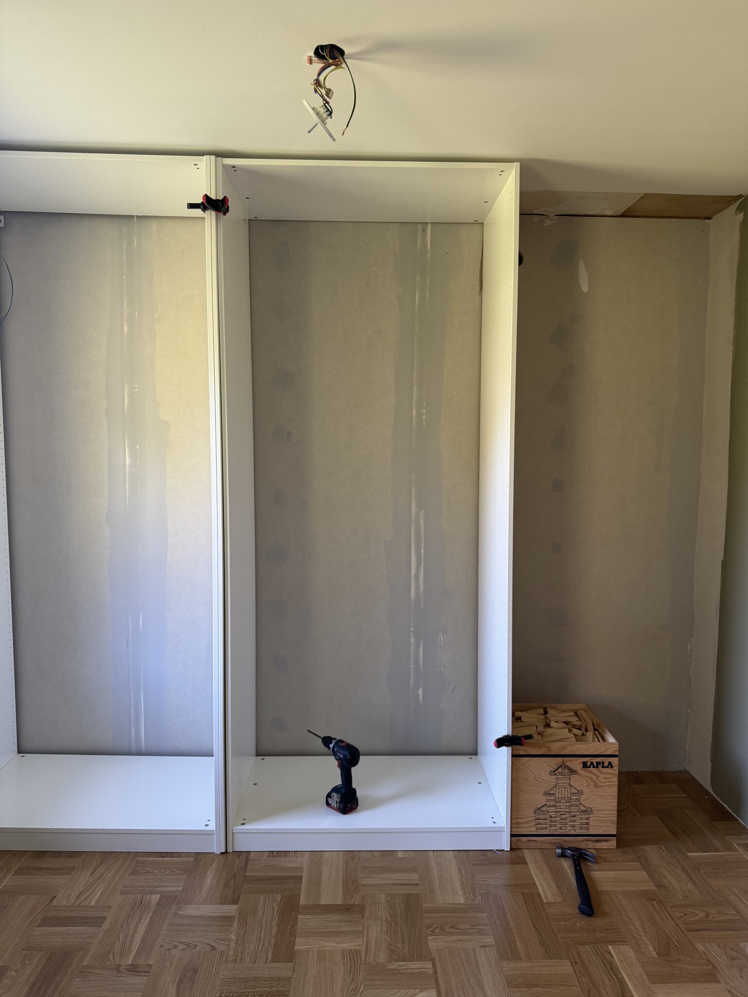 Idag har det skruvats dörrar och fixats med belysning/el. Garderoberna Àr uppskattningsvis 50% klara! Det som nu kvarstÄr Àr att sÀtta in all inredning (lÄdor, stÀnger osv) men framförallt justera dörrarnas gÄngjÀrn.. Hur noga man Àn Àr sÄ blir de snea och vinda och Àr det inte garderoben sÄ Àr det pga golvet. Aja, det blir morgonens pyssel!