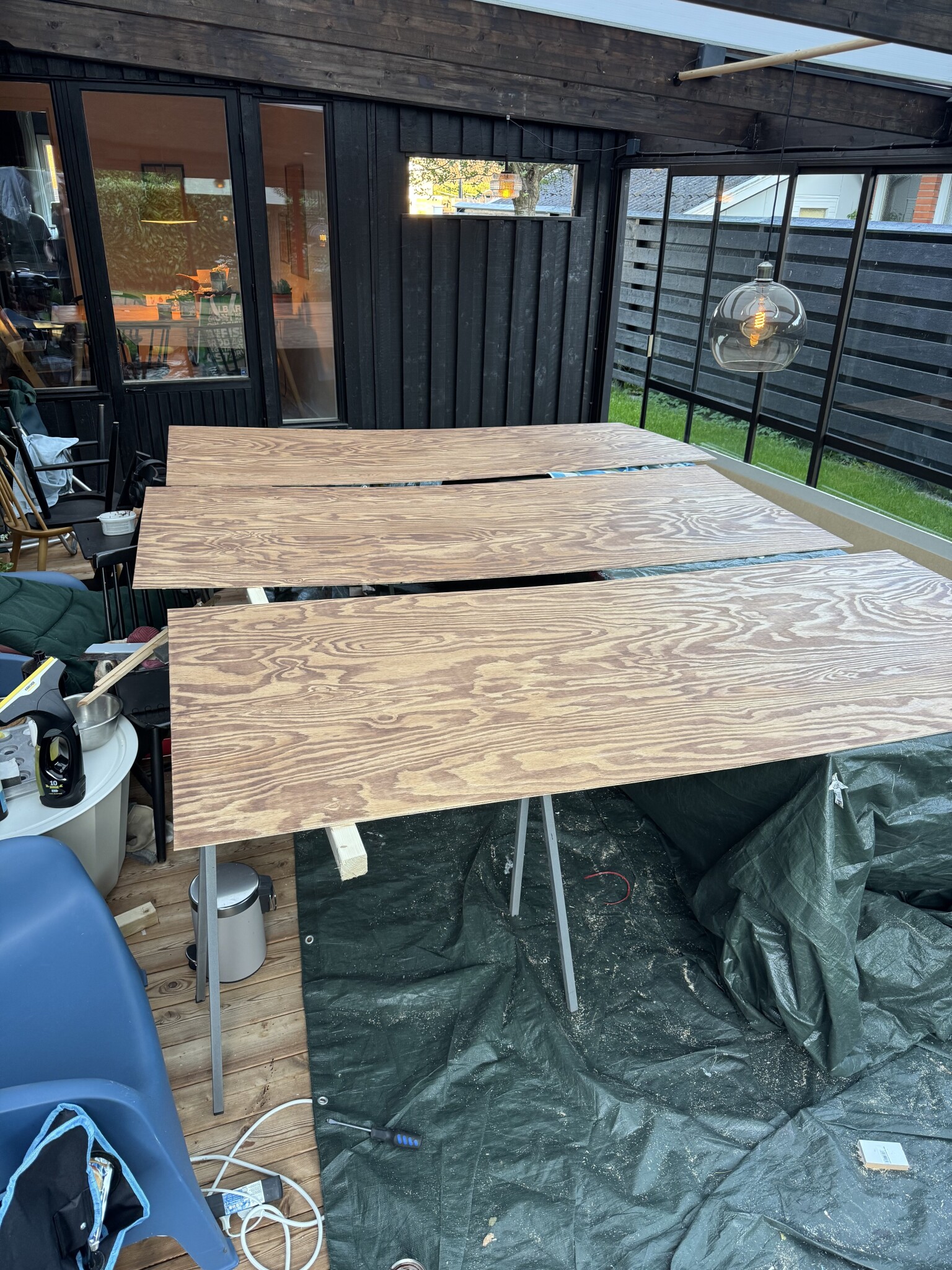 Eftermiddagen/kvÀllen gick Ät till att sÄga till, slipa och oljebetsa plywoodskivorna som ska sitta som bakstycke!