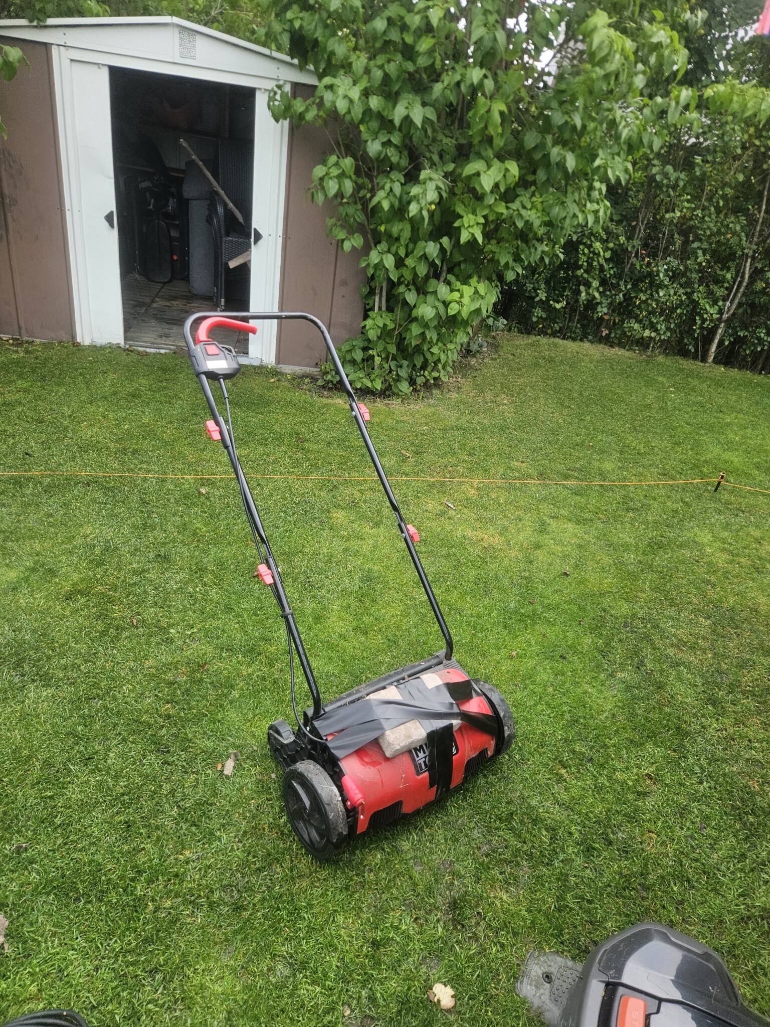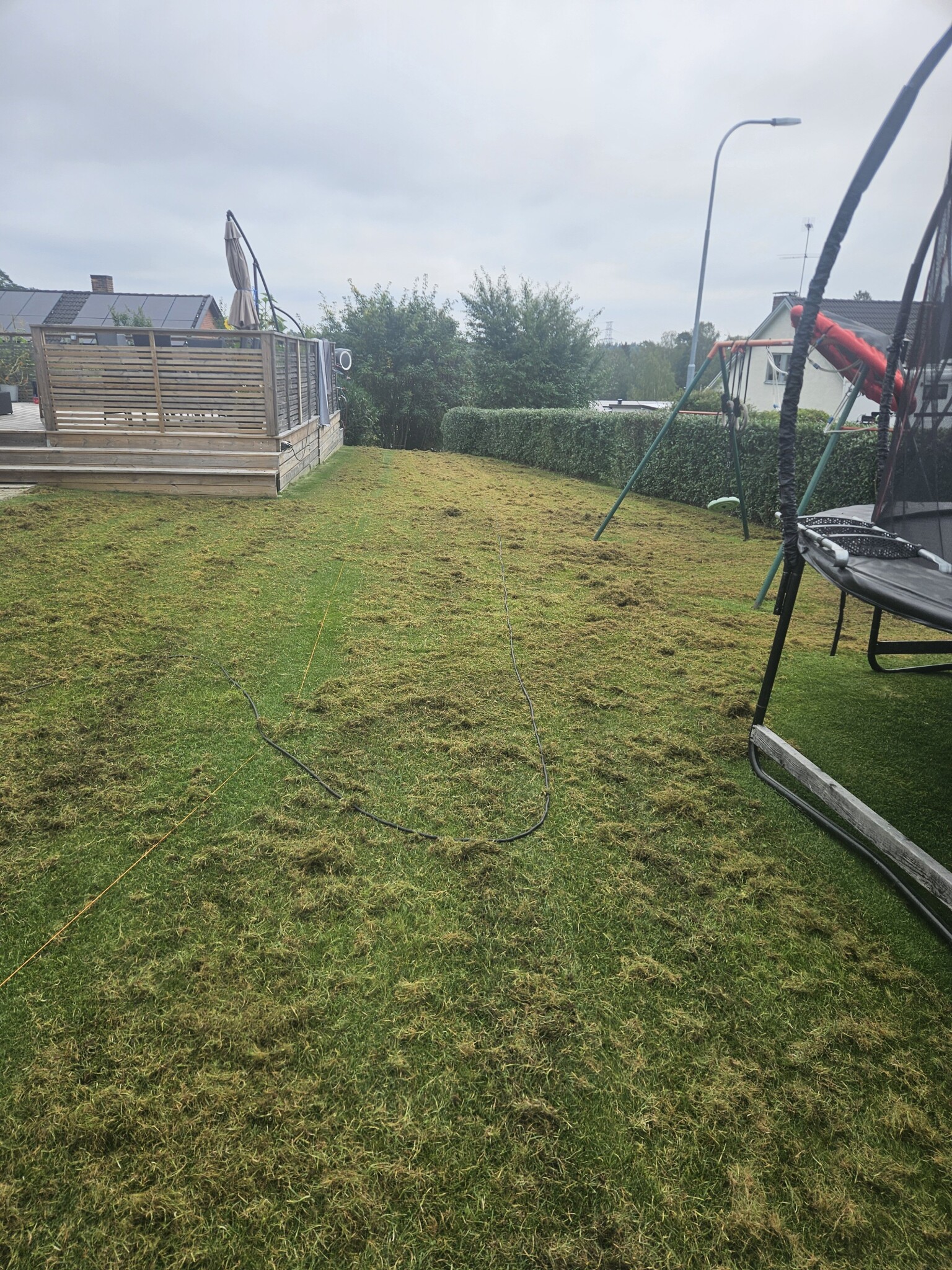 Klippt gräs, vertikalskurit, stödsått och toppdressat ca 300 kvm gräsmatta.