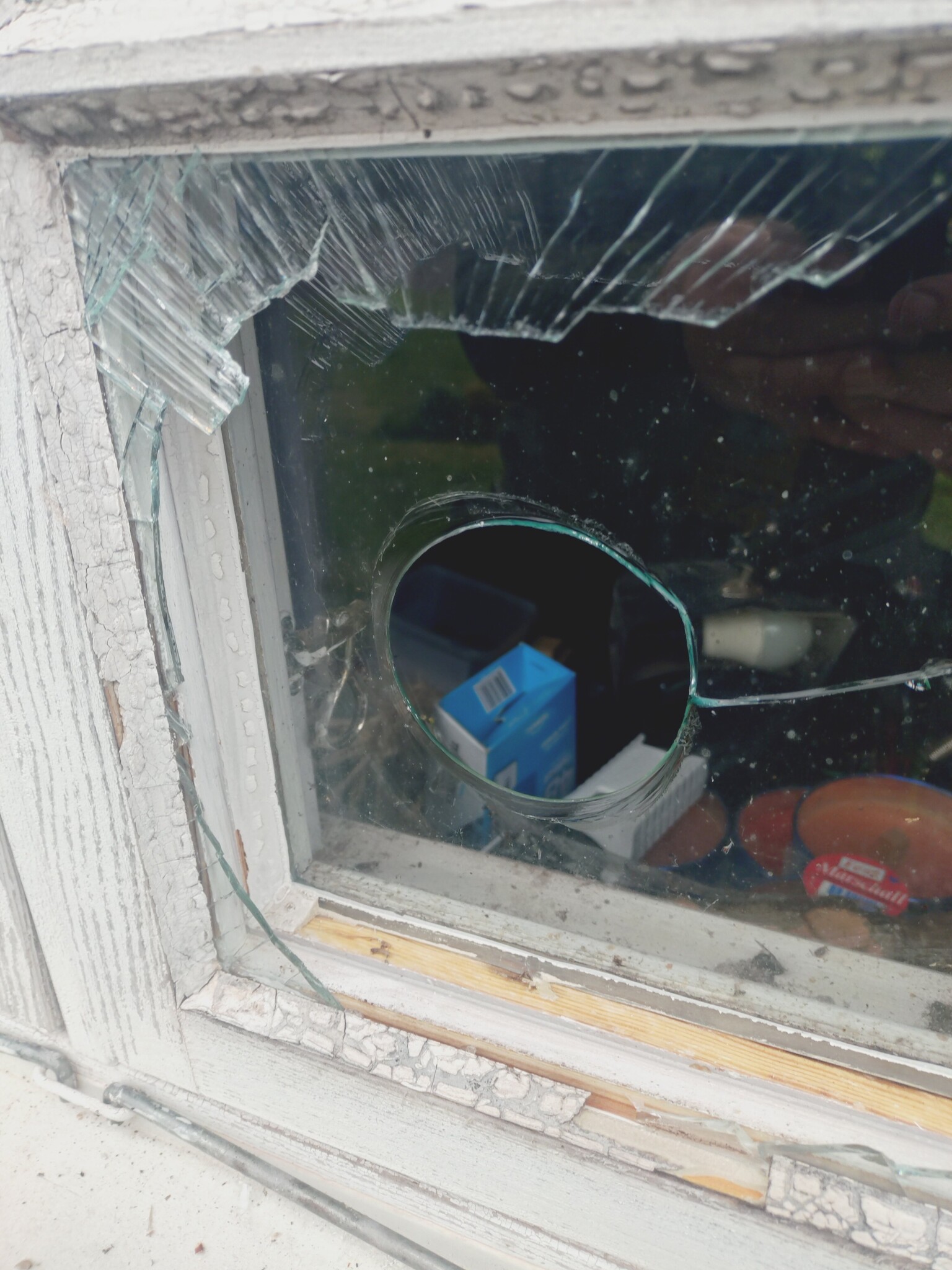 Det måste ha varit något klassat glas i innerbågen för den var svårknackad och dessutom blev det ett runt hål...