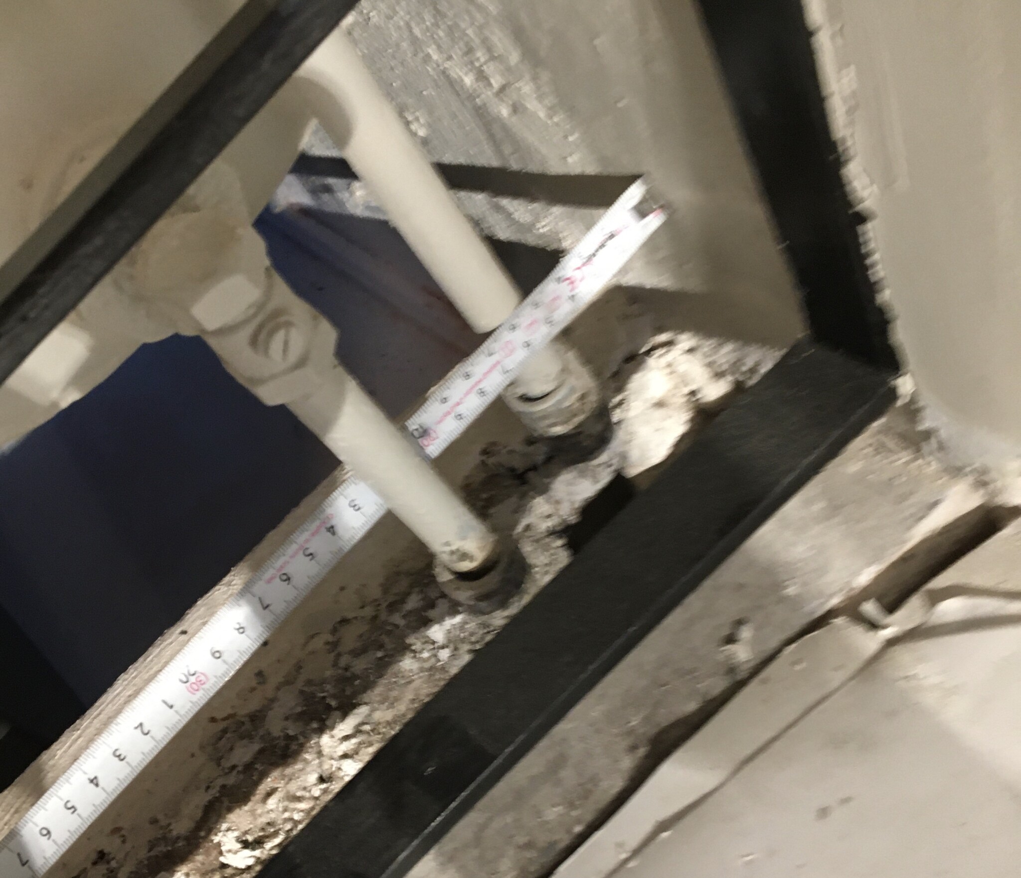 Standard rörmanschetter är groteskt fula och kommer peka ut felen mer. Återstår att göra egna i samma material som golvet.