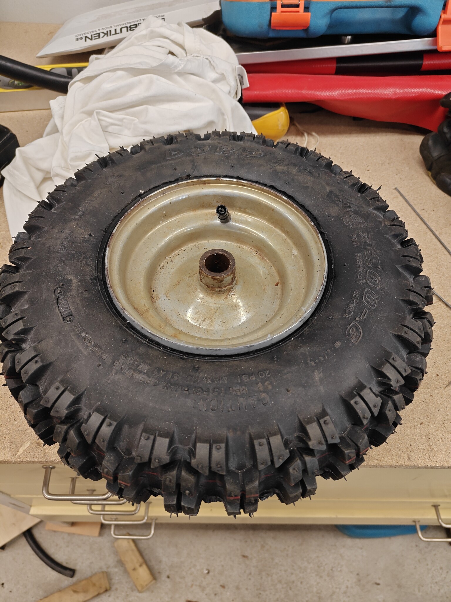 Nytt däck beställt och krängt på fälgen. Såpa, däckjärn och kompressor fick hjälpa till