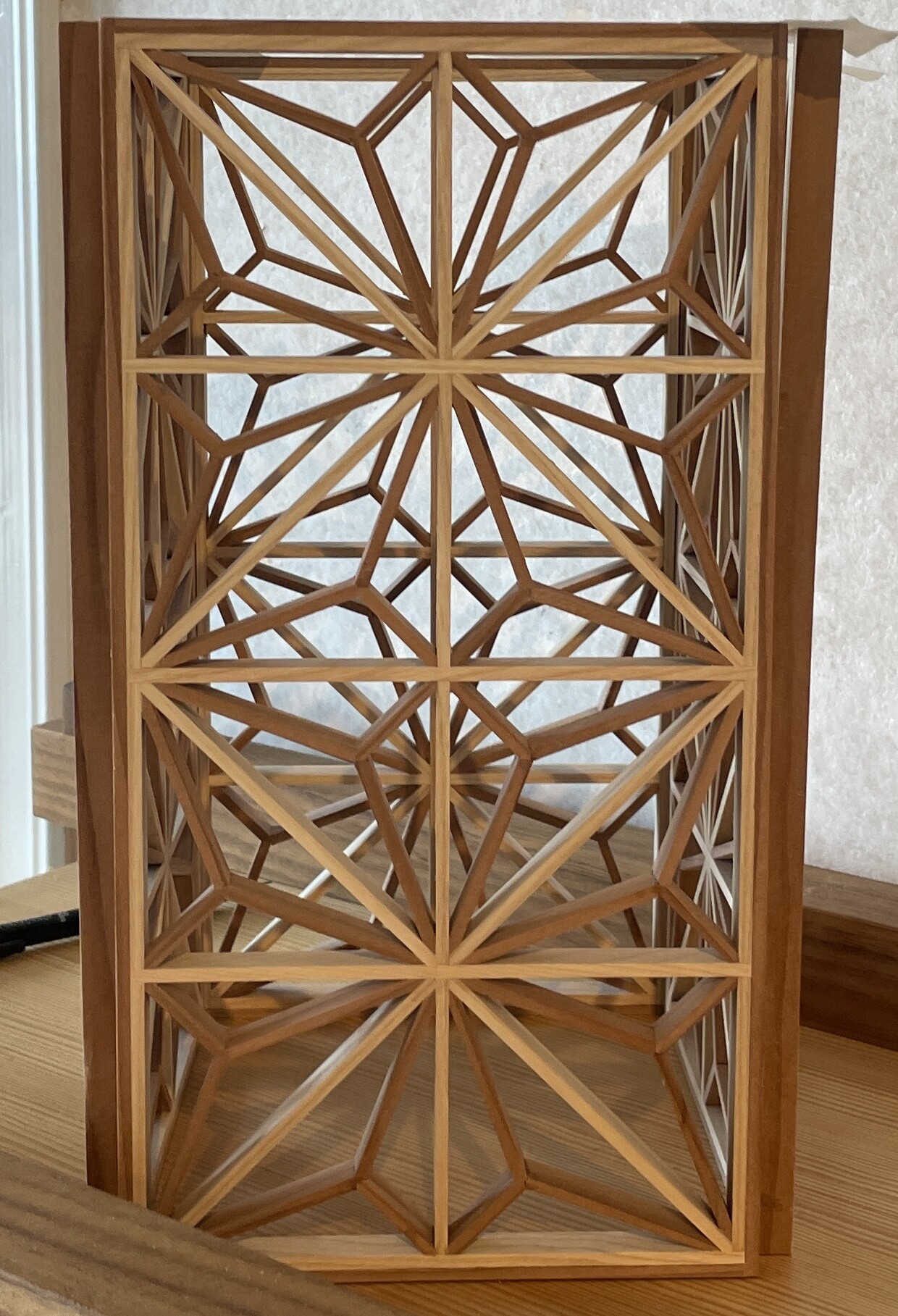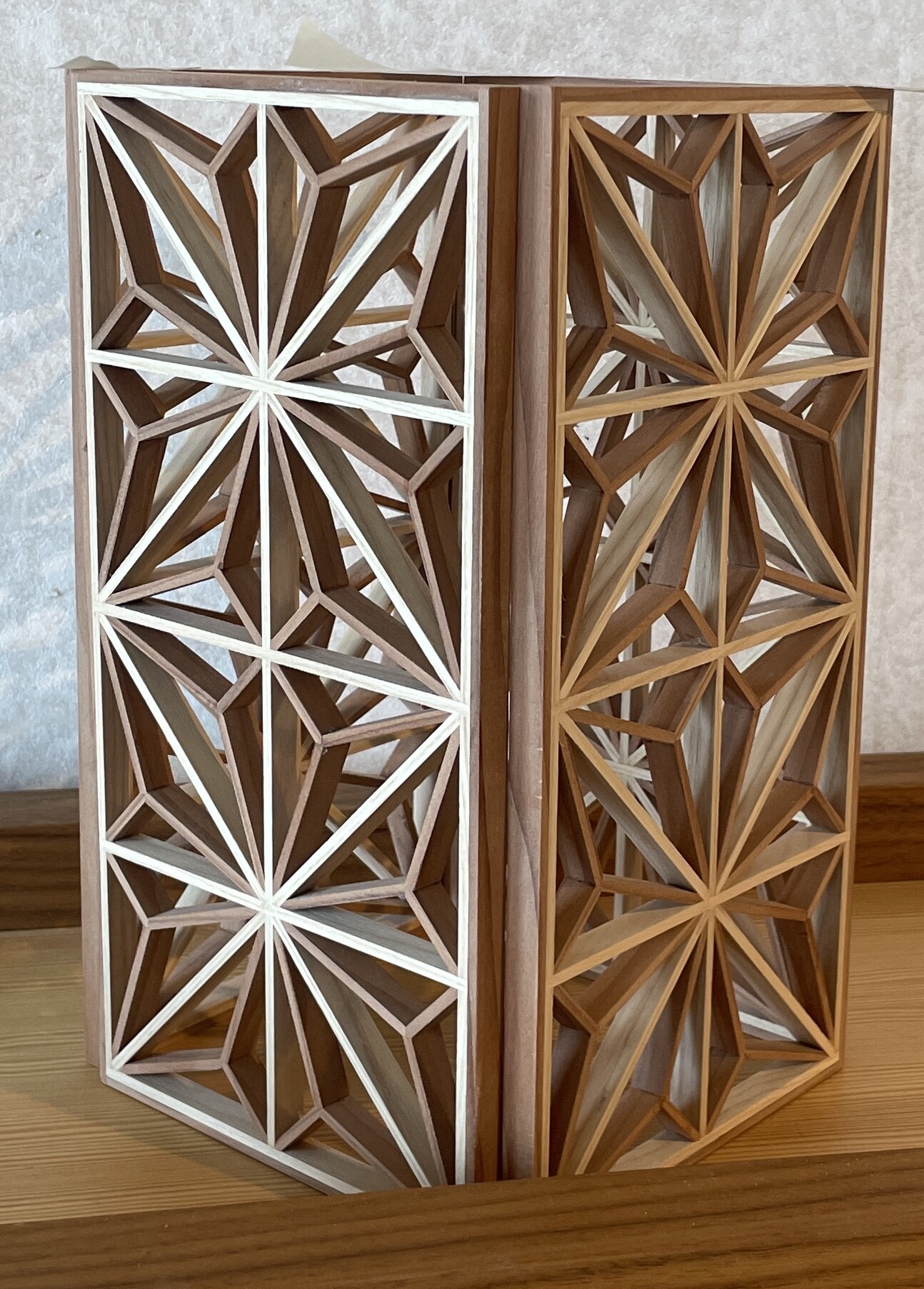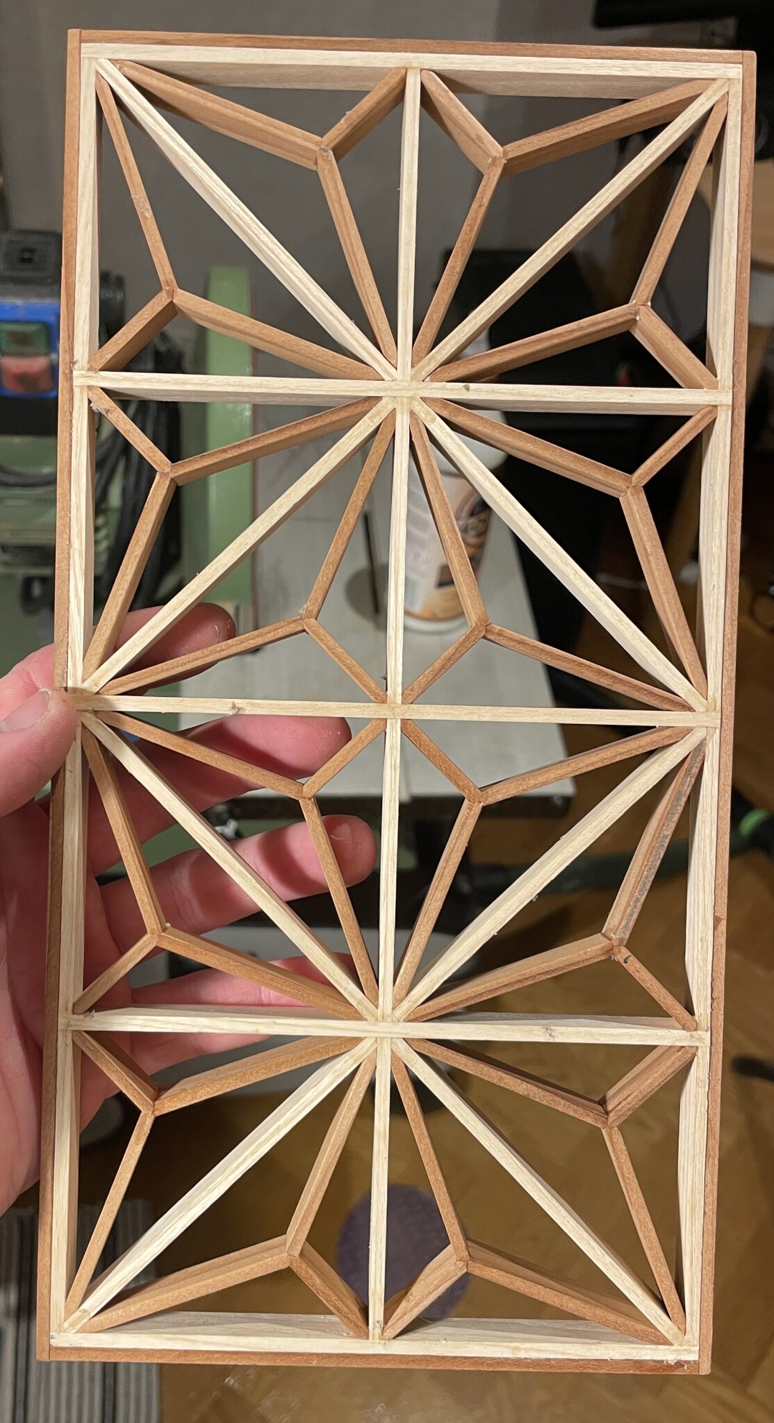 Ska bli kumiko-lyktor. Träslagen på kumikon är ask och redwood. Ett slags försök att göra lyktor med julfärger. Nästa steg blir stommarna som kommer vara i al. Det mest tidskrävande är dock bakom mig nu, haha.