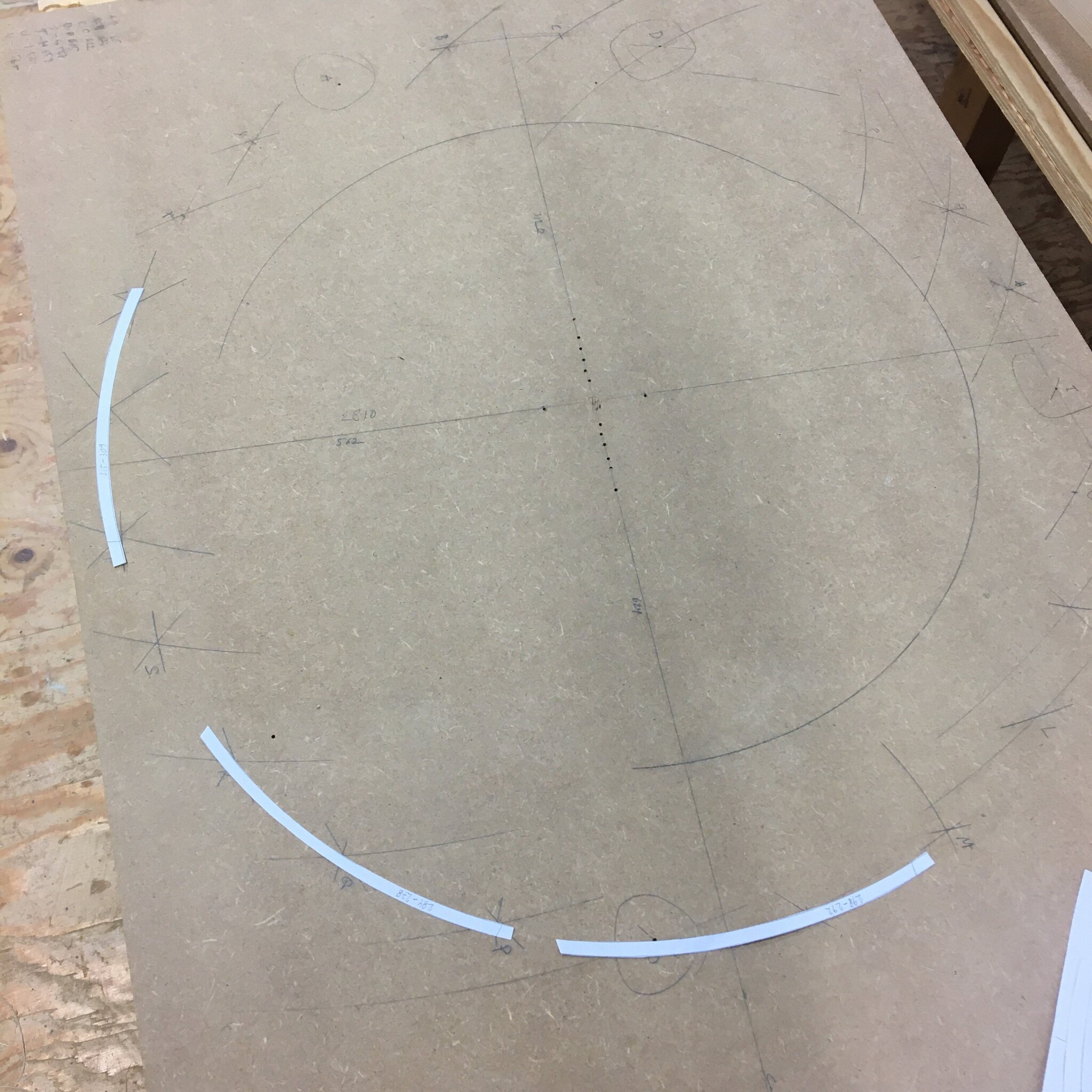 Började på ritningsstadiet. Jag kan rita i CAD. Ser fördelarna. Men om nu upplösningen på måtten inte medger mer än centimeterprecision. Då går det fortare på en skiva i skala 1:10. Kunde se att det såg rimligt ut. Ta mått på längden och tvären av ovalen. Nu antog jag att det skulle gå att göra med tre olika radier på listerna. Max, min, och mittemellan. För att testa rimligheten så tog jag hjälp av avancerade redskap (A4papper, passare och sax) och gjorde perfekt skalenliga lister att testa med.
