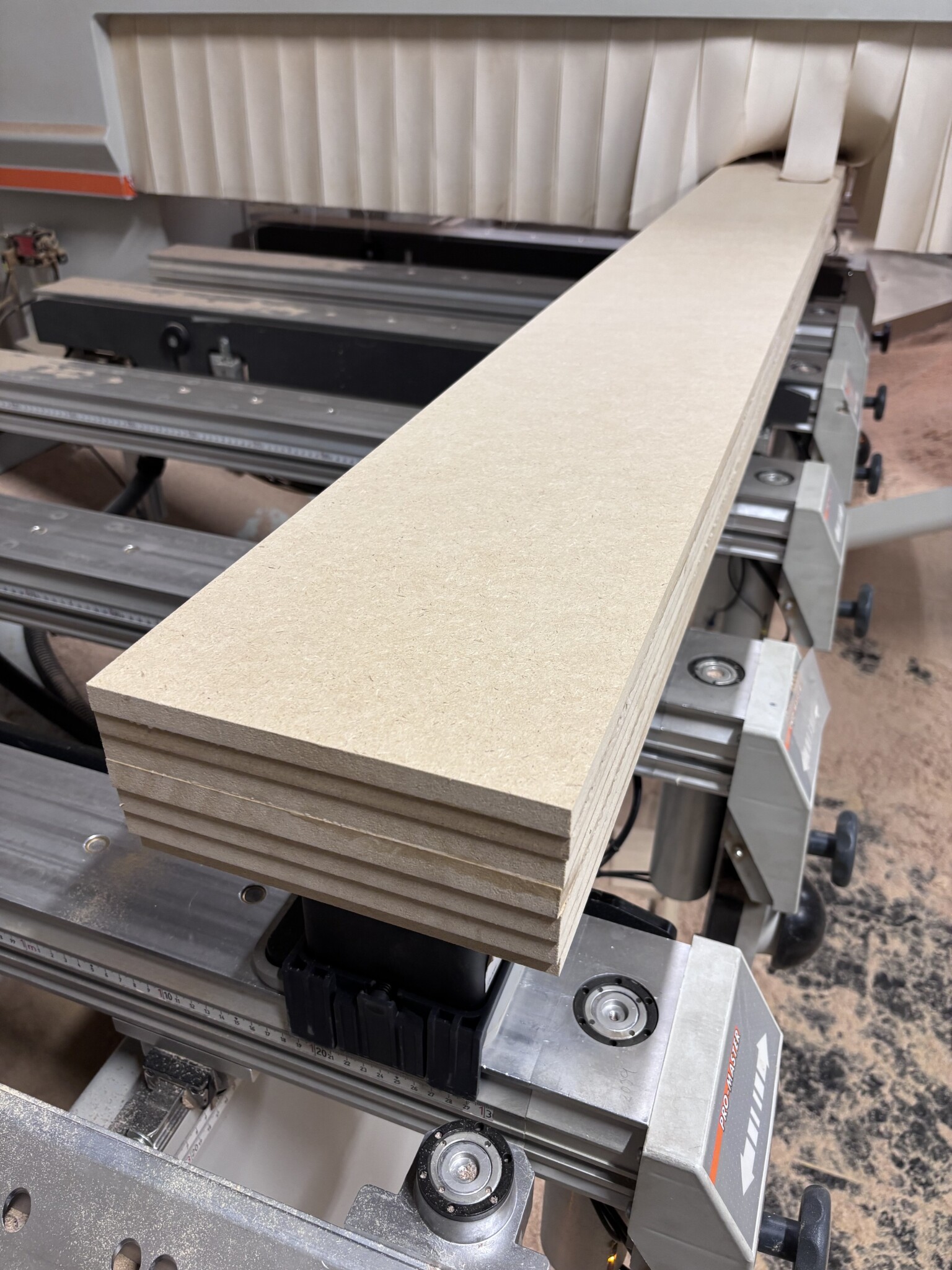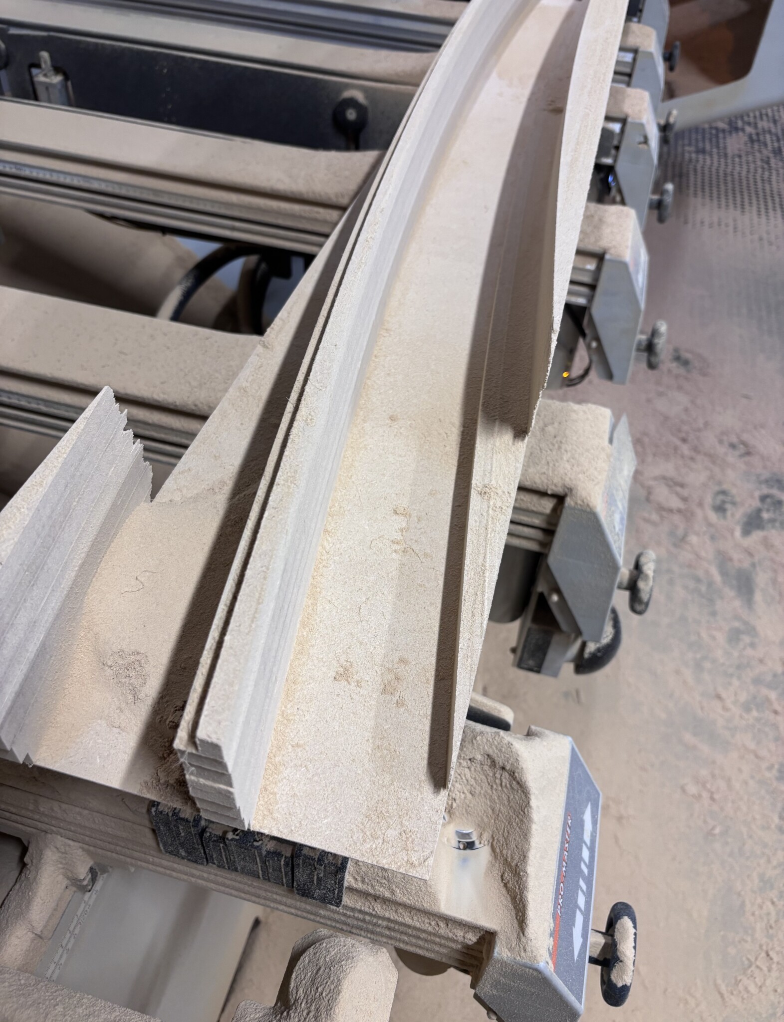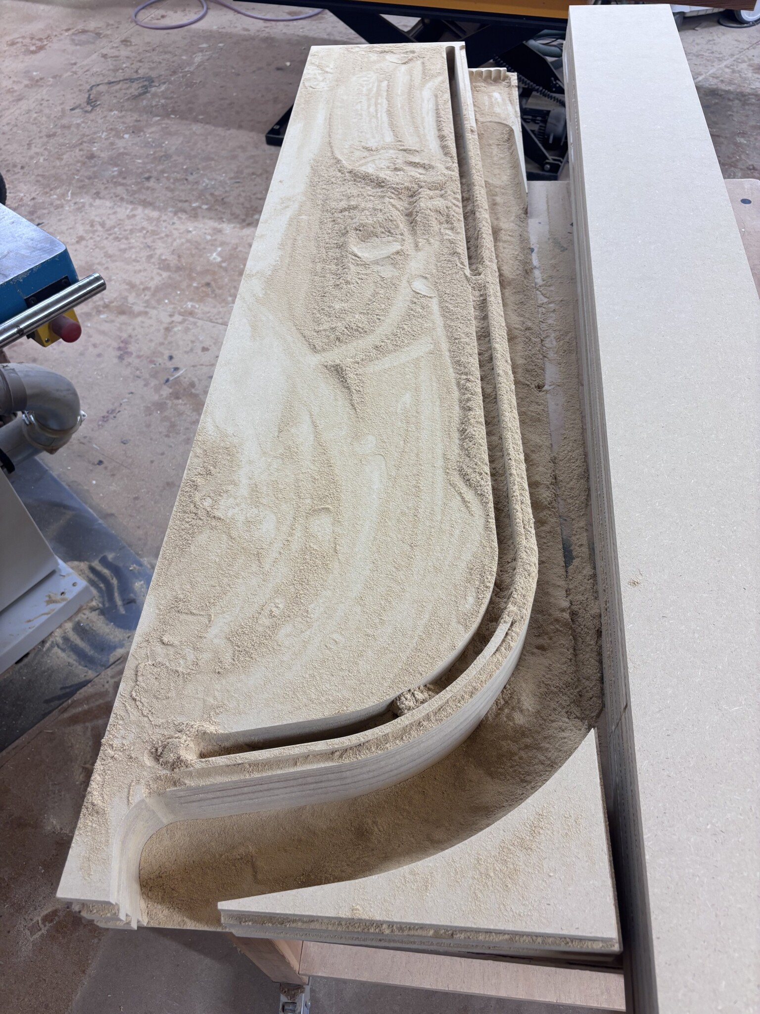 Limmade ihop 7 lager tricoya för att fräsa fram svängda socklar med ”shadow gap” till en bar. Socklarna ska sen kläs med svartpatinerad plåt.