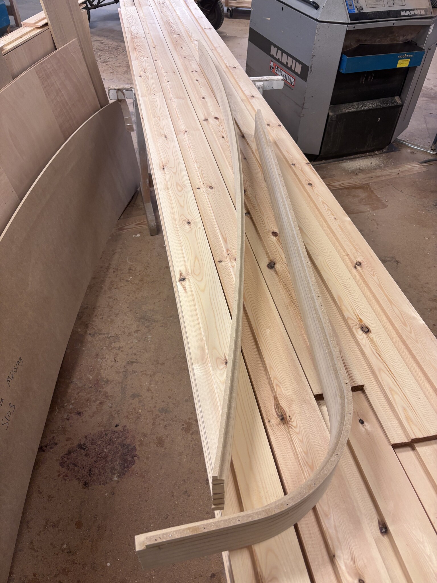 Kunde jag gör mallar till tre radier. Avslutade gårdagen med att hyvla fogarna och grovsåga listerna i bandsågen.