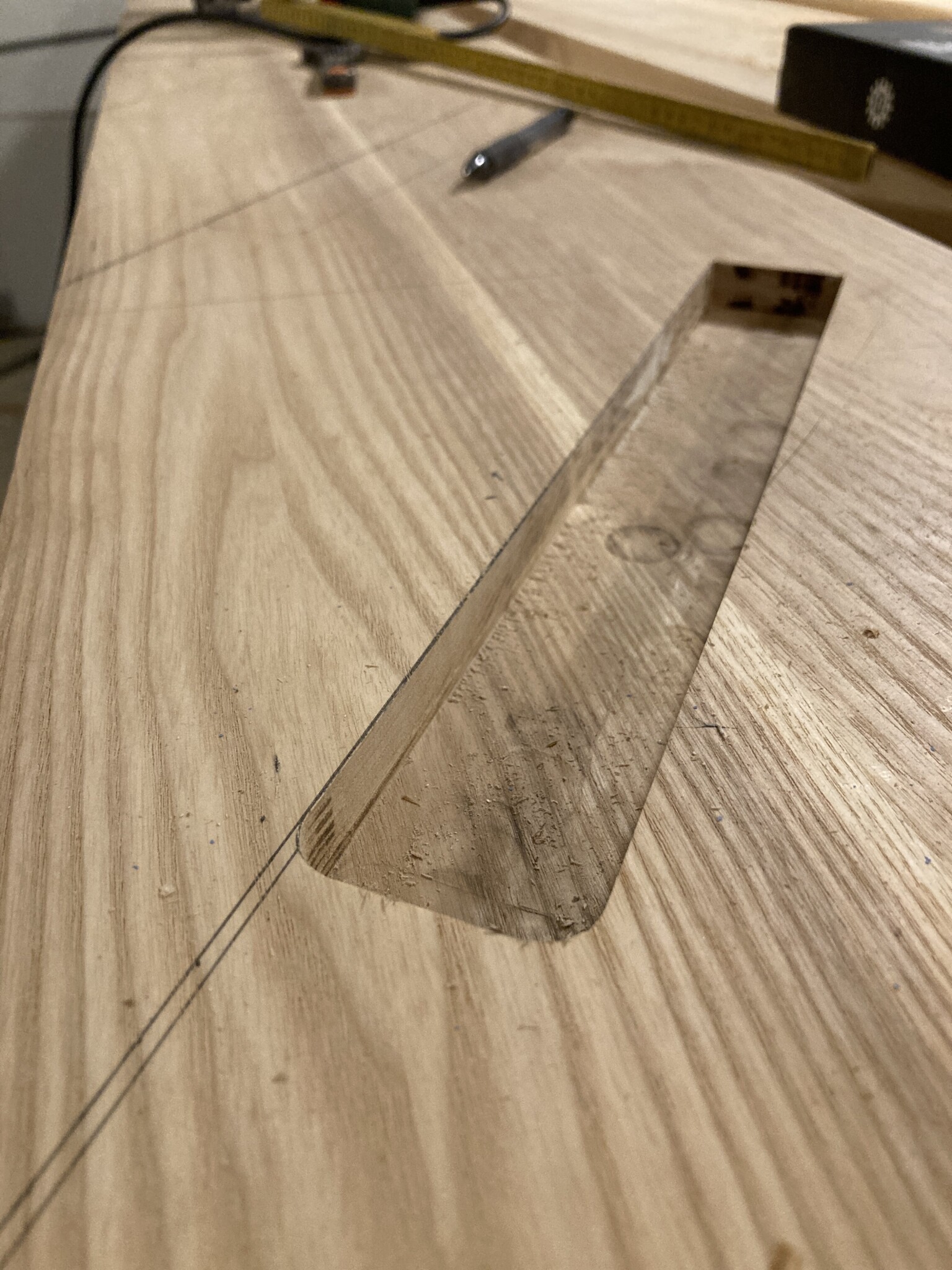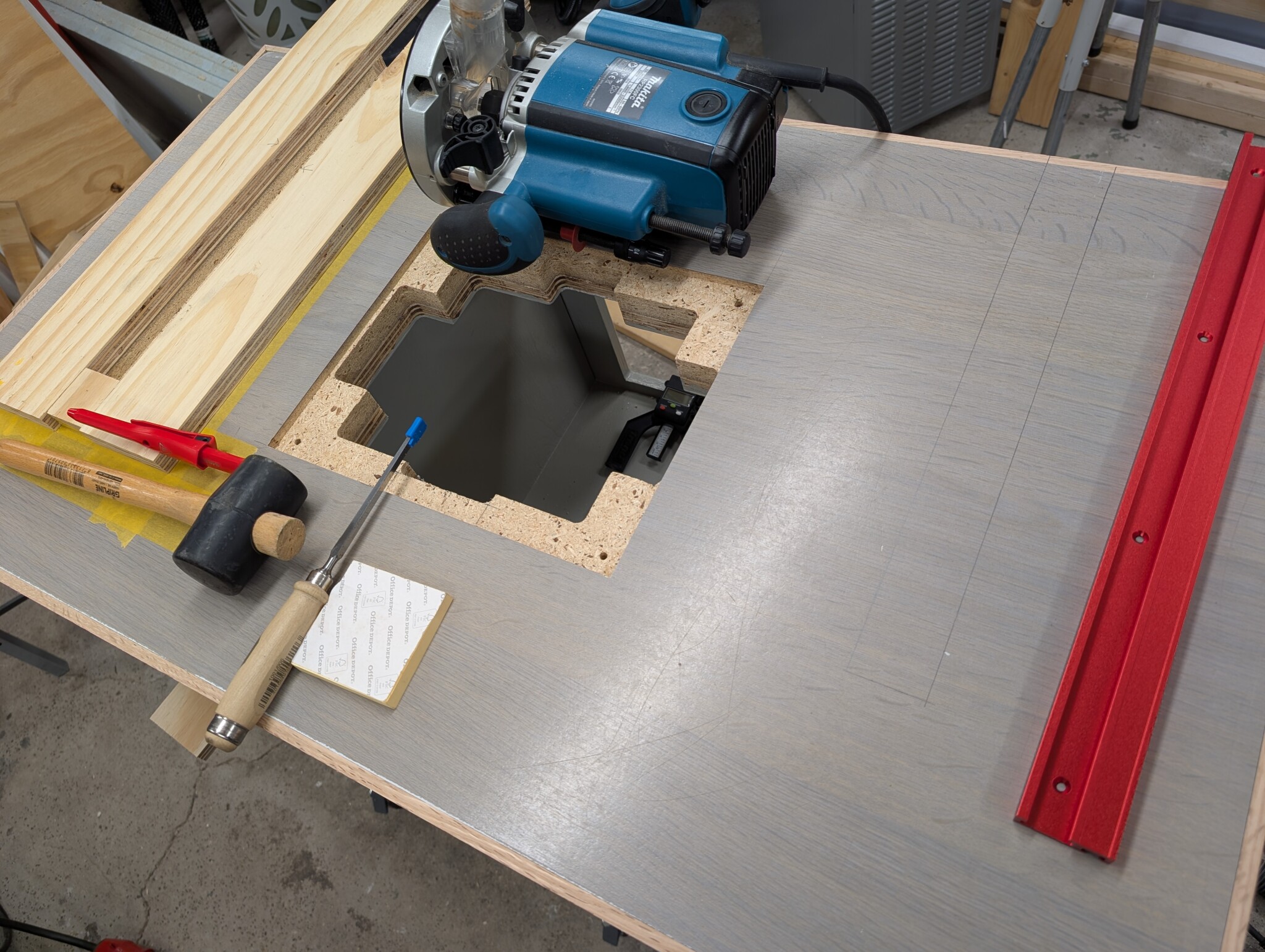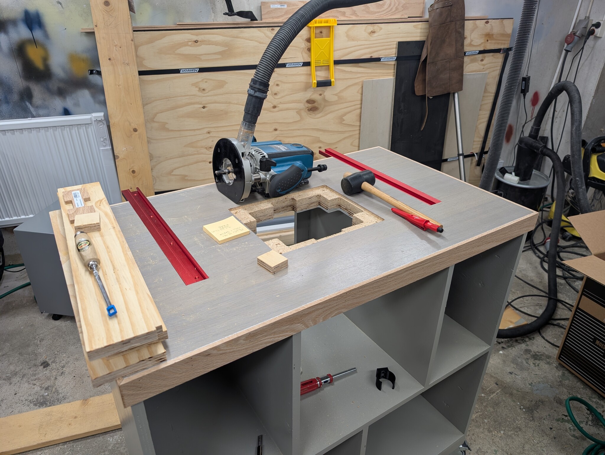 Har fräst spår för skenorna som ska hålla ett anhåll på fräsbordet.