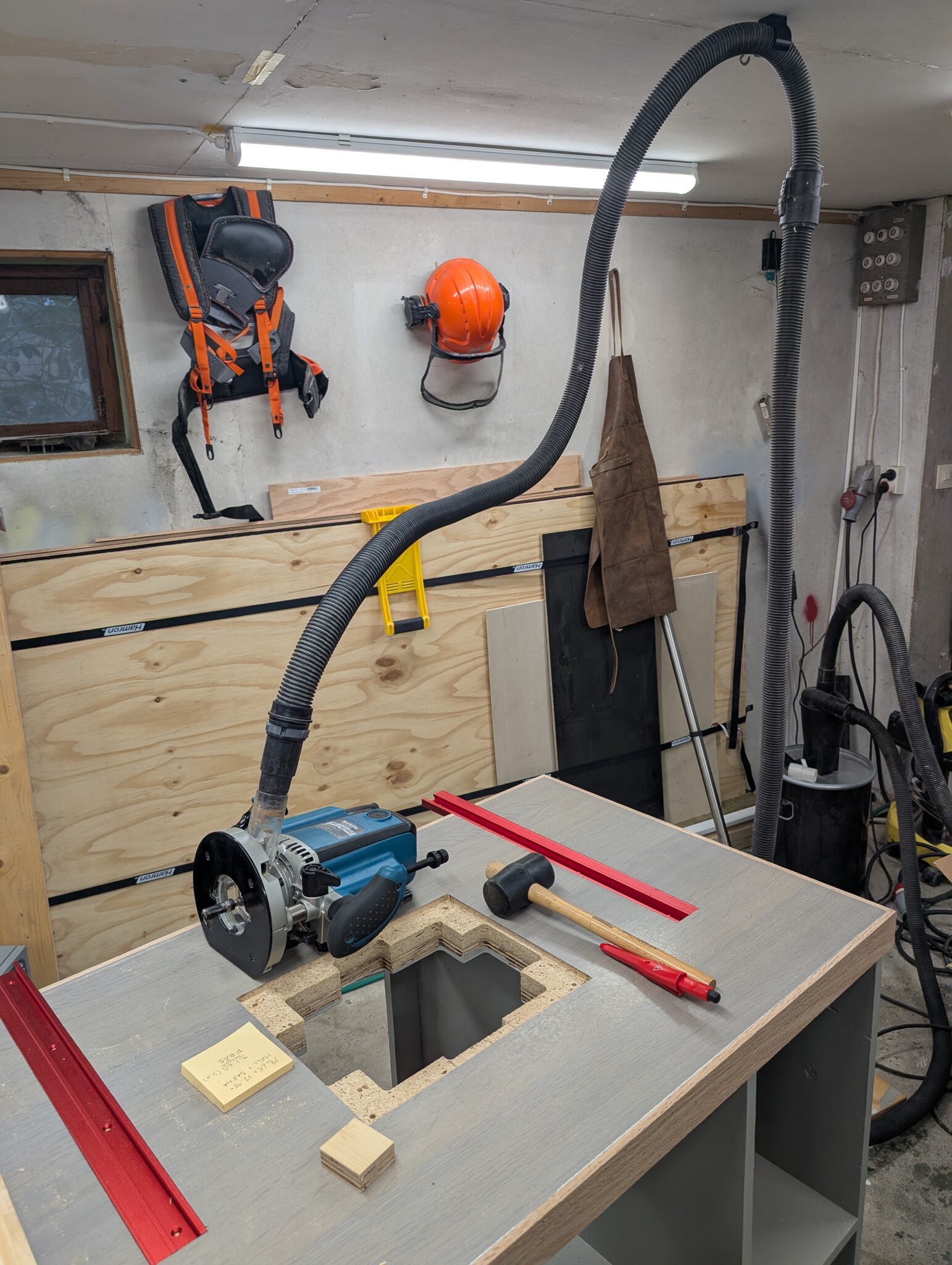 En annan sak som stört mig är att slangen från groven tar i kanten på skivor och bord. Det skapar motstånd i verktygen som jag inte alltid förstår att det beror på just slangen. Testade att 3D-printa en hållare och montera i taket så att jag kan snäppa fast slangen i och det fungerade faktiskt väldigt bra.