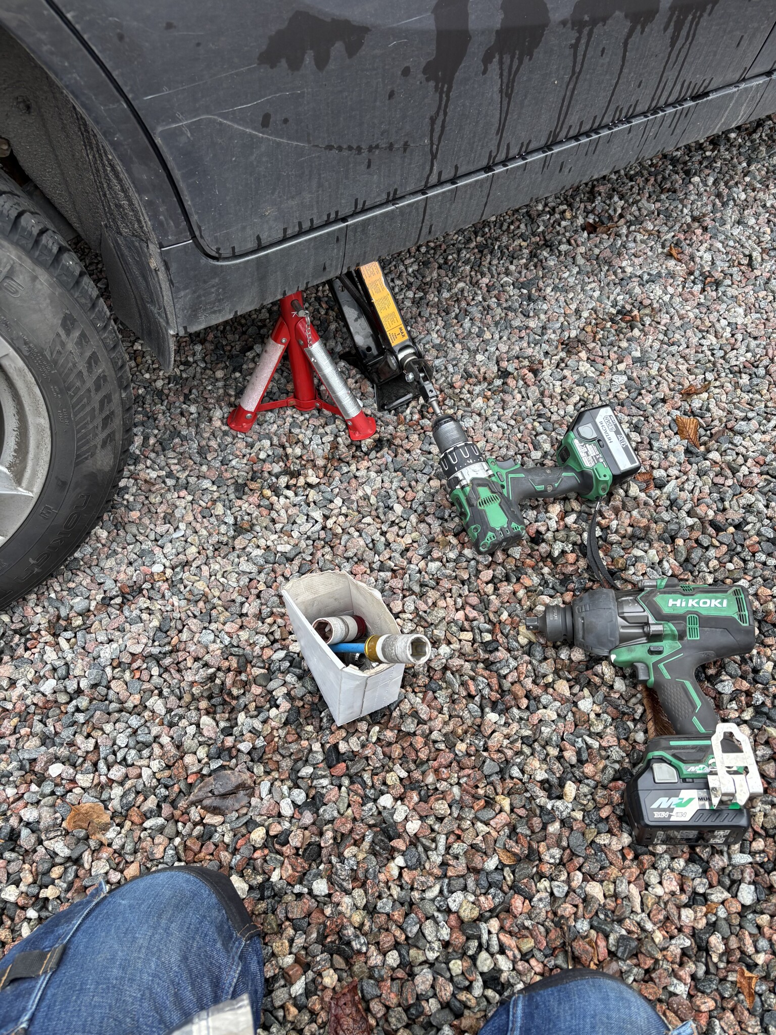 Däckbyte är trist så bra om det går snabbt. 15 min för att skifta plus 10 för att plocka fram och bort däck och verktyg känns överkomligt. Nytt för i år är hexfäste till saxlyften som bidrog med ett gäng minusminuter jmf med min vanliga domkraft.
