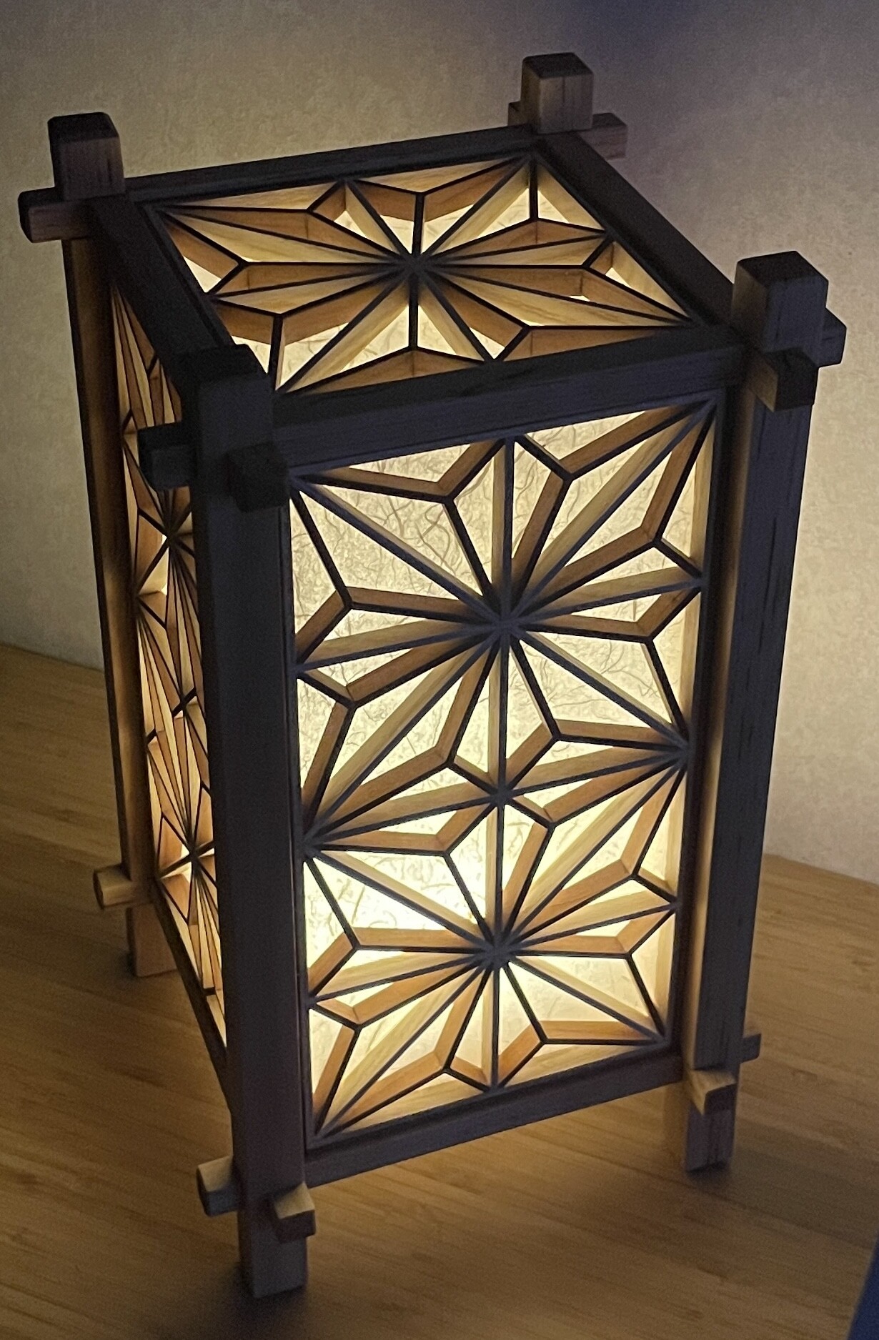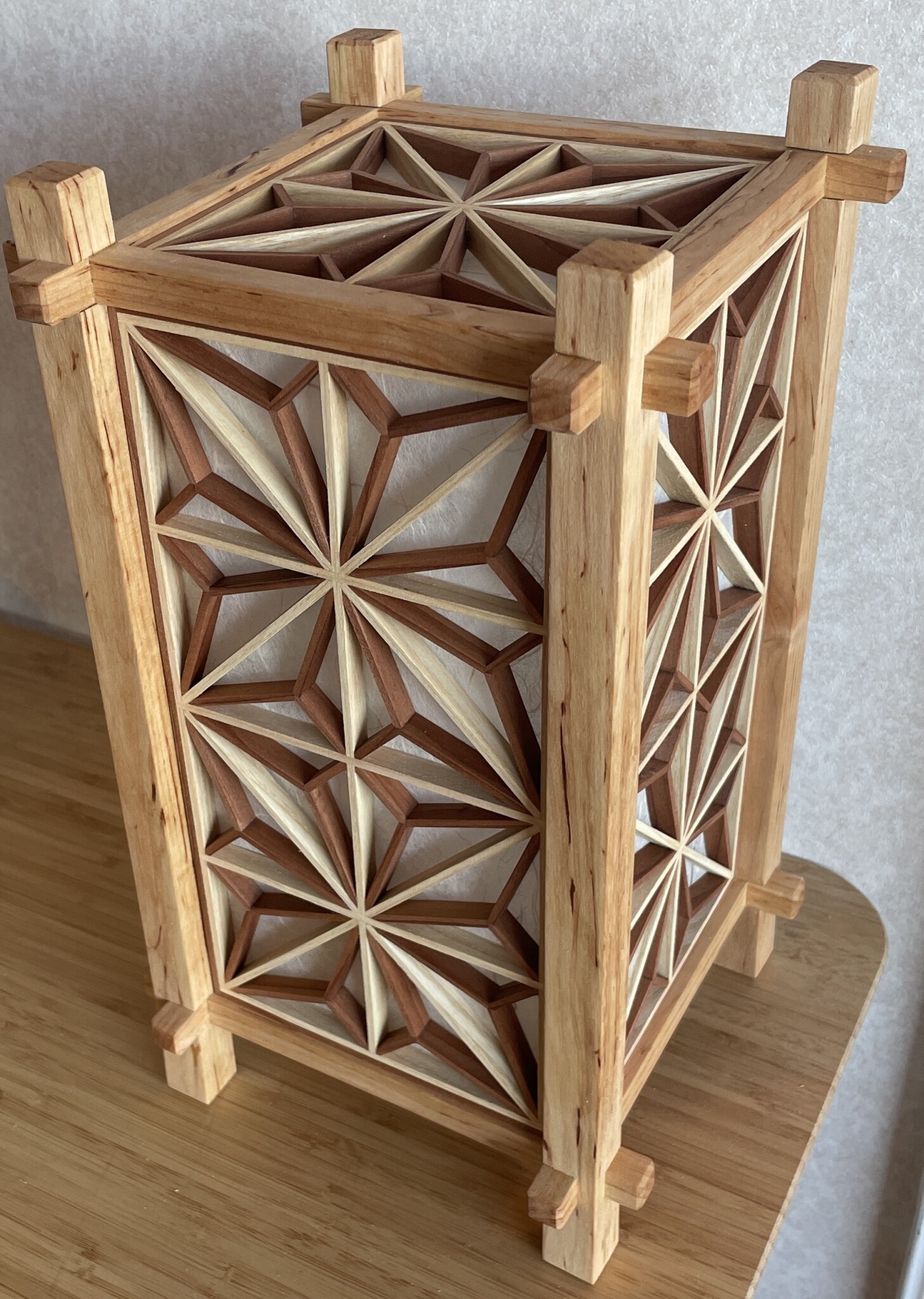 Andra klar. Ändra designen genom att även ha kumiko som ”lock”. Står en batteridriven nattlampa i lyktan. Ska nog ändra det och vira en ledstrip runt en 30mm rundstav(har många liggandes) för att få ett jämnare ljus.
