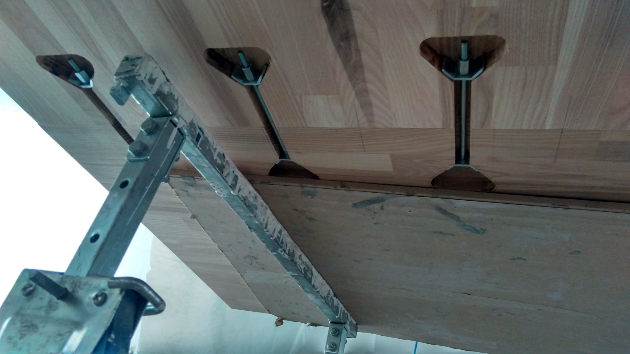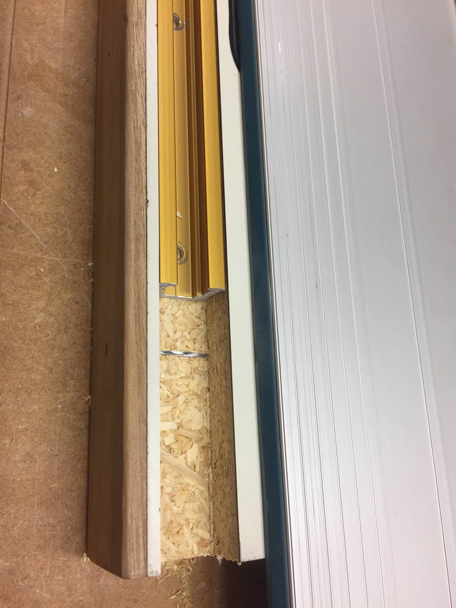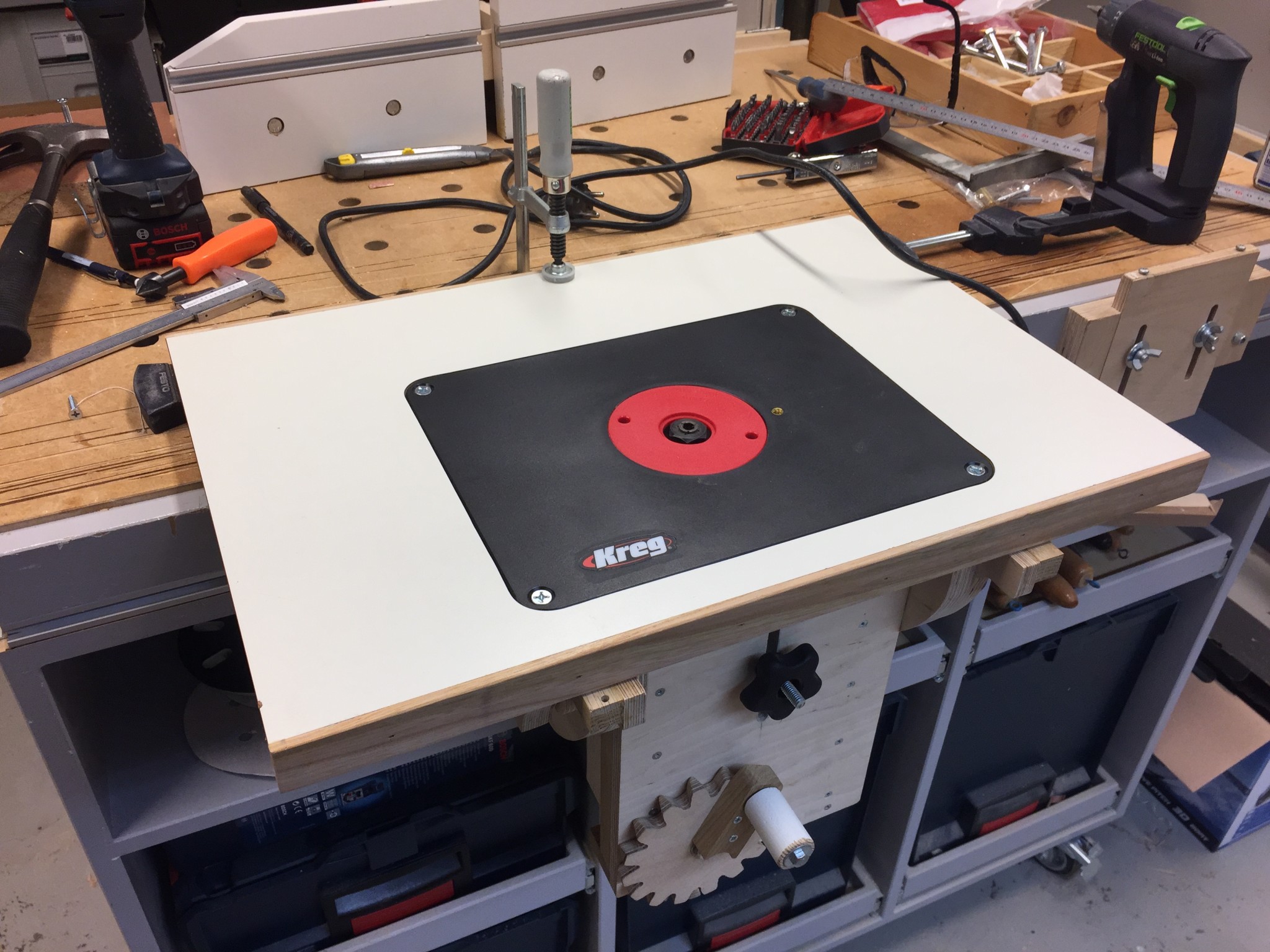 Fått klart montaget av Kregs fräsplatta, tyvärr fattades det några få mm för att kunna montera lyften direkt i plattan så det blev till att sänka ner plattan i skivan och lämna tillräckligt med material för att kunna montera lyften från andra sidan. Nu återstår en längsgående profil som dessvärre hamnar nära kanten (hoppas alla spikar i kantlisten ligger djupt nog) och att hitta på ett sätt att montera anhållet.