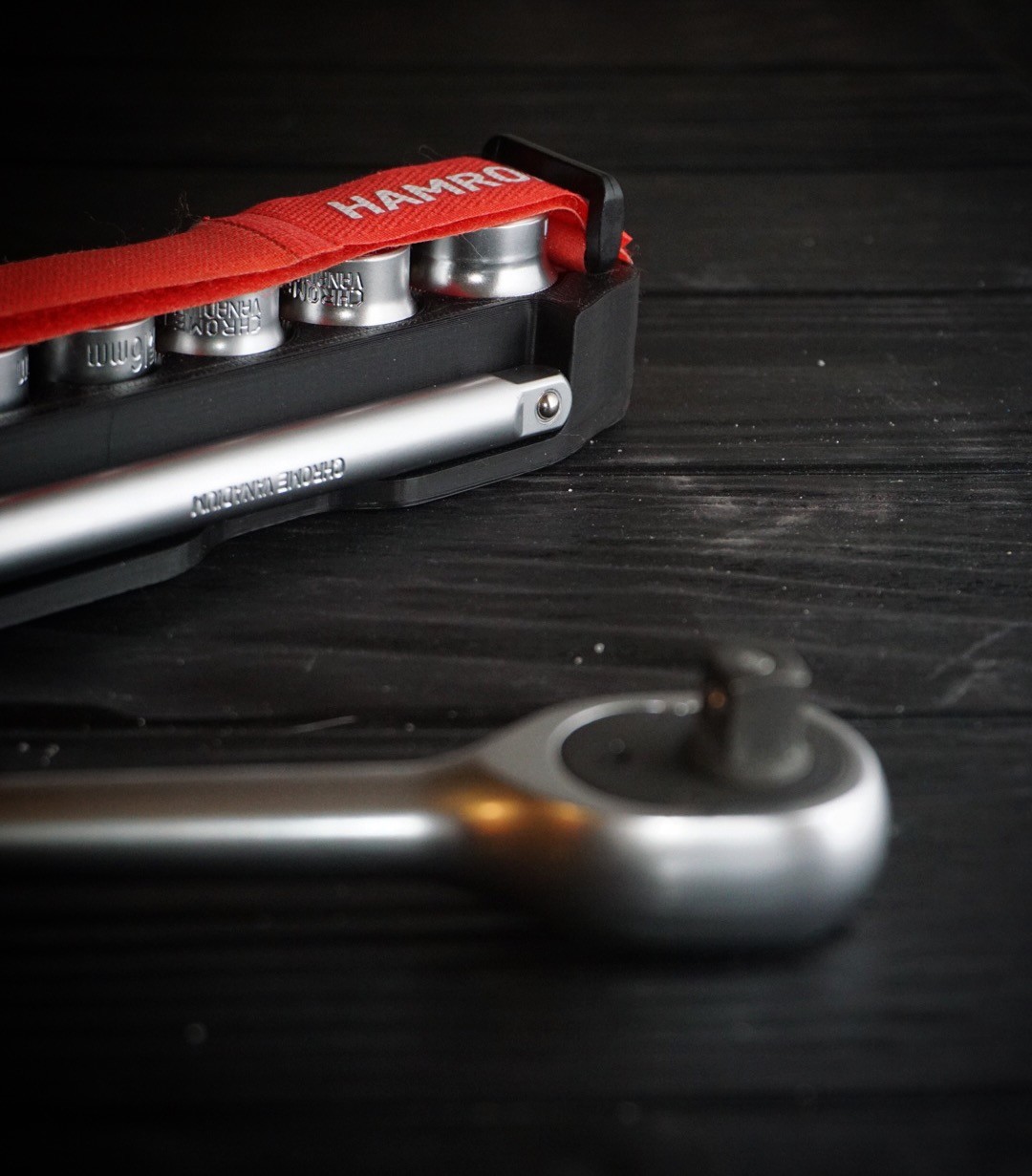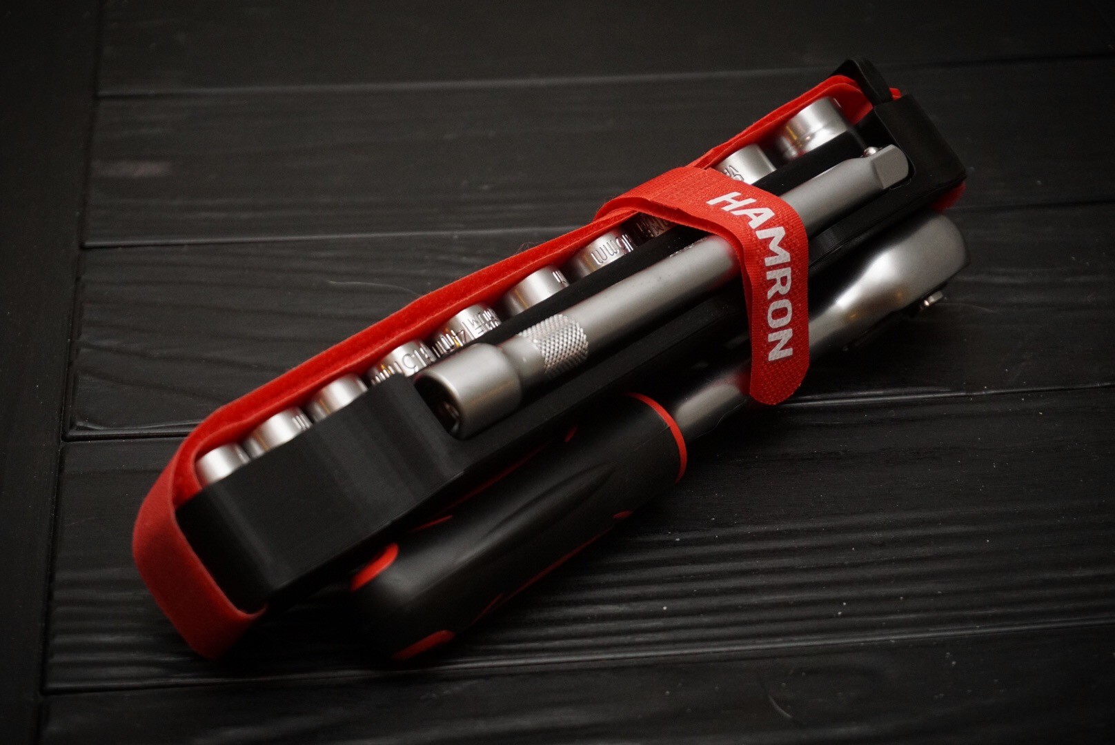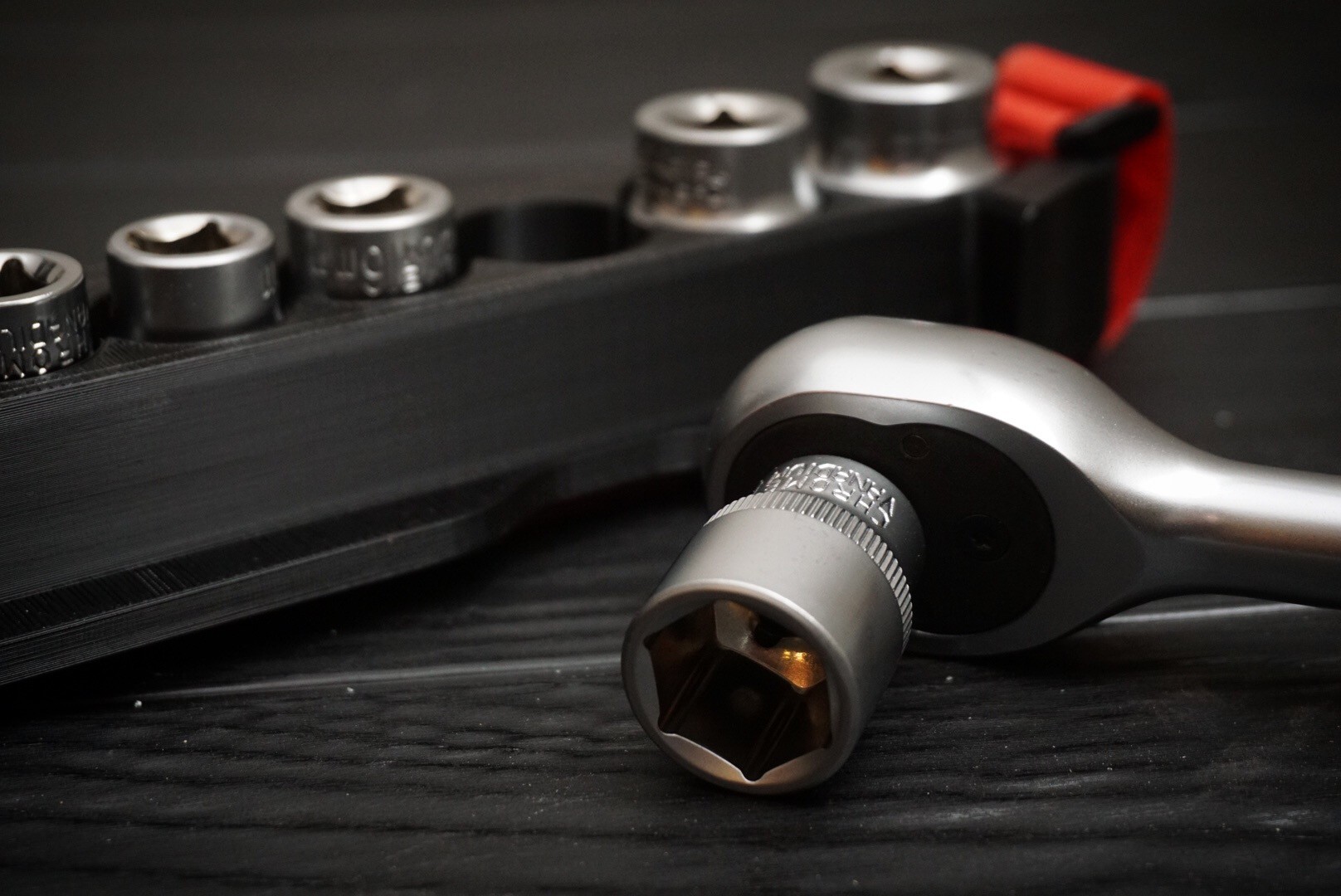 10h utskrift i min 3D skrivare. En universell hylsnyckelhållare med plats för förlängare och spärrskaft. Tänkt att ha i skotern eller ATV eller i bilen. Ja egentligen överallt där plats är viktigt. För denna sats är ganska så kompakt. Också kan man byta hylsa med bara 1 hand. Open source har inte hunnit ladda upp den på thingiverse ännu bara.